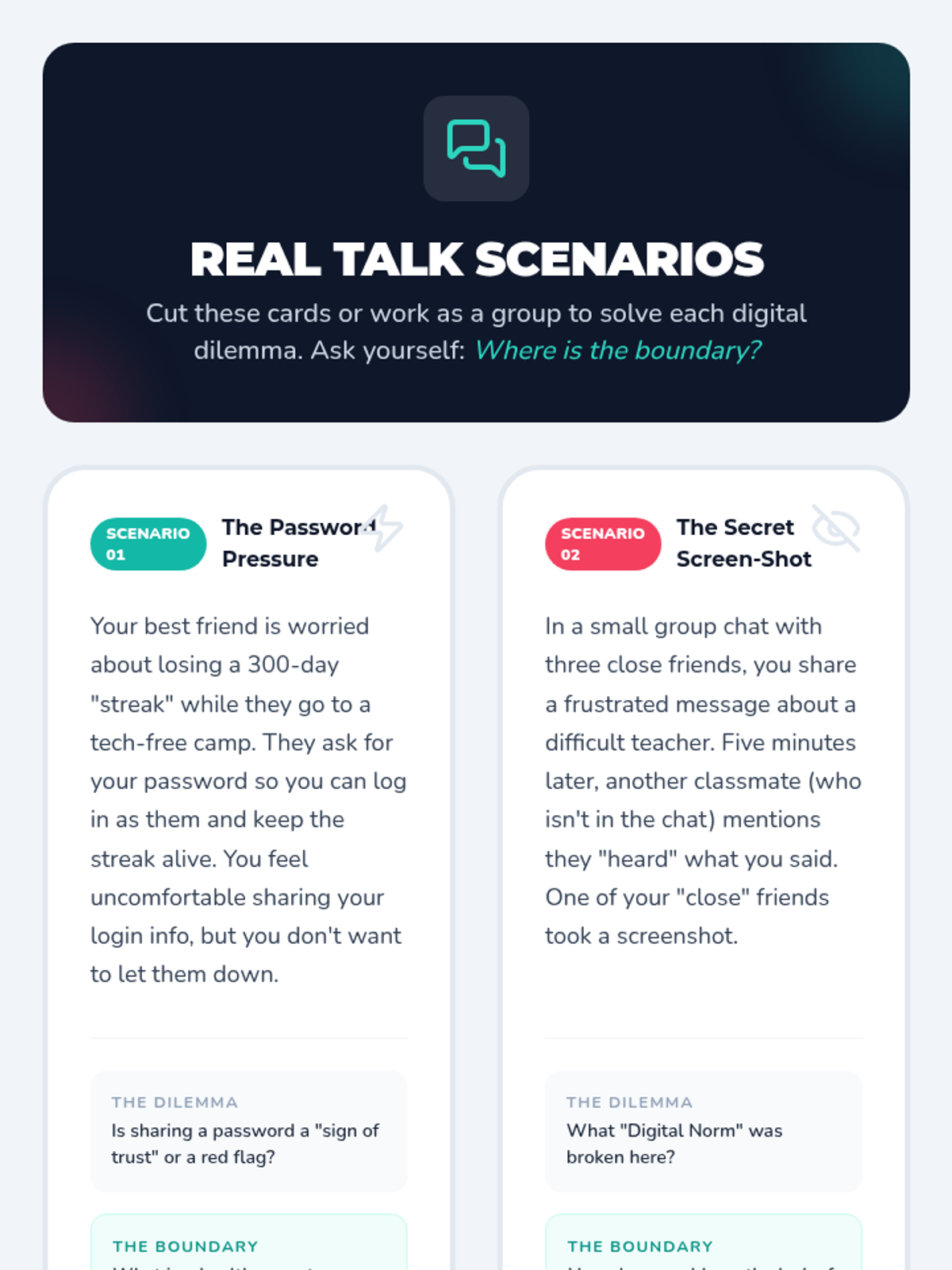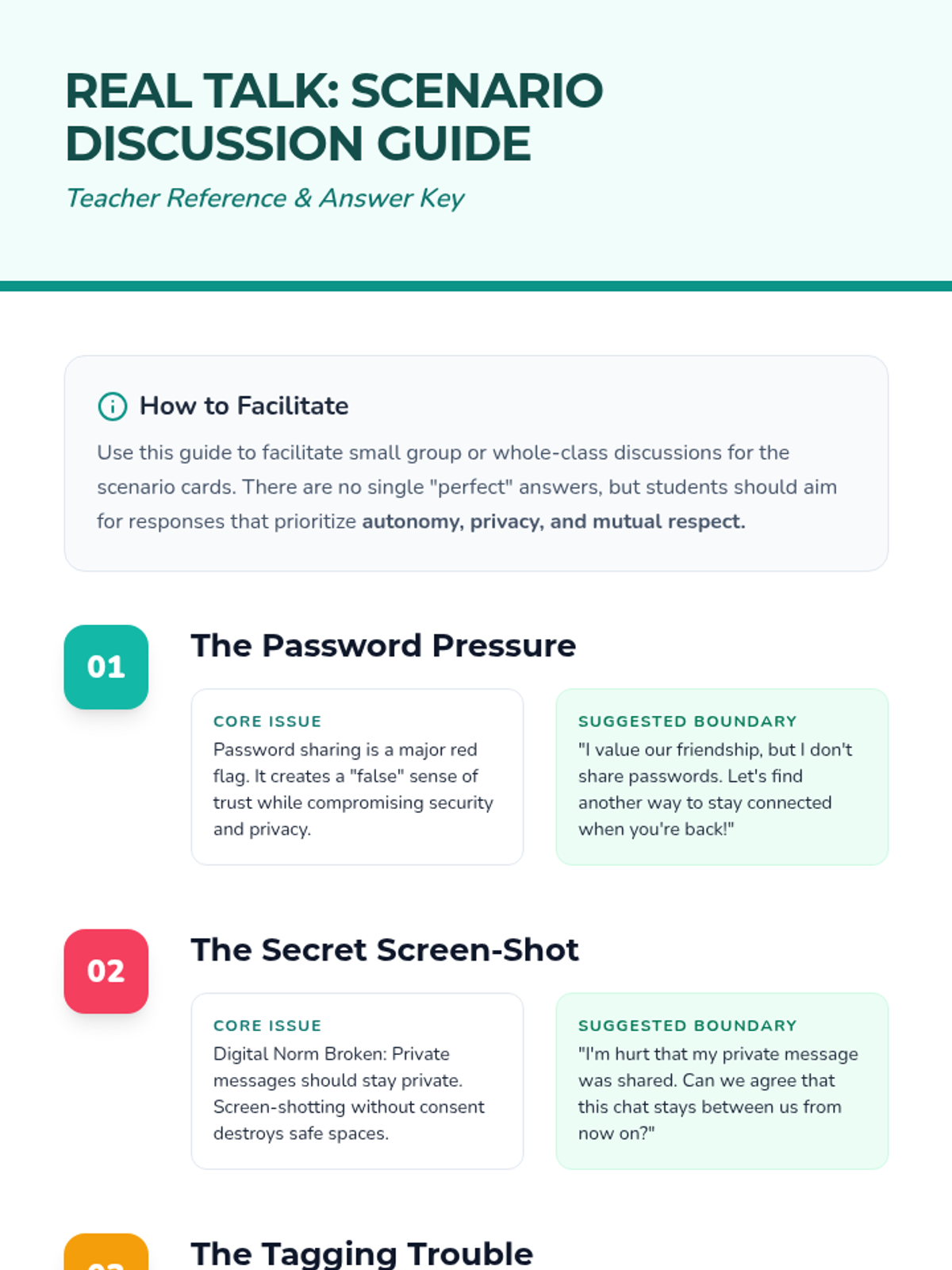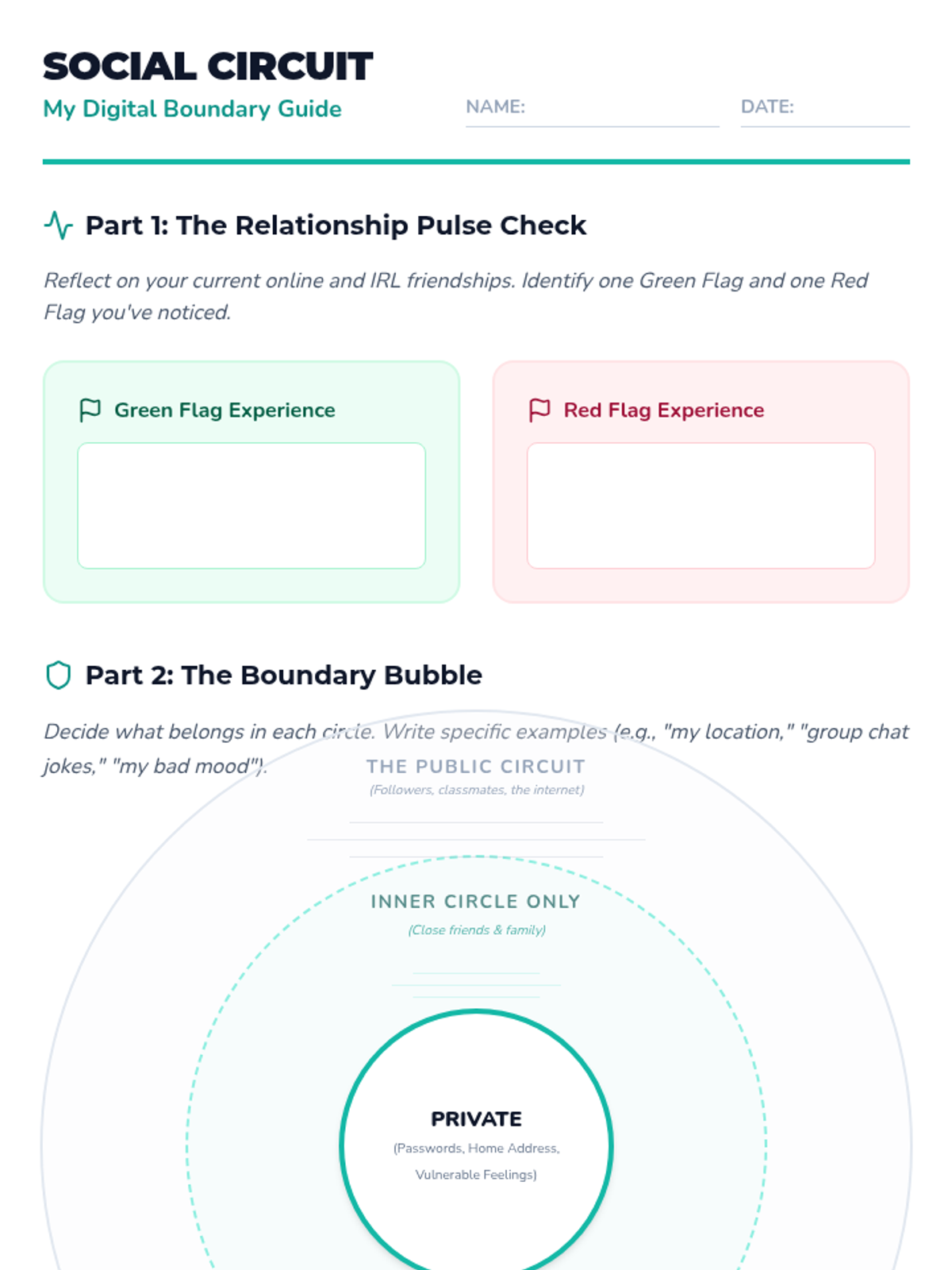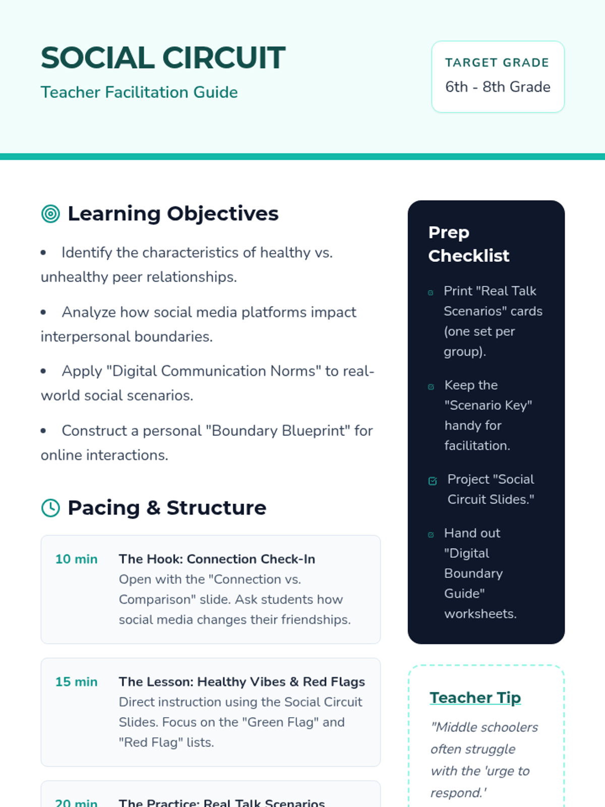 A comprehensive lesson for middle schoolers focused on navigating peer relationships and setting healthy boundaries in digital spaces. Students explore the intersection of social media and real-world connections through scenarios and personal reflection.