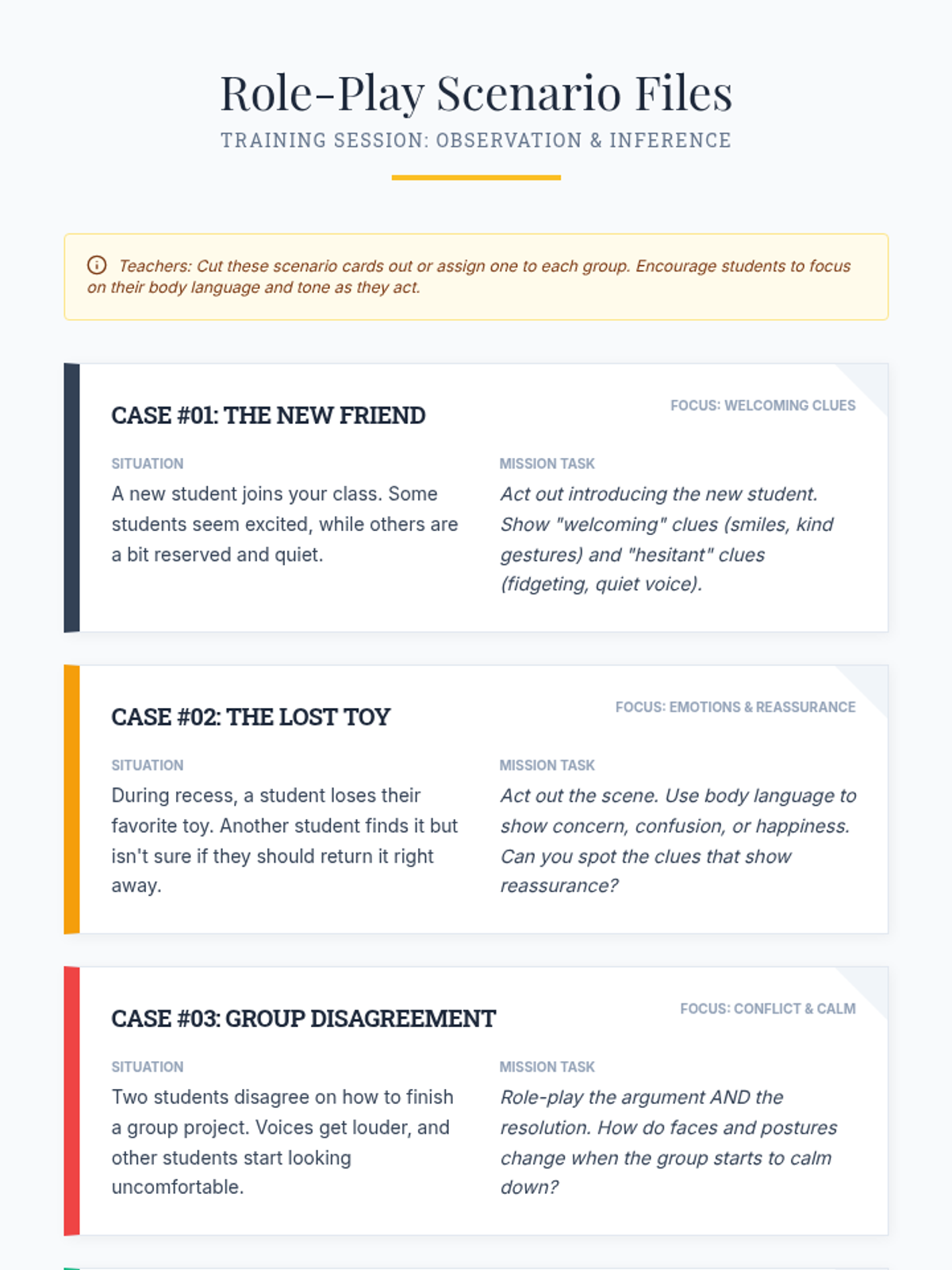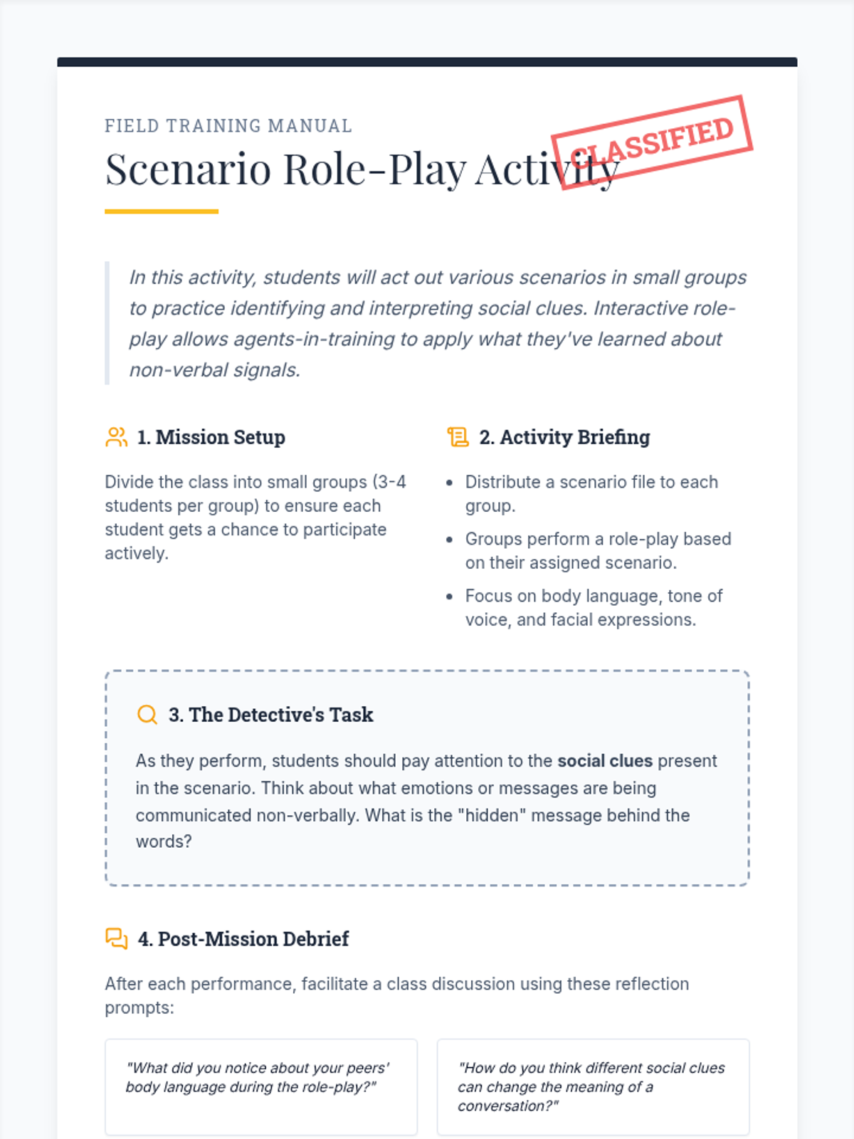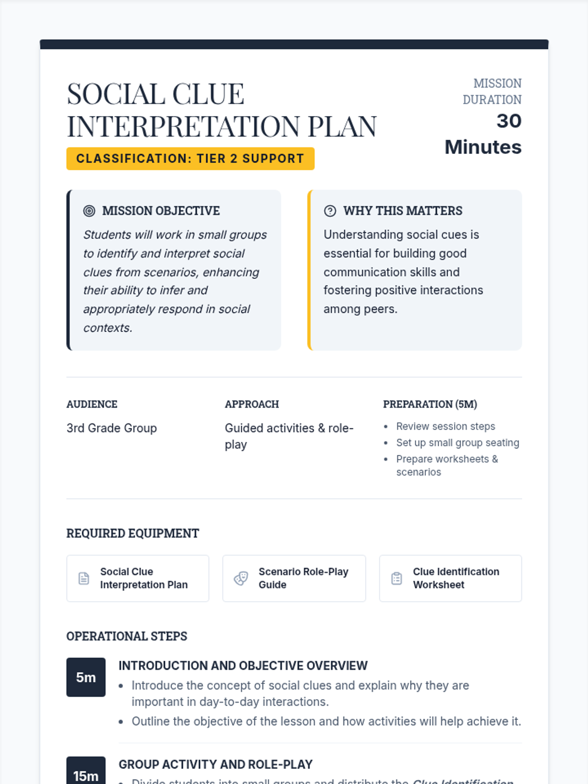 A 30-minute Tier 2 small group lesson for 3rd graders focused on identifying and interpreting social clues like body language, facial expressions, and tone of voice through role-play.