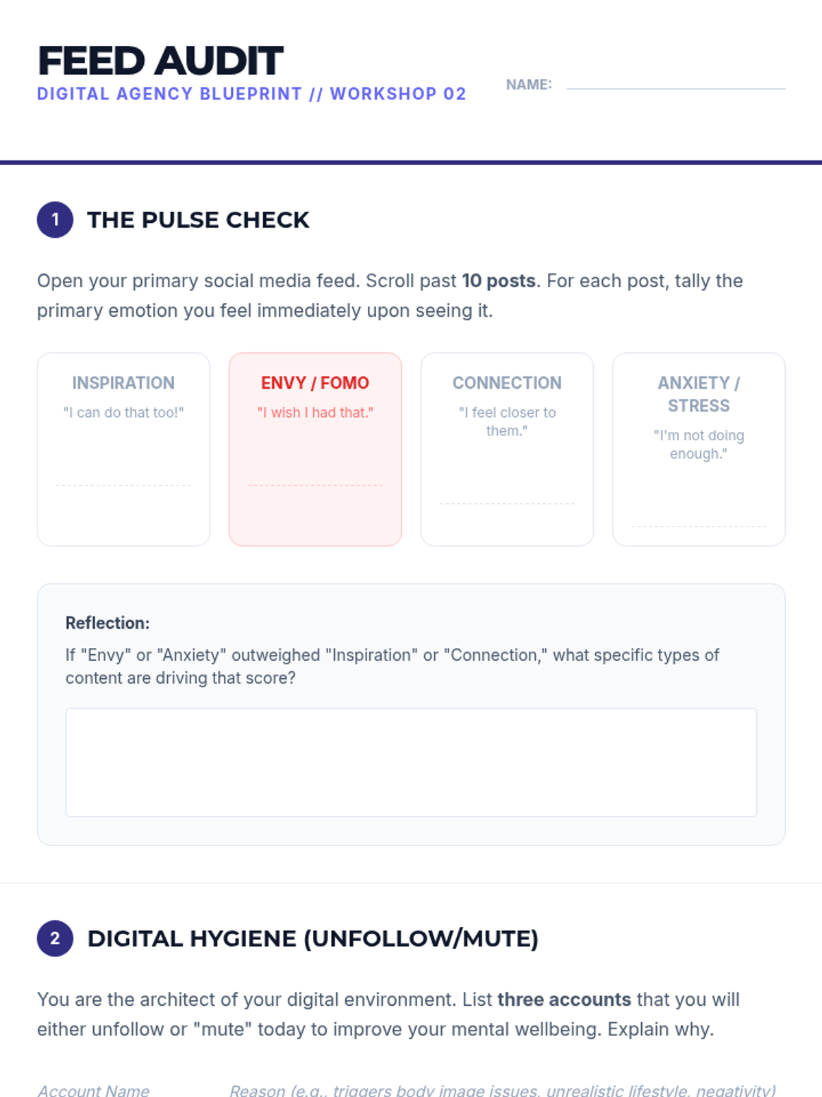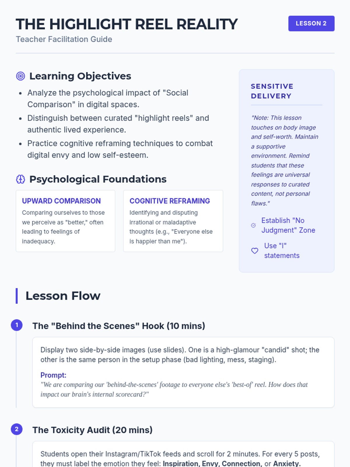This lesson explores the psychological correlation between passive social media consumption and self-worth, focusing on deconstructing the 'highlight reel.'