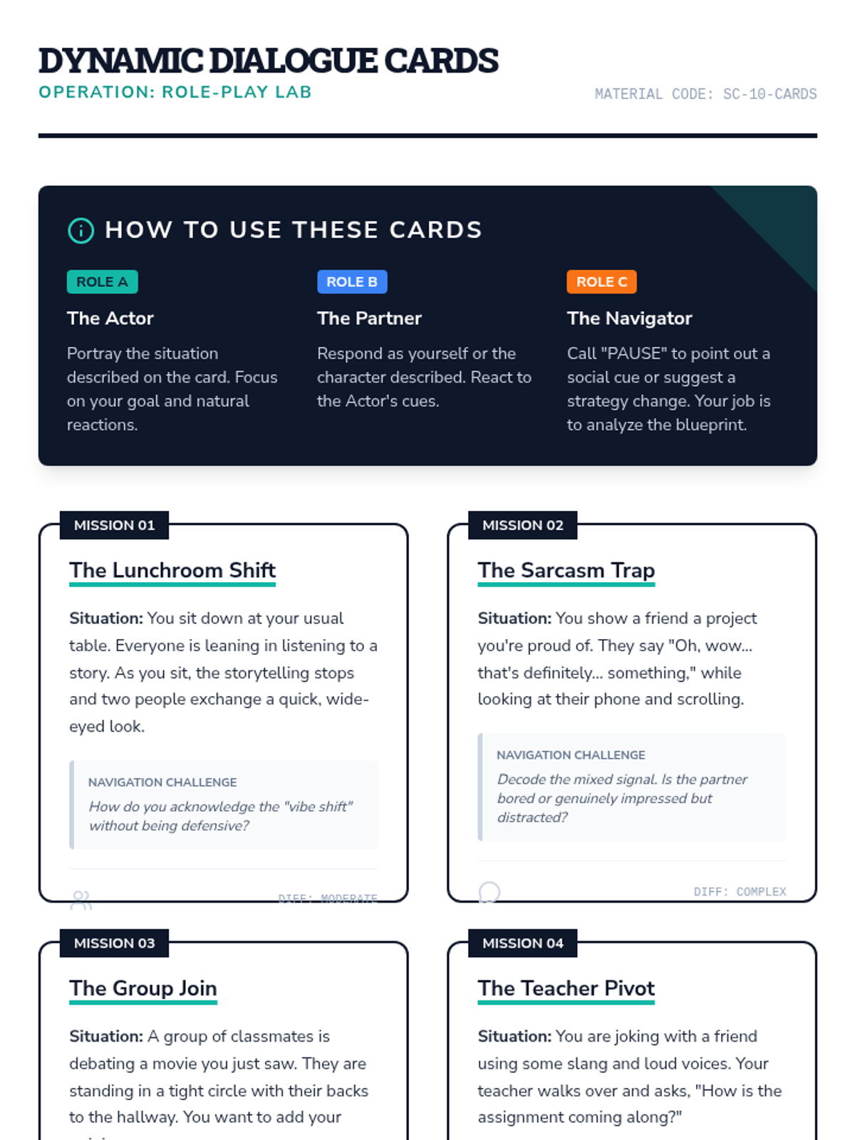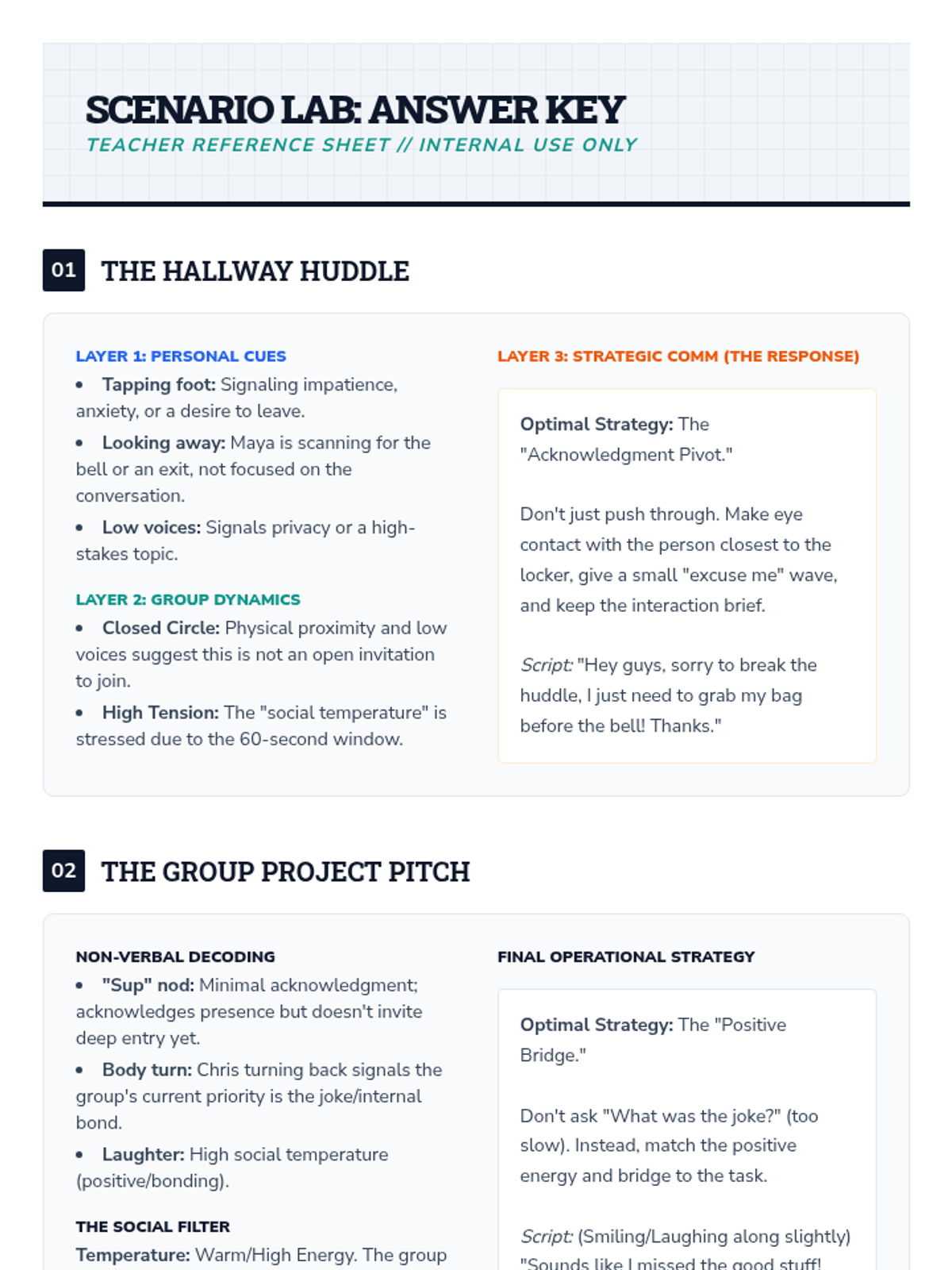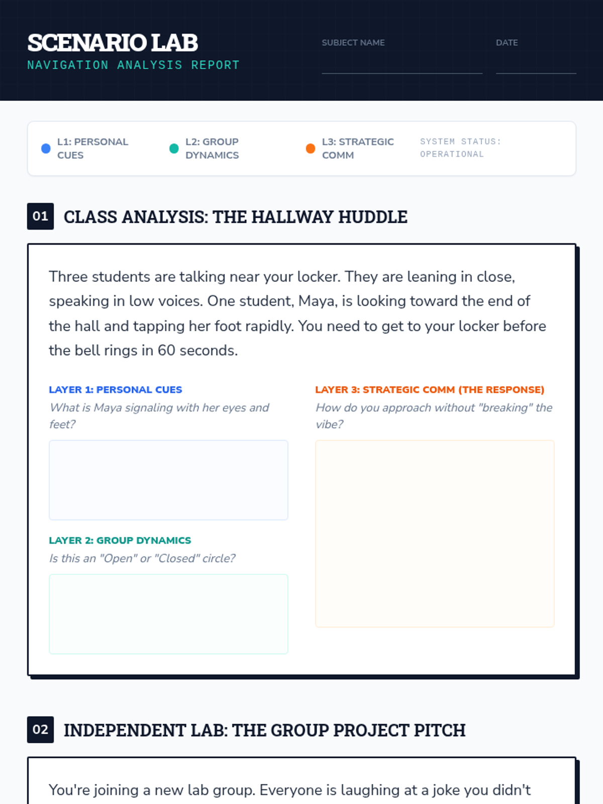 This lesson provides 10th-grade students with explicit instruction on advanced social navigation, focusing on non-verbal cues, social dynamics, and effective communication through a 'Social Blueprint' framework. Students will analyze complex scenarios and practice real-world interactions to build social competence and confidence.