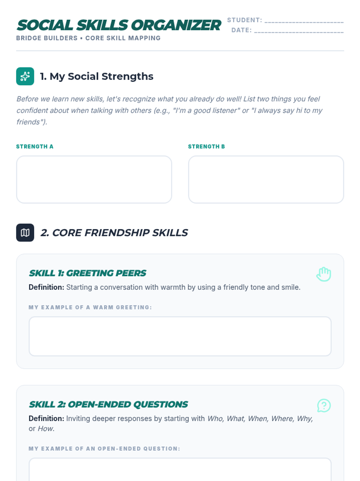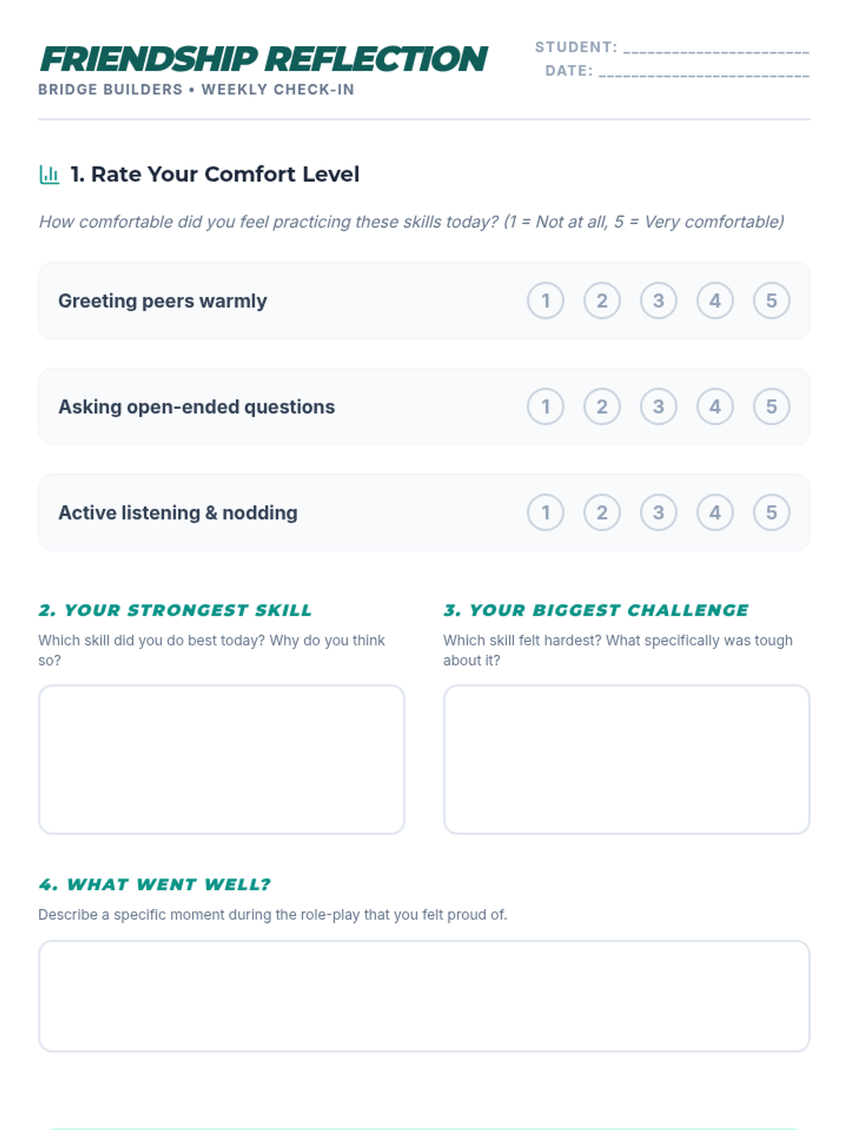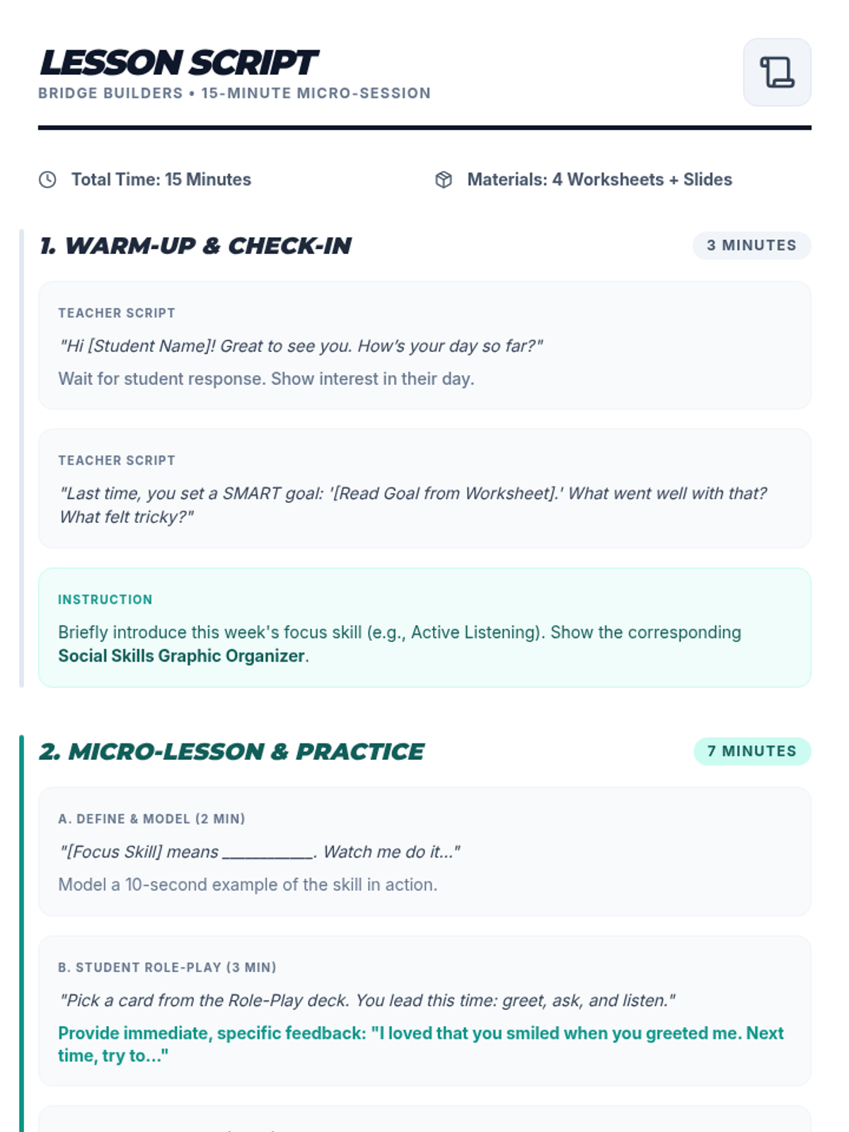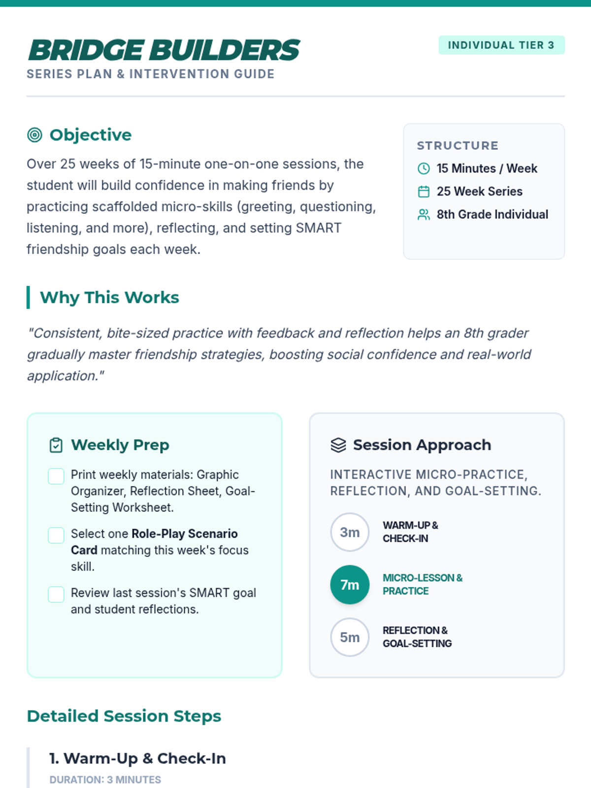 The foundational structure and recurring micro-session framework for the Bridge Builders 25-week social skills intervention.