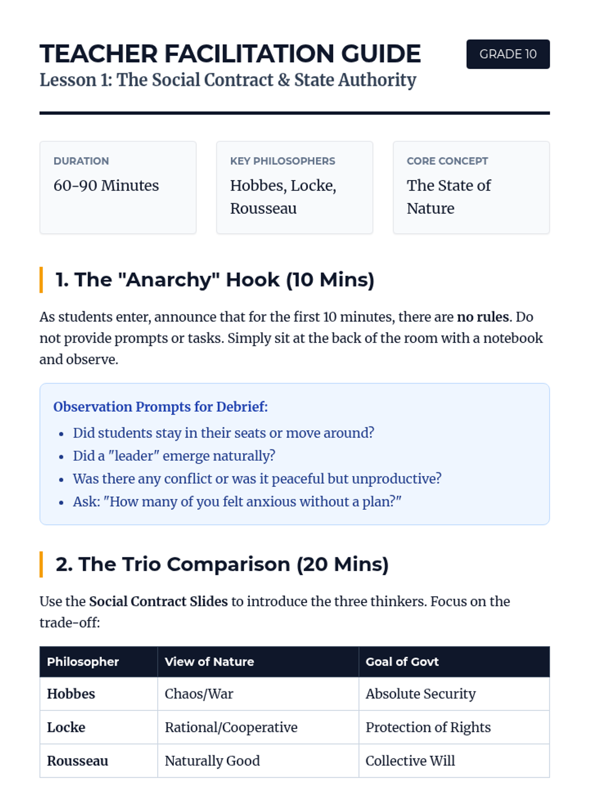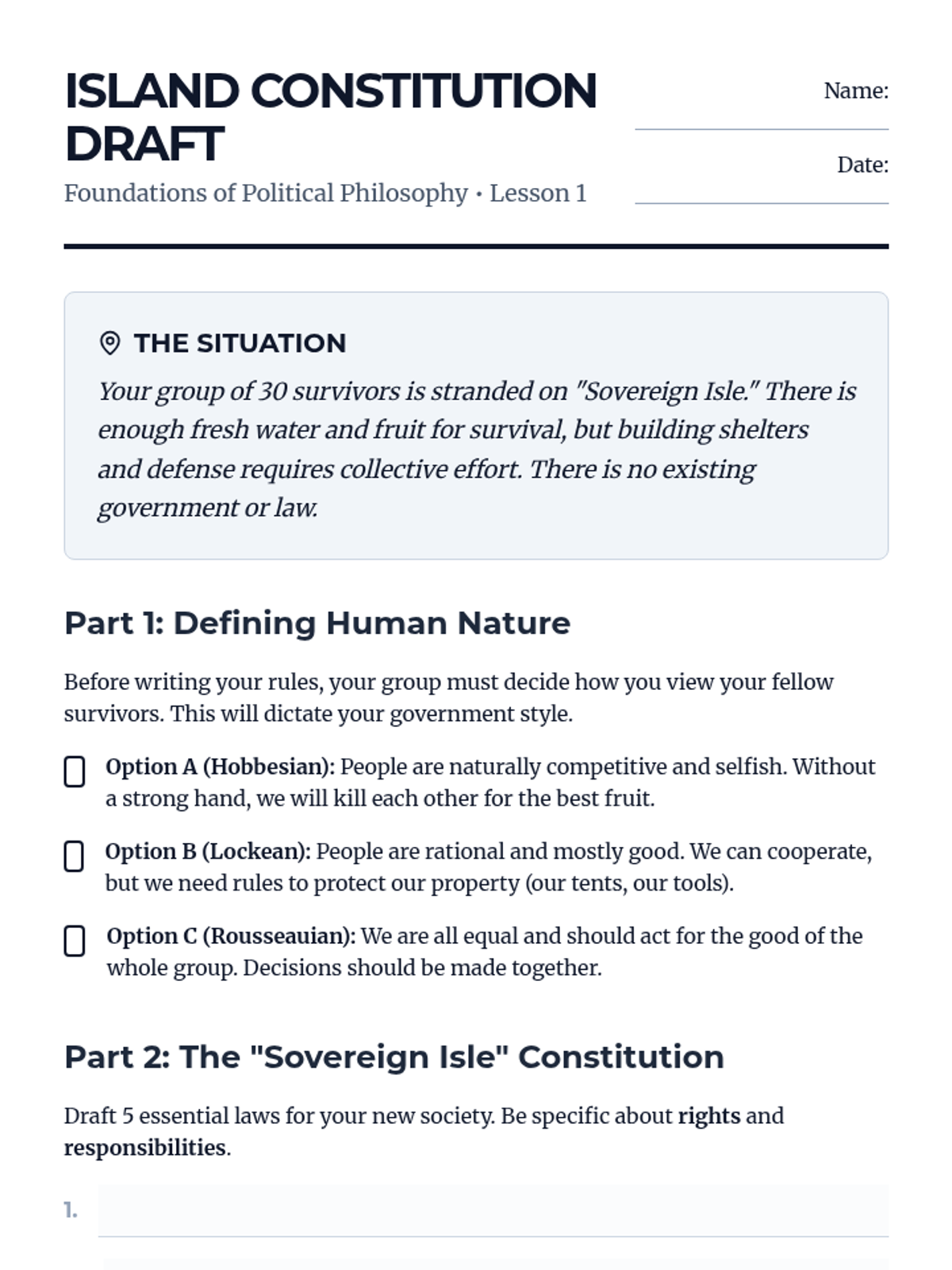 Students compare the perspectives of Hobbes, Locke, and Rousseau regarding human nature and the purpose of government through a 'stranded island' simulation.