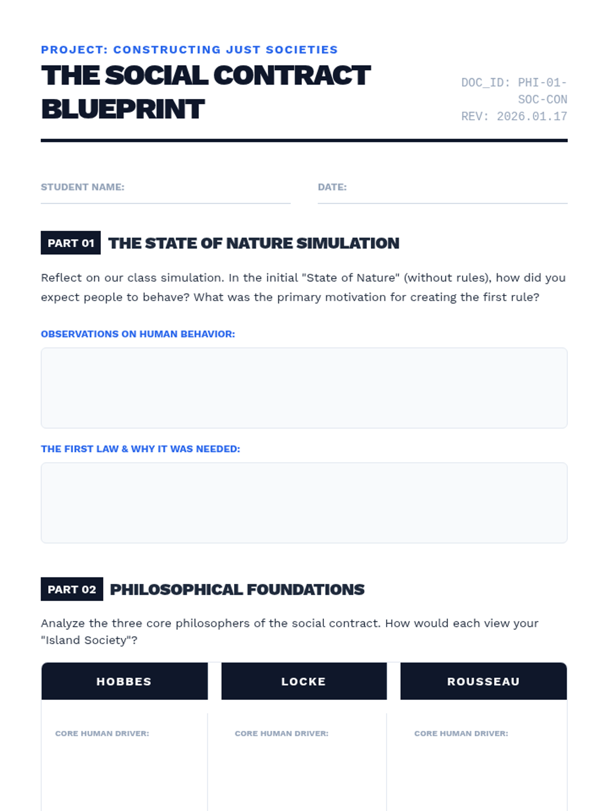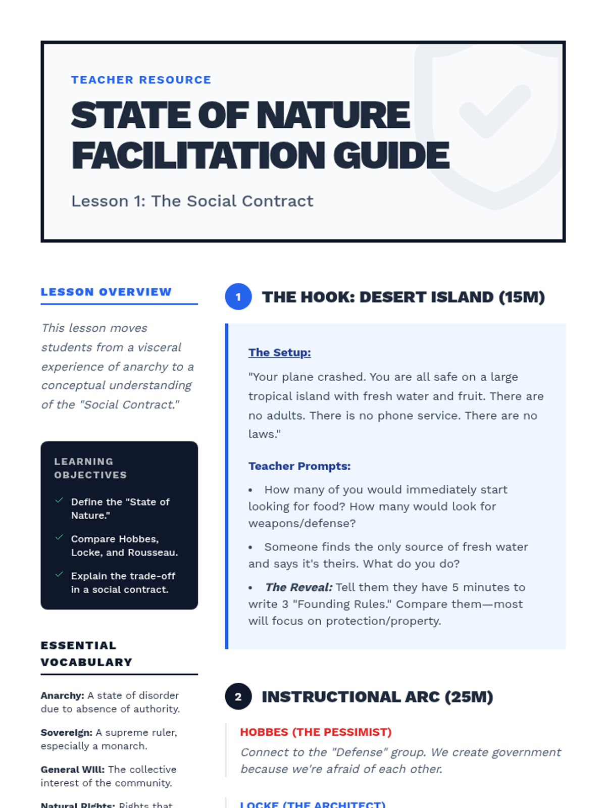 Students contrast the views of Hobbes, Locke, and Rousseau regarding human nature and the purpose of government through a 'desert island' simulation.