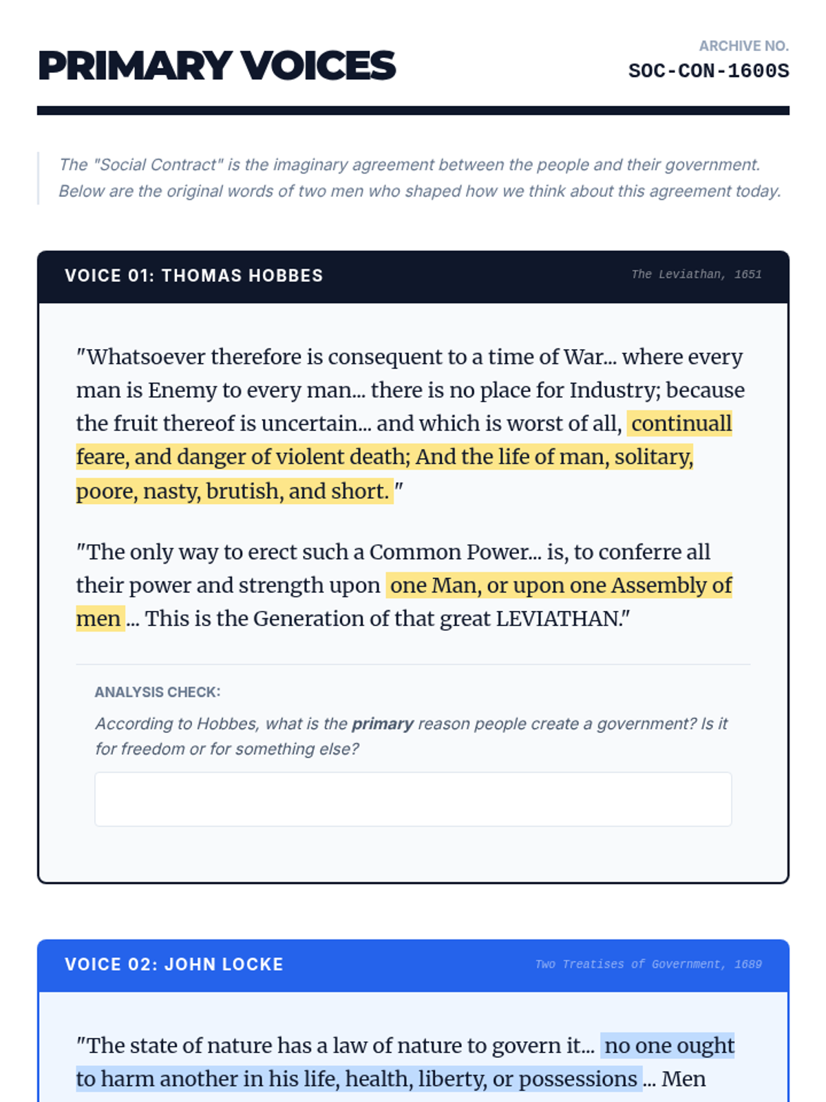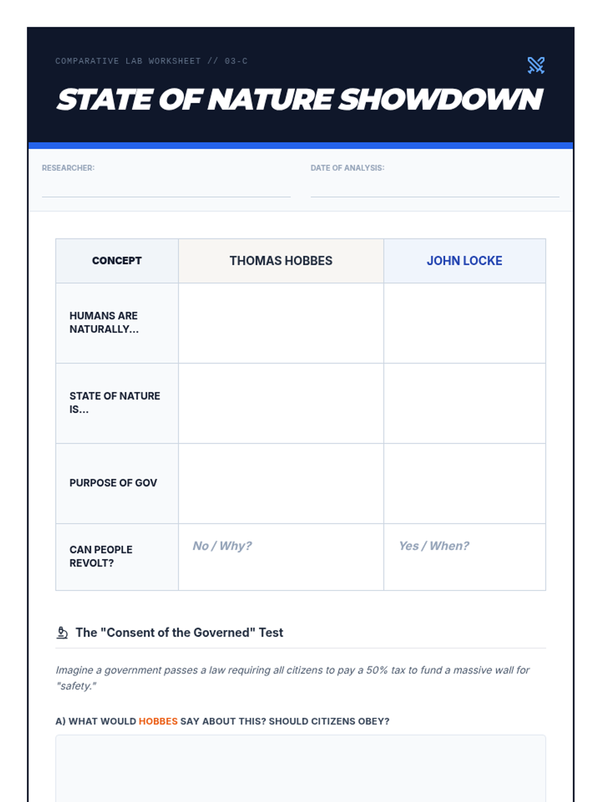 Students compare the foundational political philosophies of Thomas Hobbes and John Locke, analyzing their differing views on the 'state of nature' and the resulting social contract.