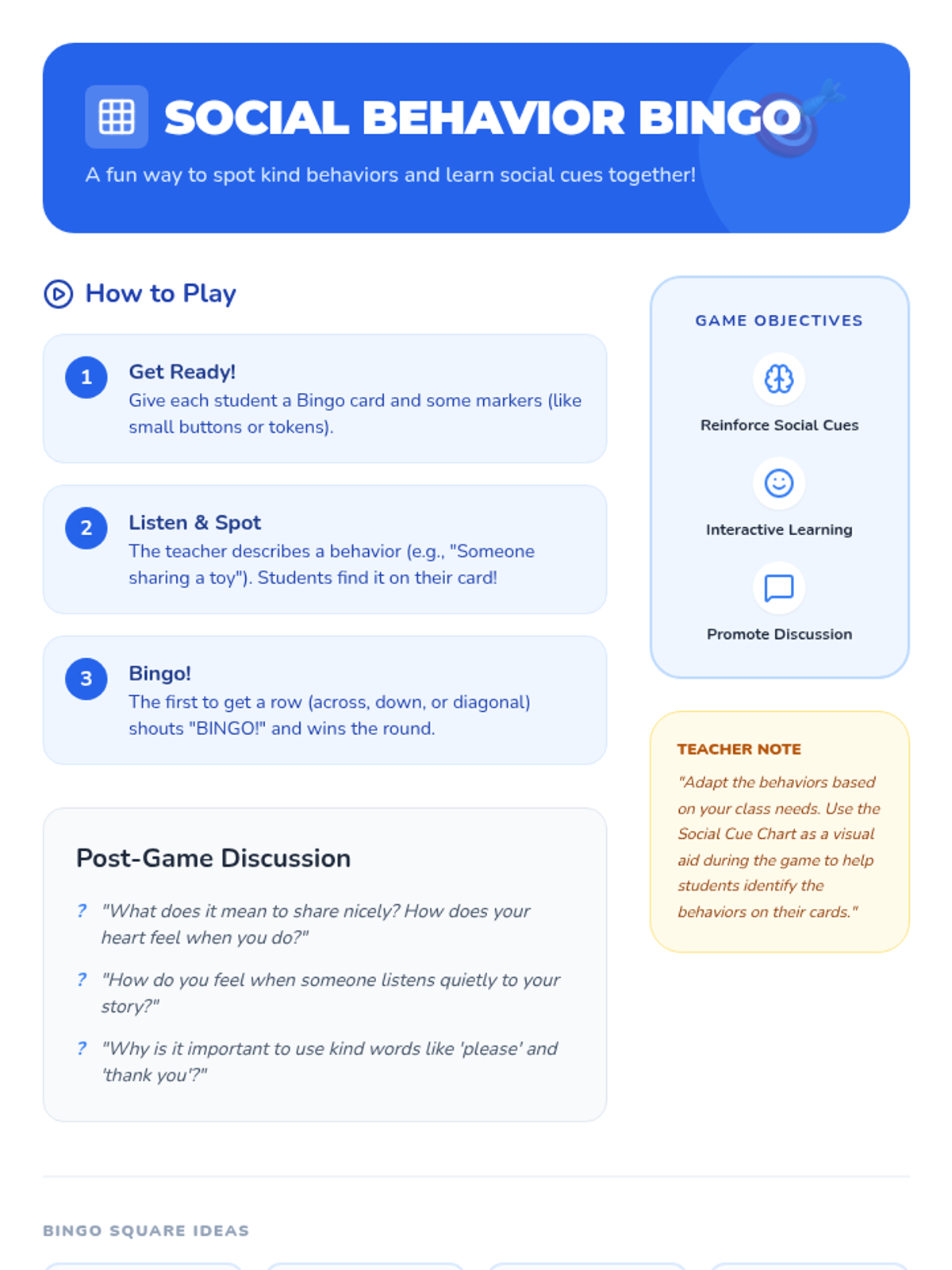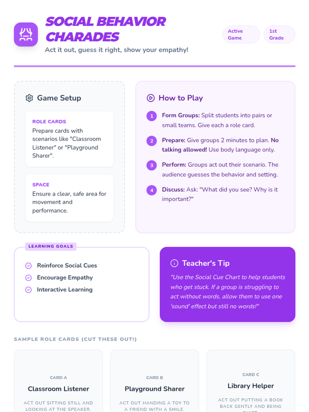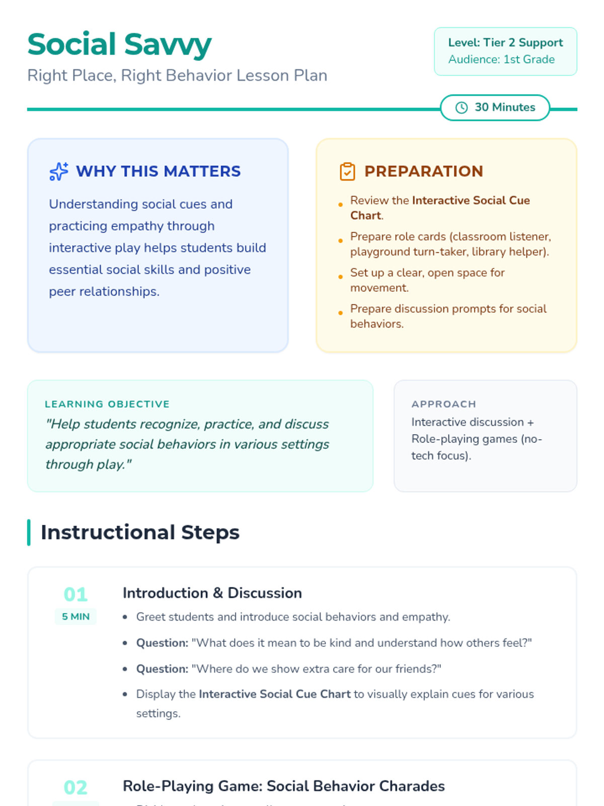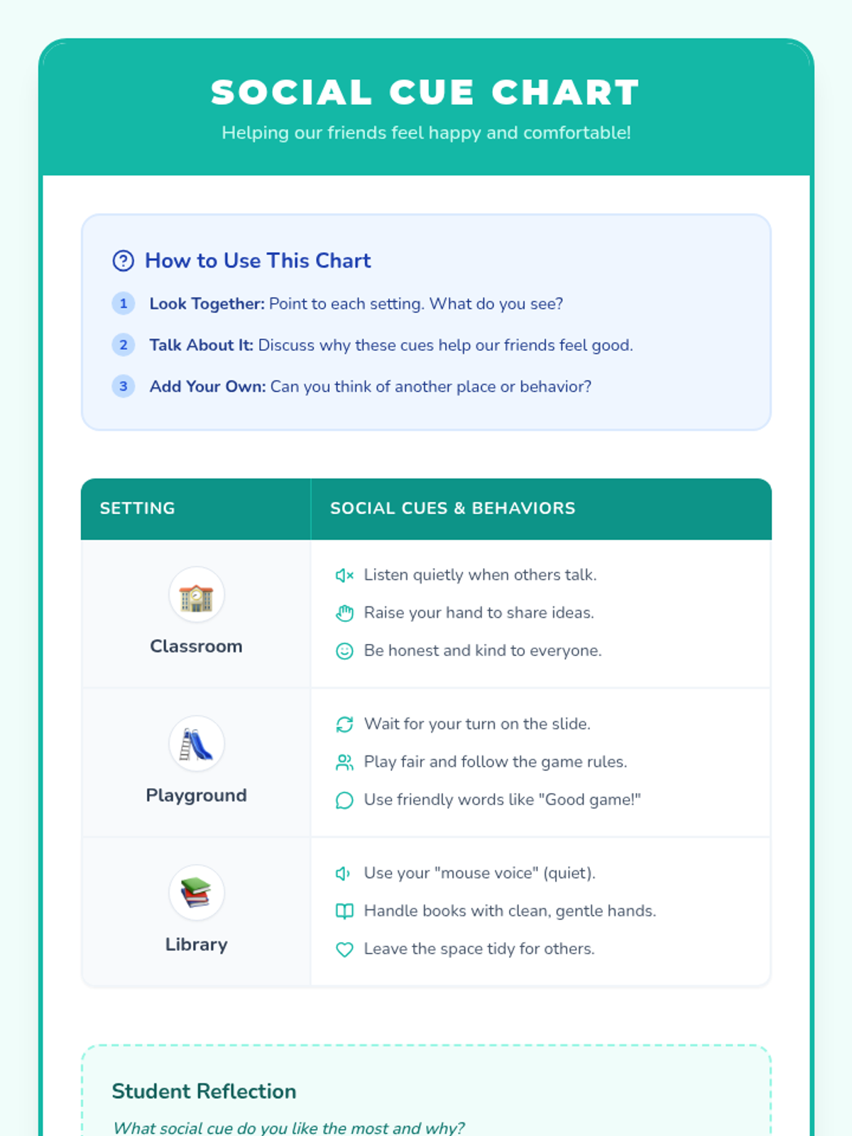 Students explore social cues and appropriate behaviors across different environments like the classroom, playground, and library through interactive charts and role-playing games.