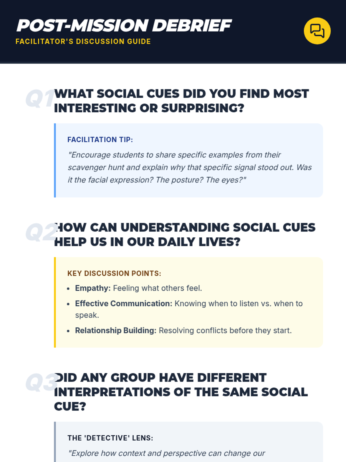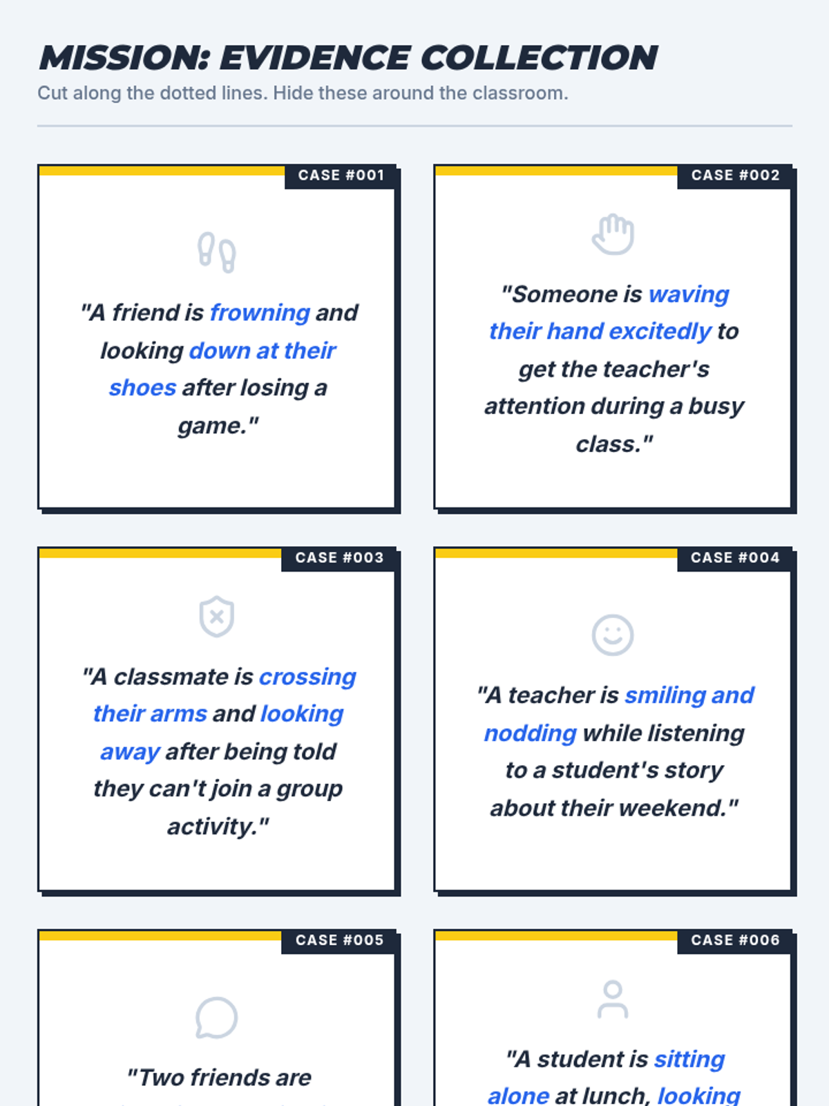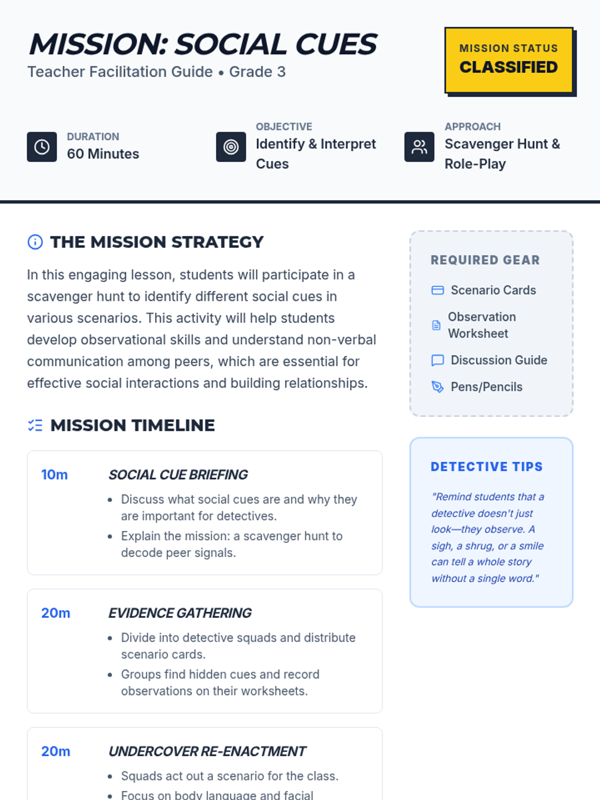 An interactive lesson where 3rd-grade 'Social Detectives' identify and interpret non-verbal communication through a scavenger hunt and role-playing.
