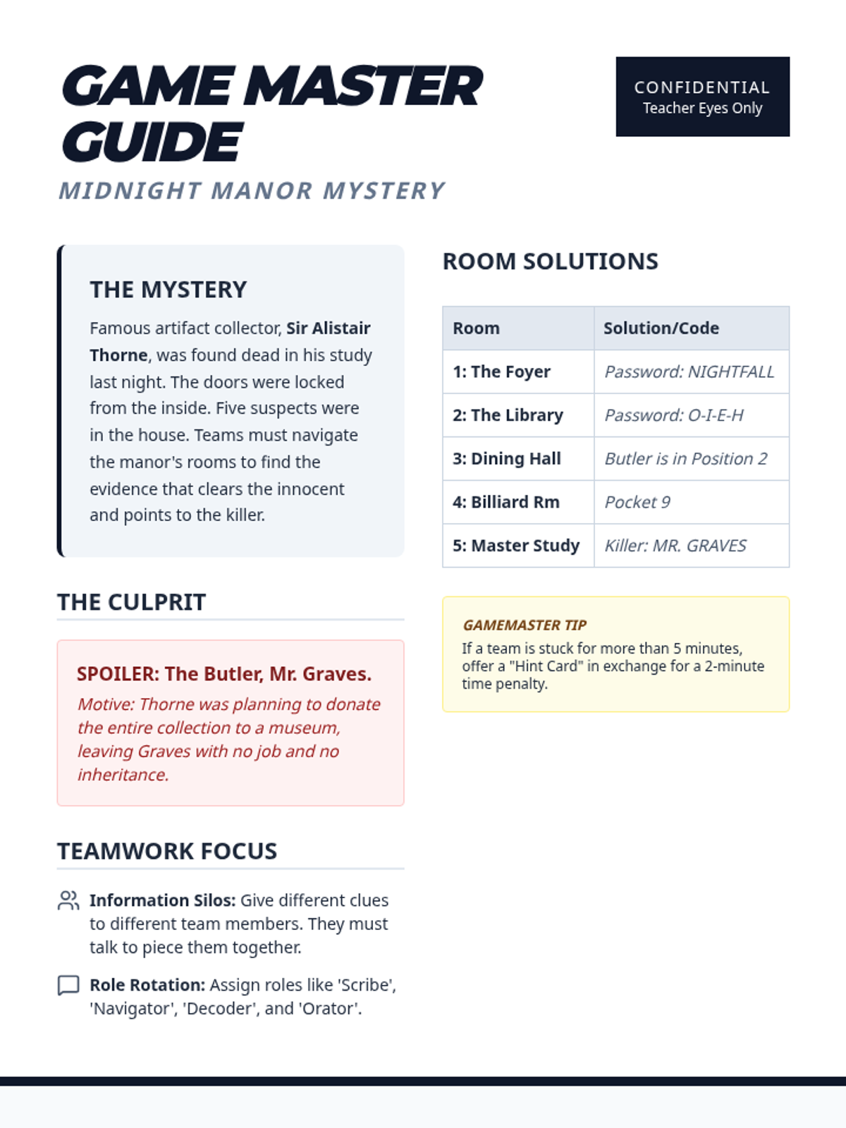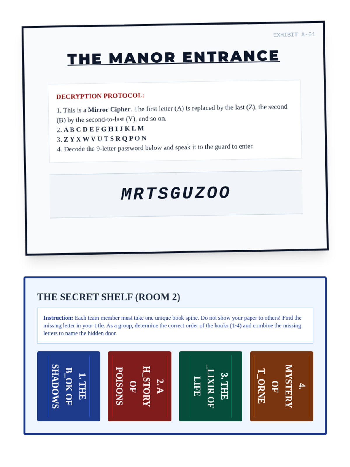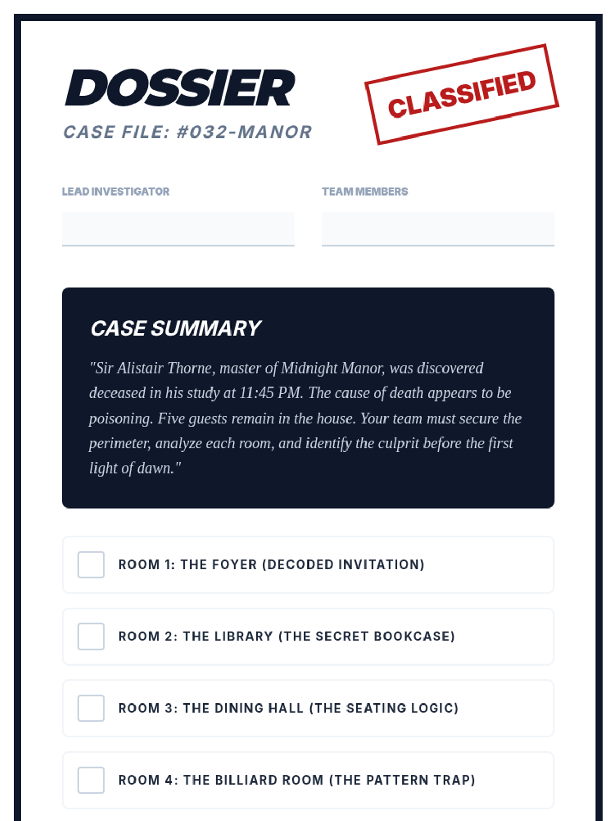 A high-stakes collaborative escape room where student teams navigate five distinct rooms of a mysterious manor, solving interconnected puzzles to solve a murder.