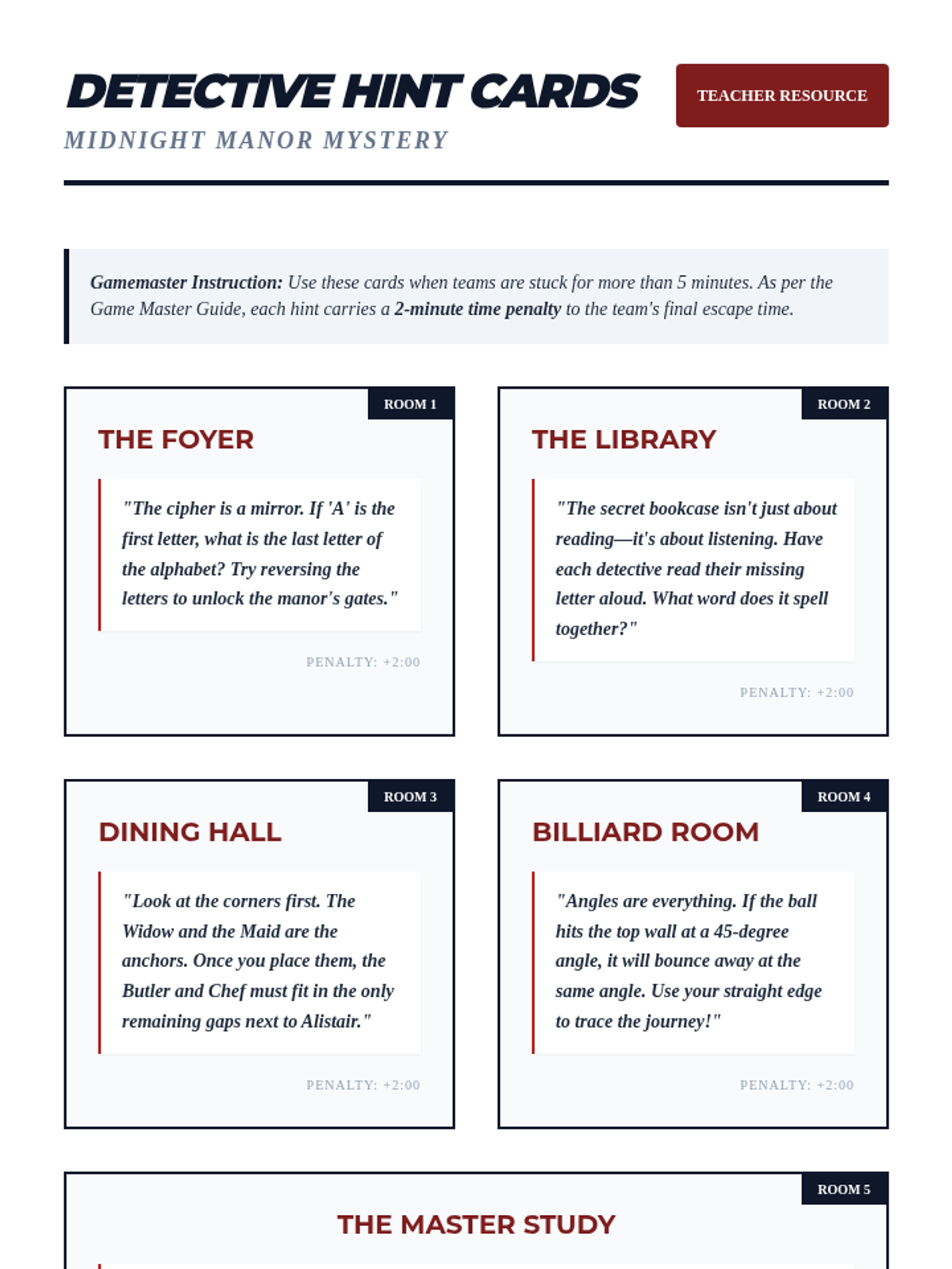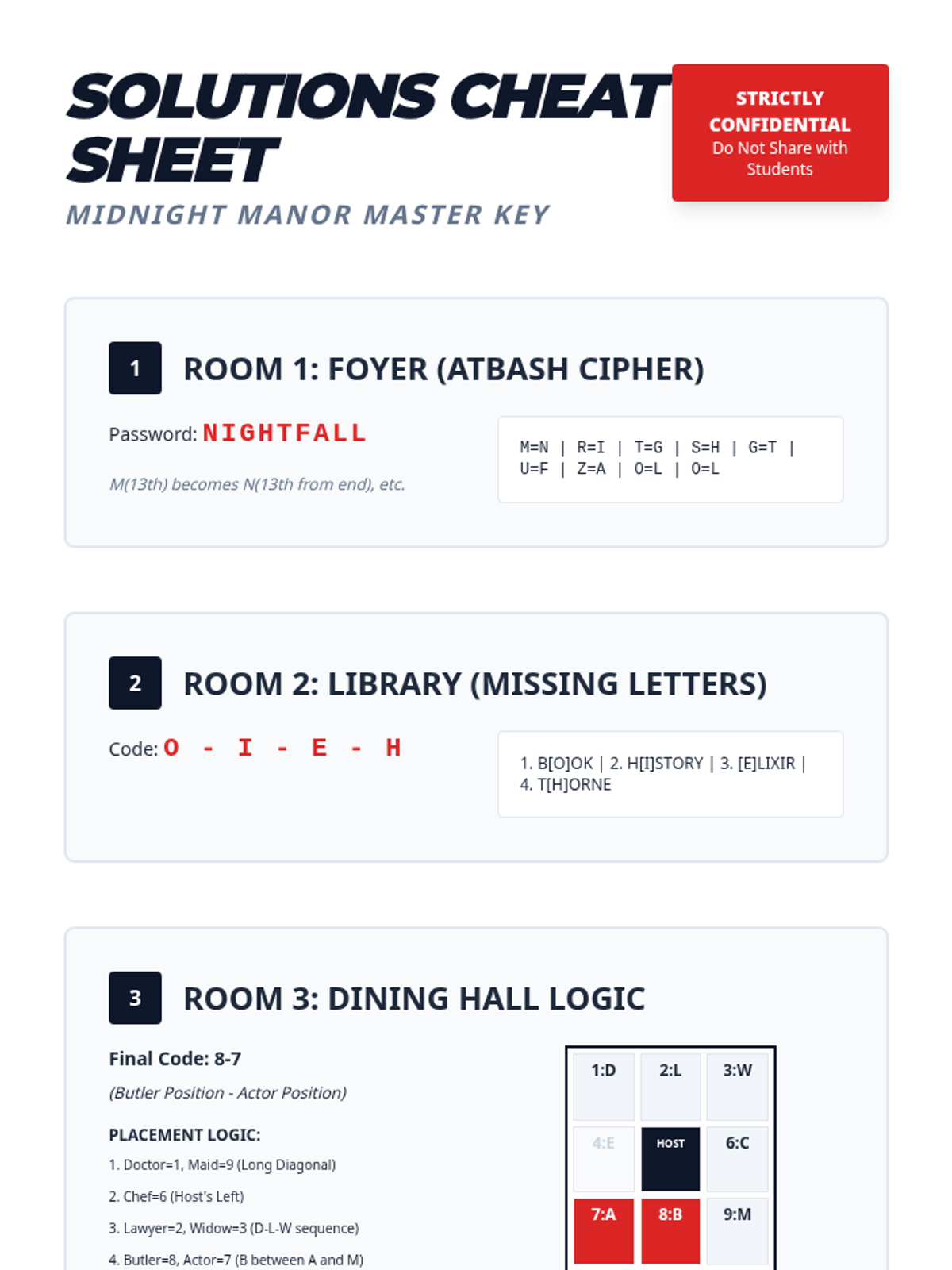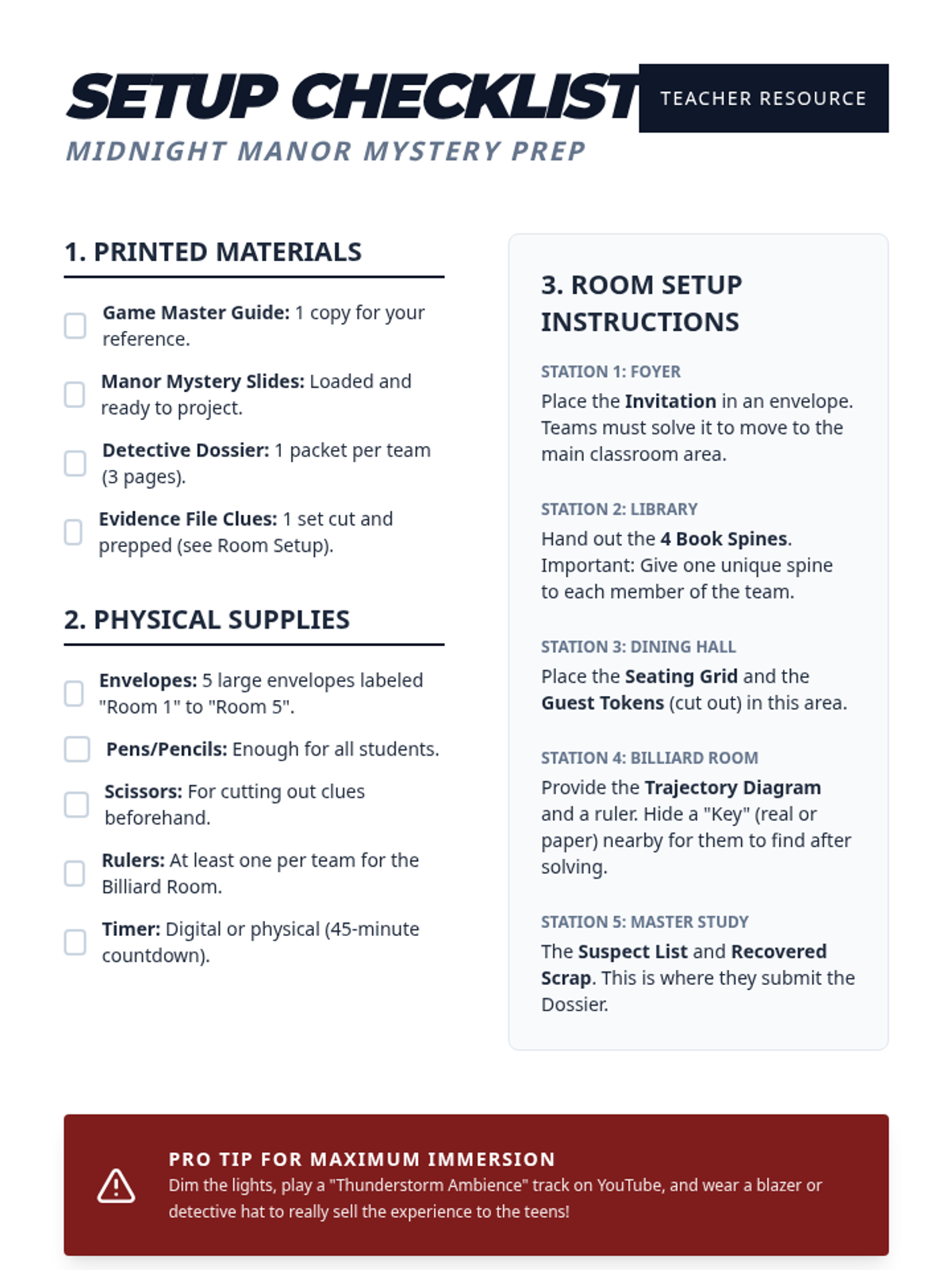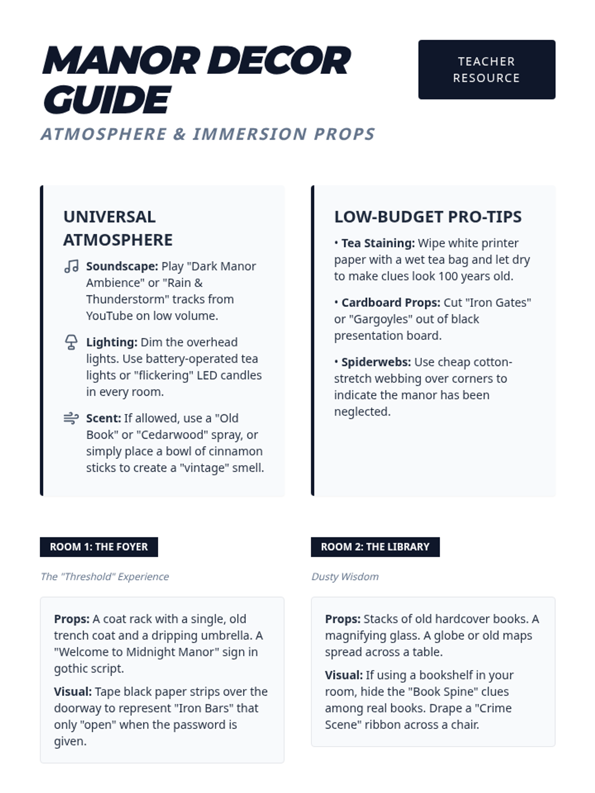 A high-stakes collaborative escape room where student teams navigate five distinct rooms of a mysterious manor, solving interconnected puzzles to solve a murder.
