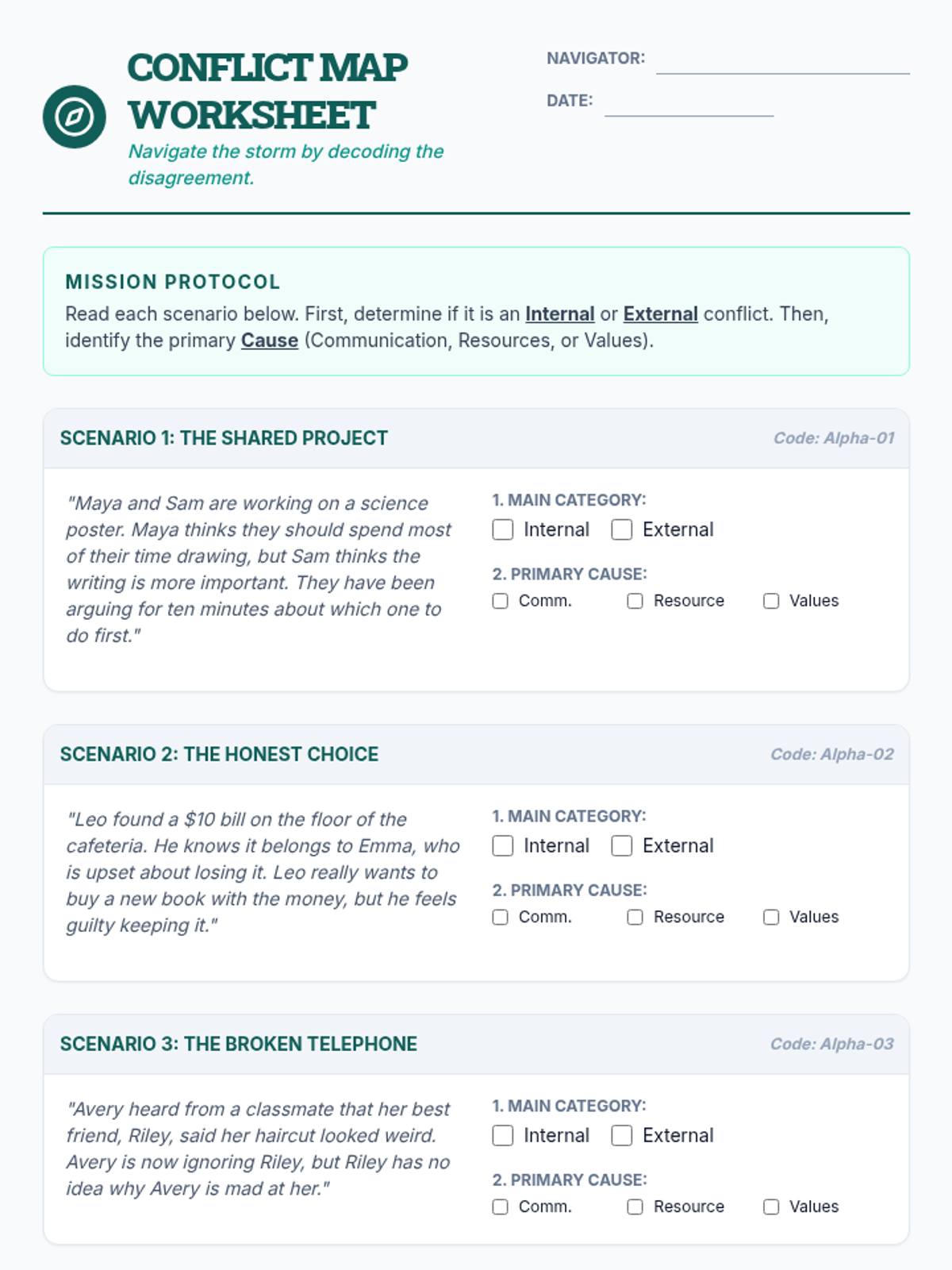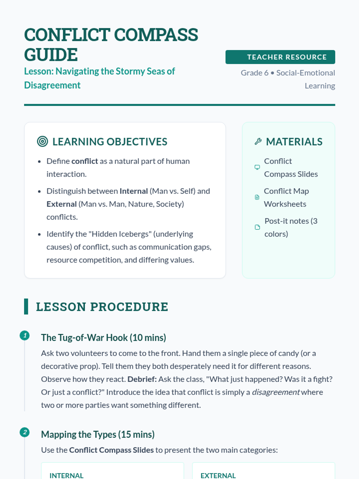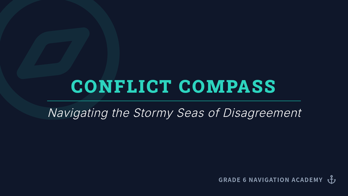 A comprehensive introduction to conflict for 6th graders, focusing on identifying internal and external types and analyzing the underlying causes of disagreements. Students will use a nautical 'Conflict Compass' theme to navigate interpersonal and personal challenges.