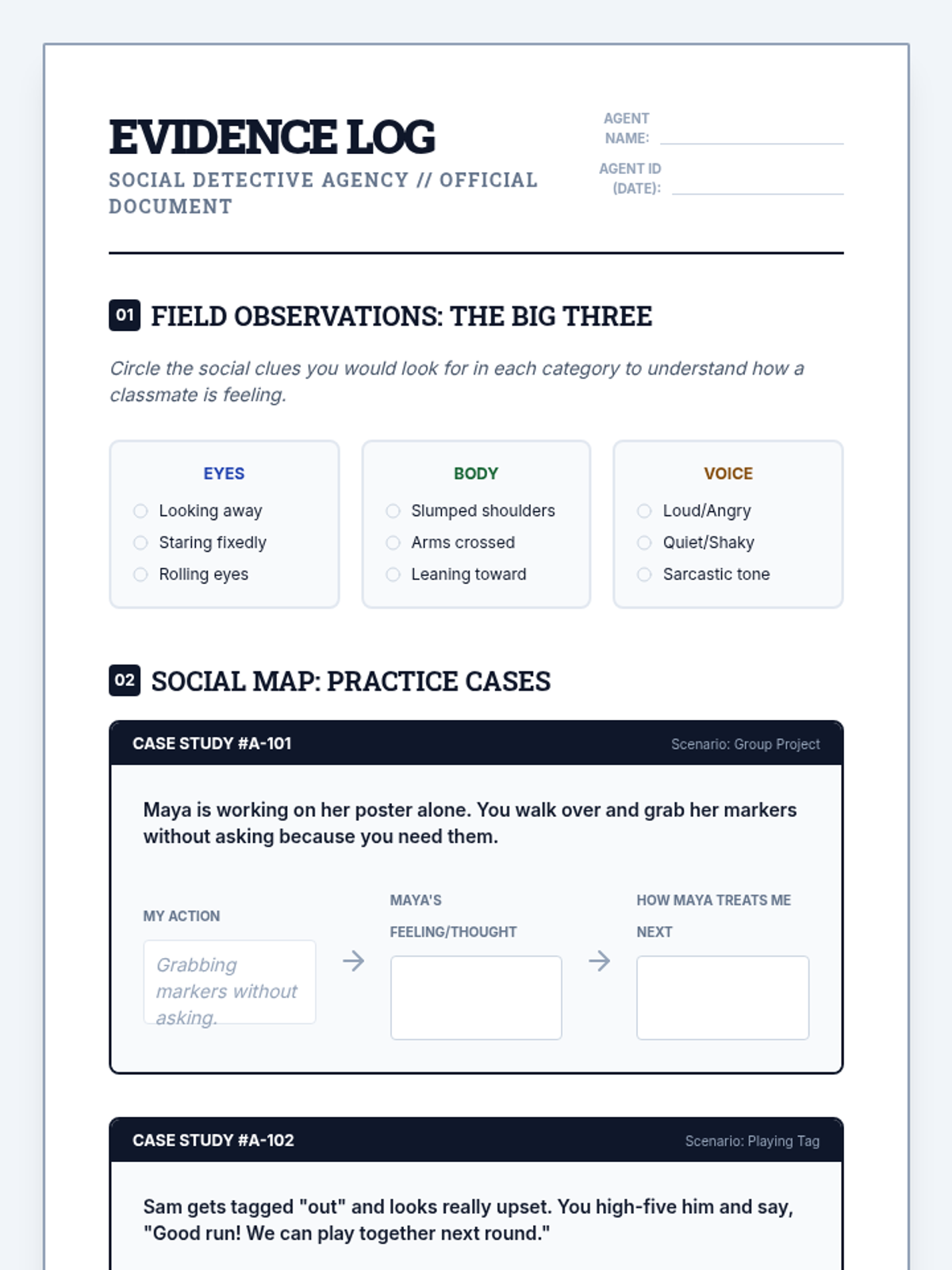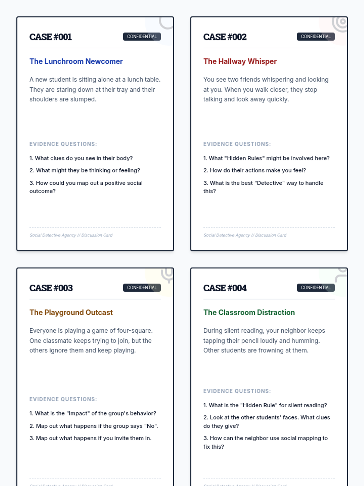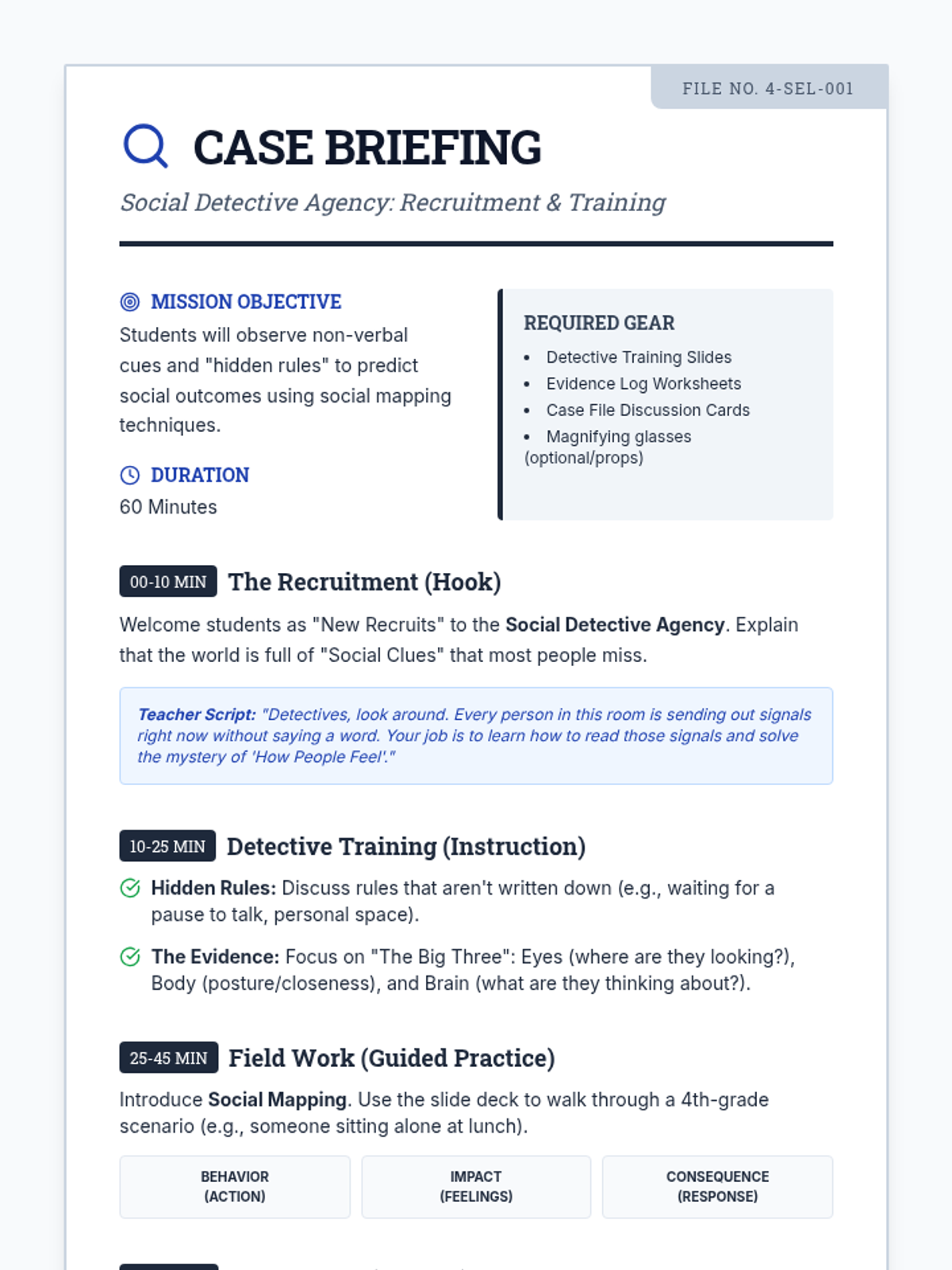 In this lesson, students become 'Social Detectives' to investigate non-verbal cues and hidden social rules. They will learn to use social mapping to predict how their behavior impacts the feelings and actions of those around them in 4th-grade scenarios.
