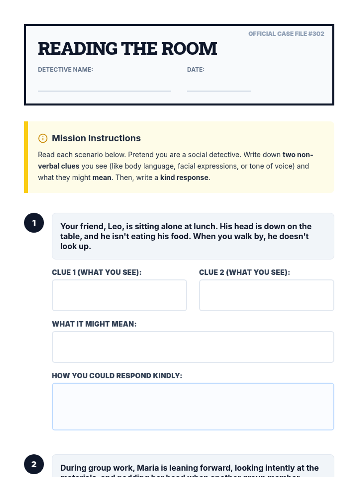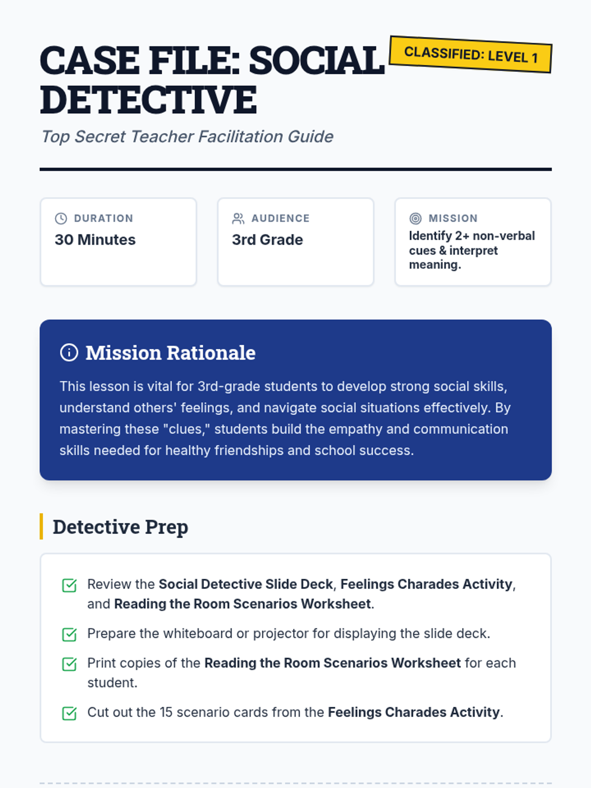 A 30-minute lesson for 3rd-grade students focused on identifying and interpreting non-verbal social cues like body language and facial expressions to build empathy and social skills.