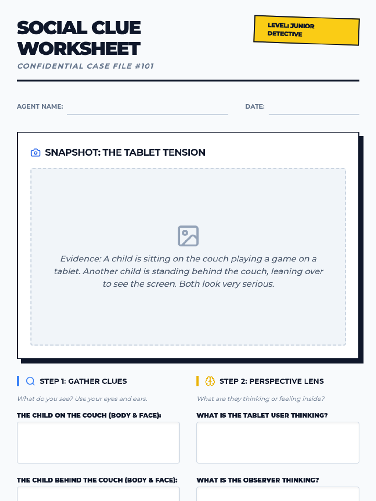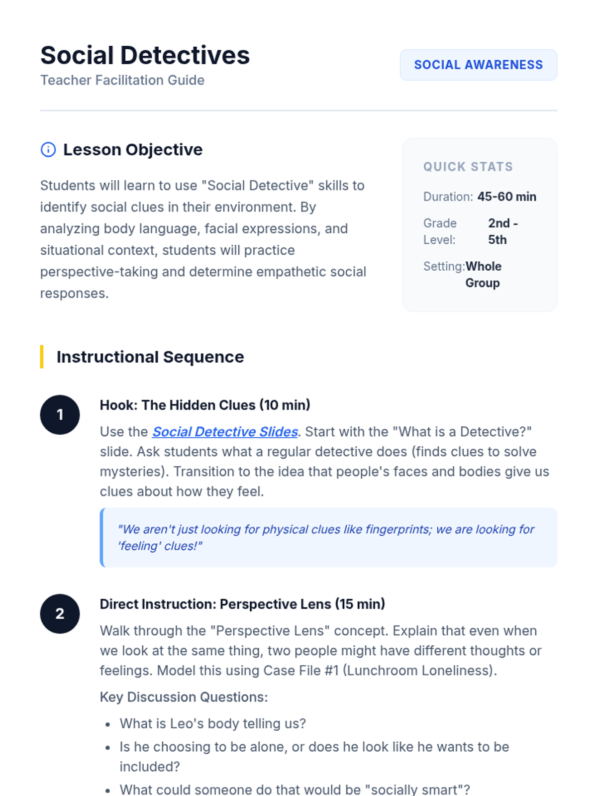 A lesson focused on developing social awareness and perspective-taking through 'Social Detective' scenarios. Students learn to read social cues and choose empathetic responses.