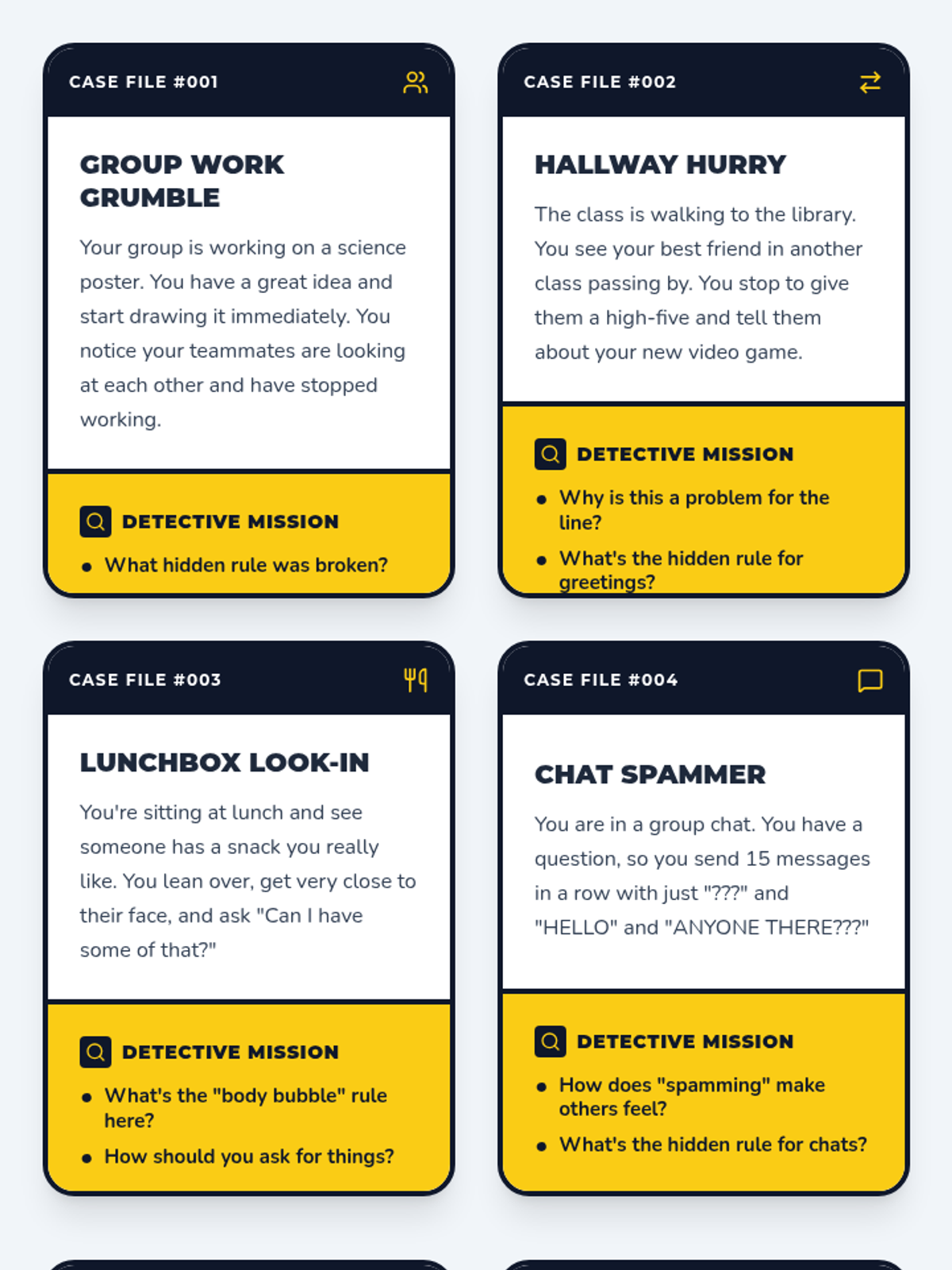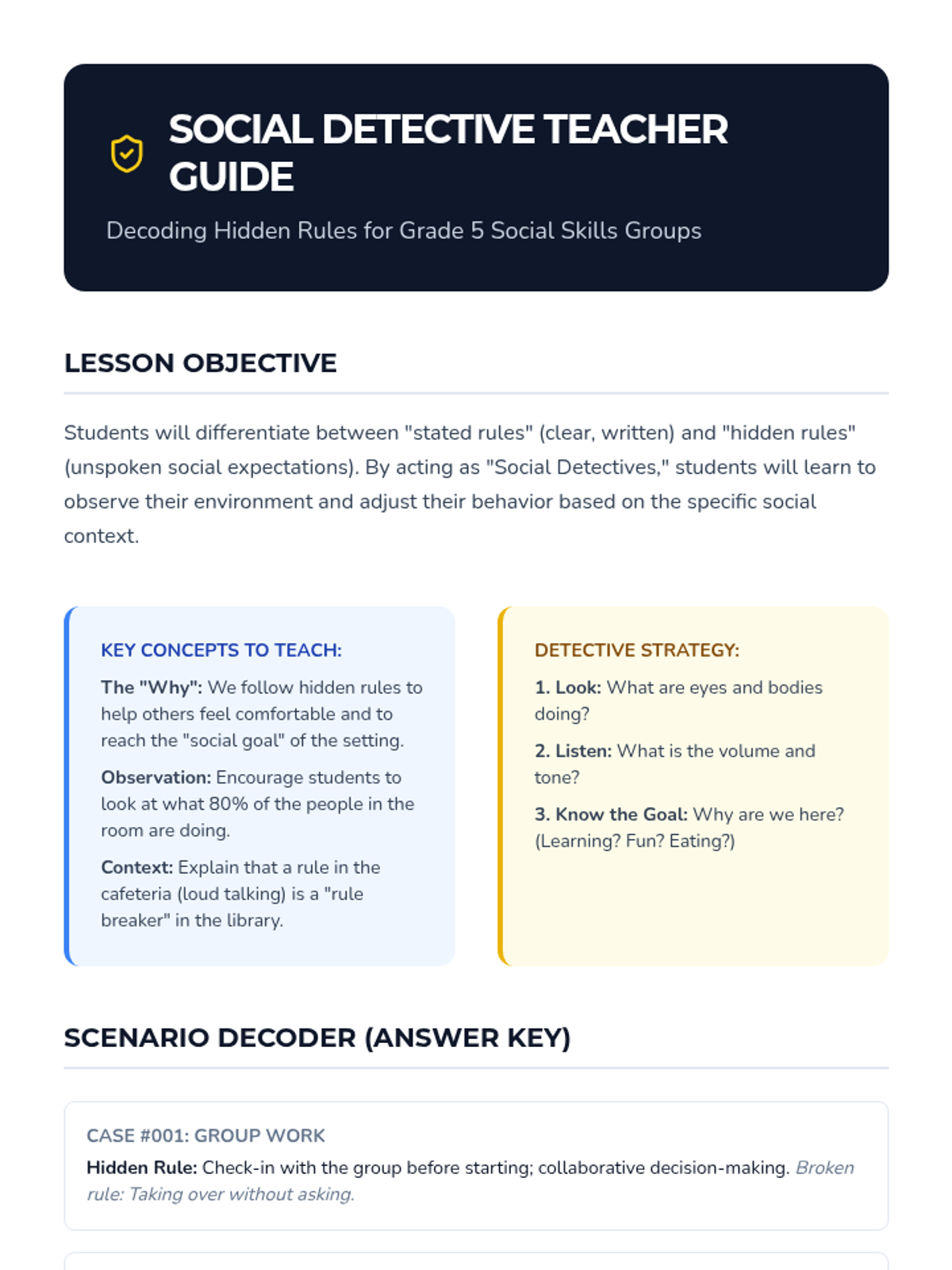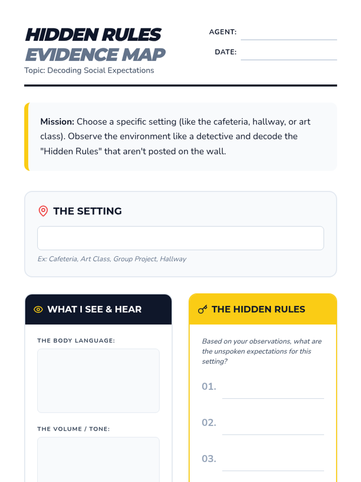 A lesson designed to help Grade 5 students identify and understand 'hidden rules' across various social settings like the classroom, cafeteria, and digital spaces. Students act as 'Social Detectives' to decode unspoken expectations.