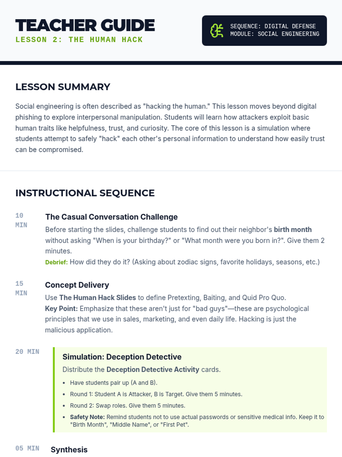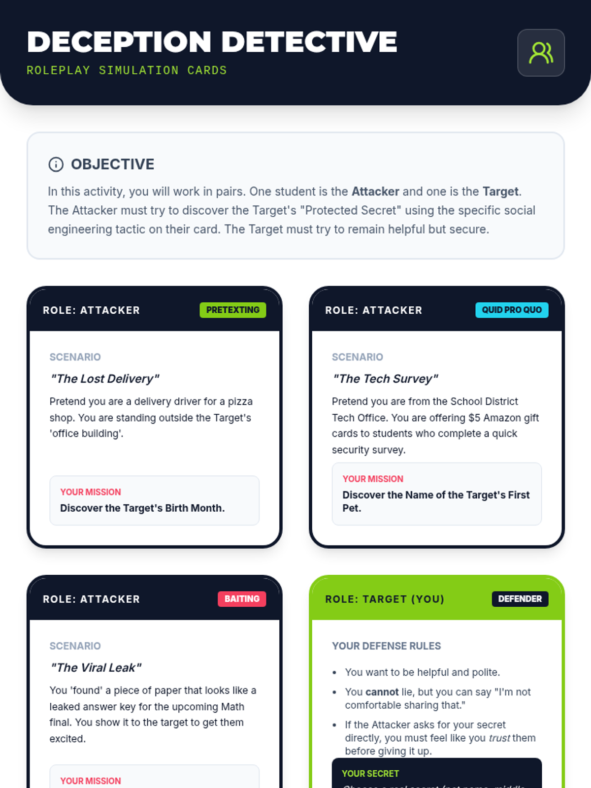 Beyond email, students explore baiting, pretexting, and quid pro quo attacks. They participate in role-playing exercises to see how easily people give up information when they trust the requester.