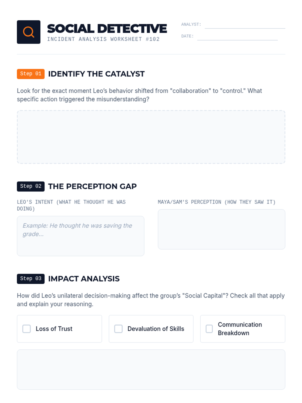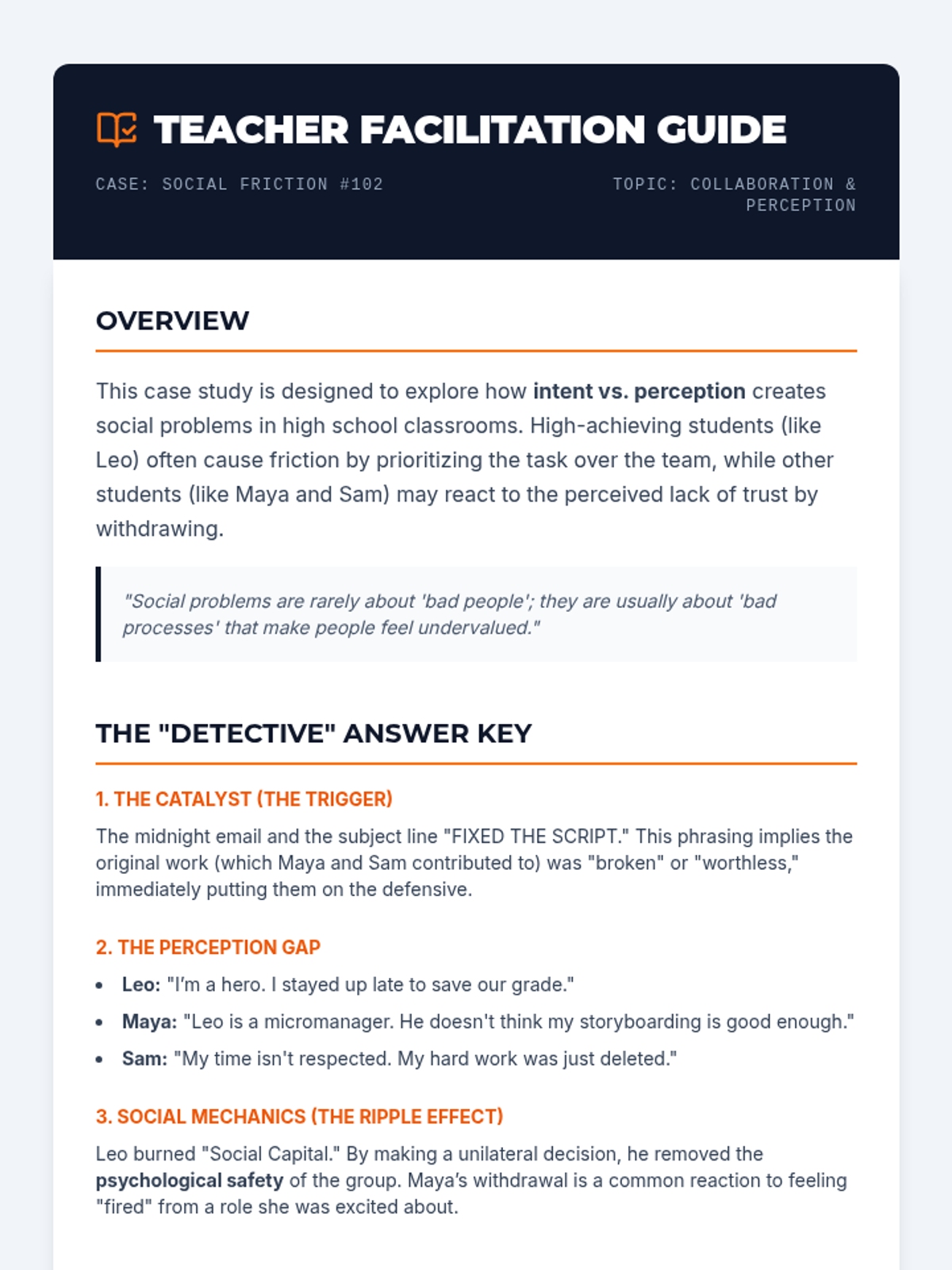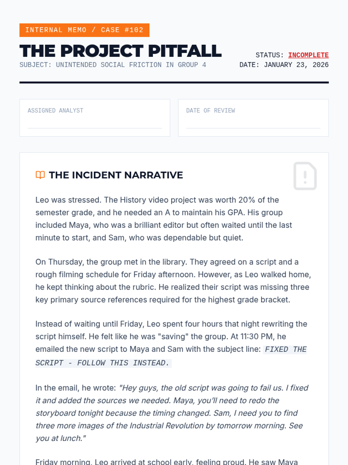 A case-study based lesson focused on analyzing classroom social dynamics and unintended consequences in group work.
