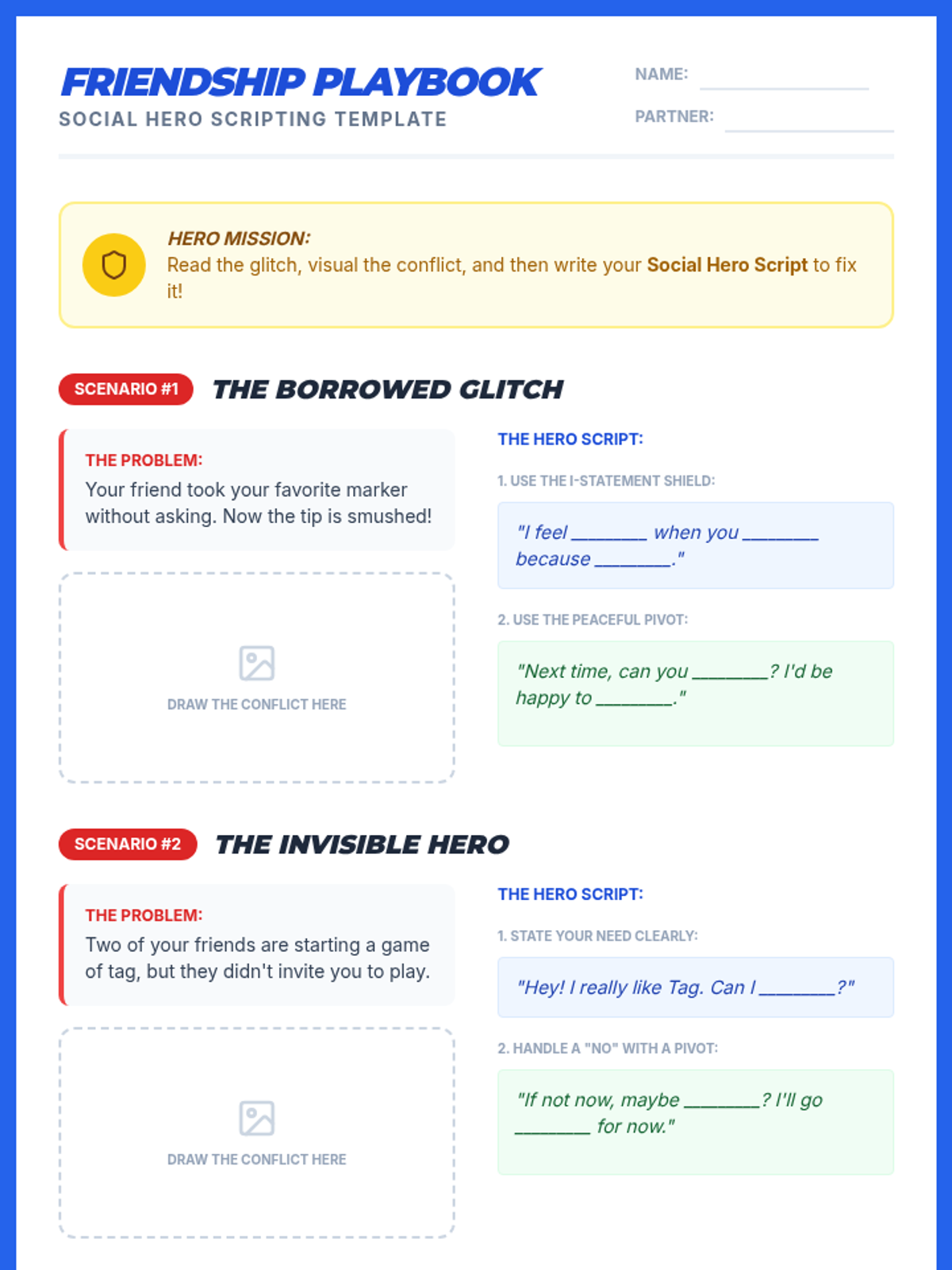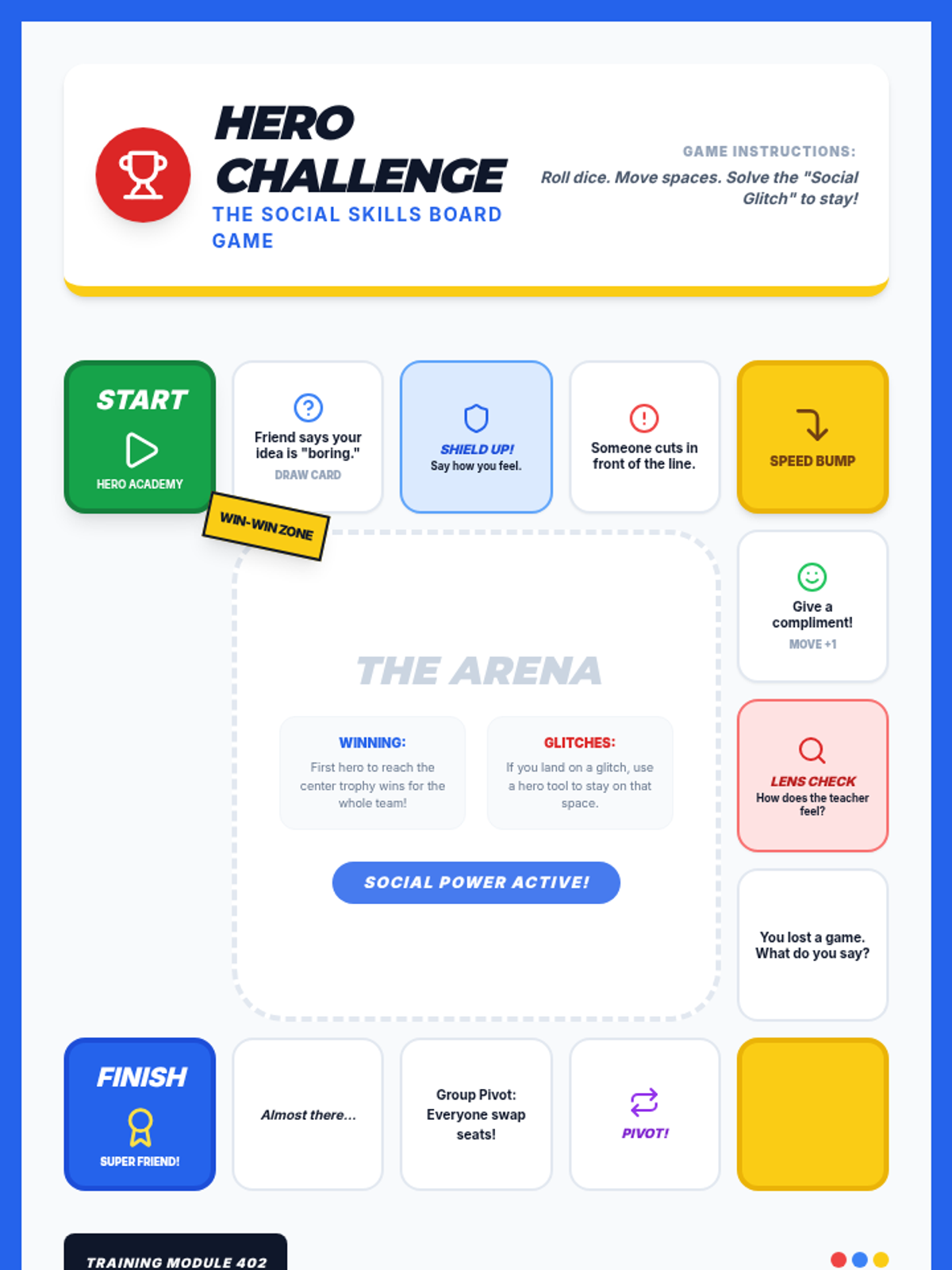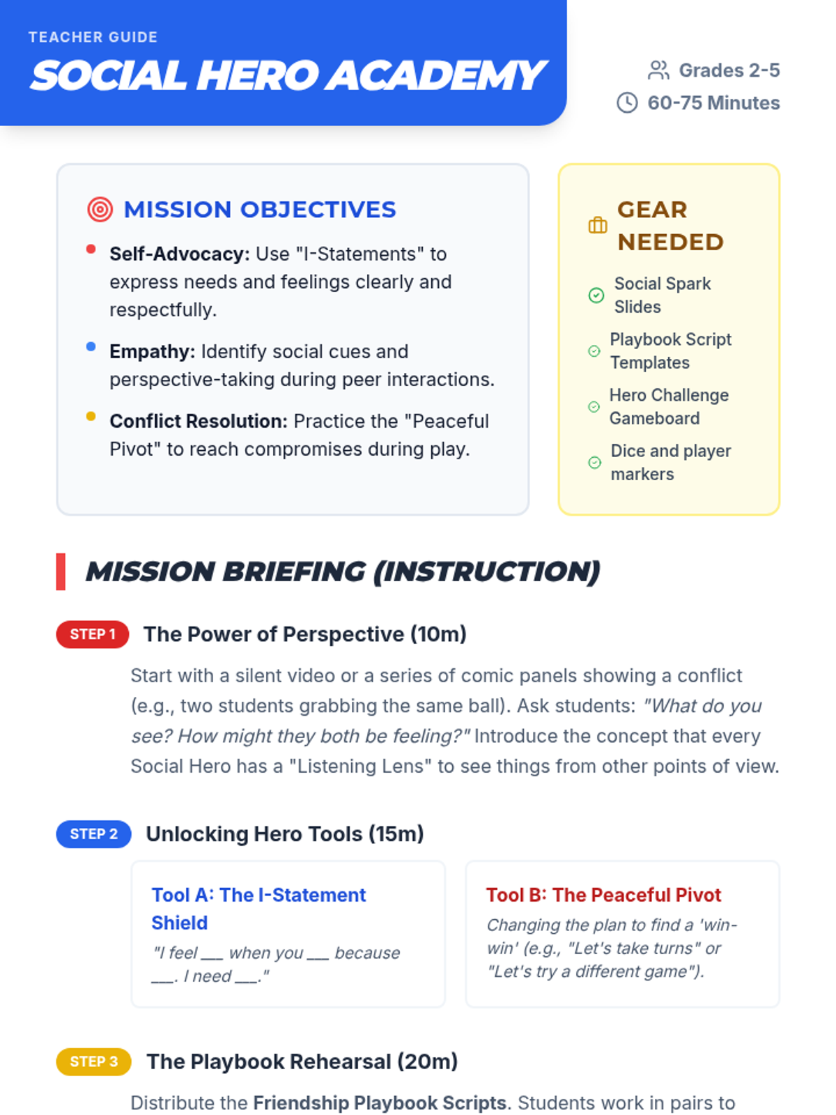 A comprehensive lesson designed to help students in grades 2-5 navigate social nuances and resolve peer conflicts. Students transform into 'Social Heroes' to practice empathy, self-advocacy, and active listening through interactive role-playing and collaborative gameplay.