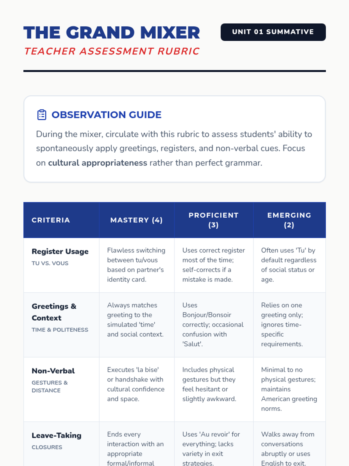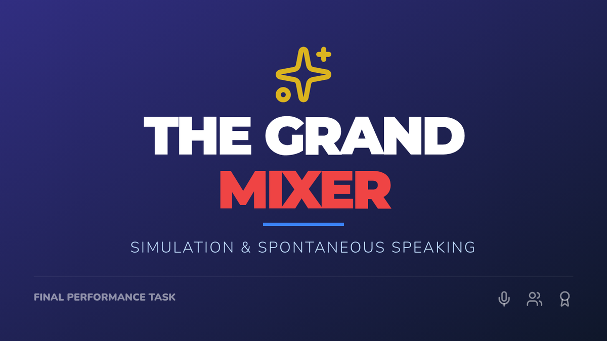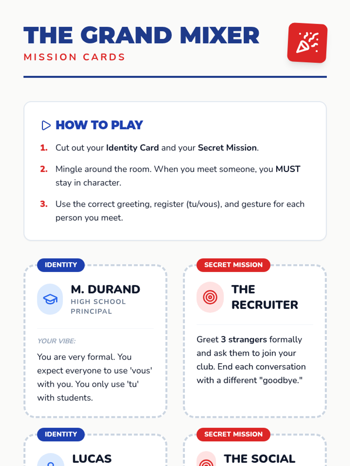 The final lesson is a social simulation where students apply everything they've learned. Using character cards, students navigate a 'mixer' event, switching between registers and gestures as they interact with different personas.