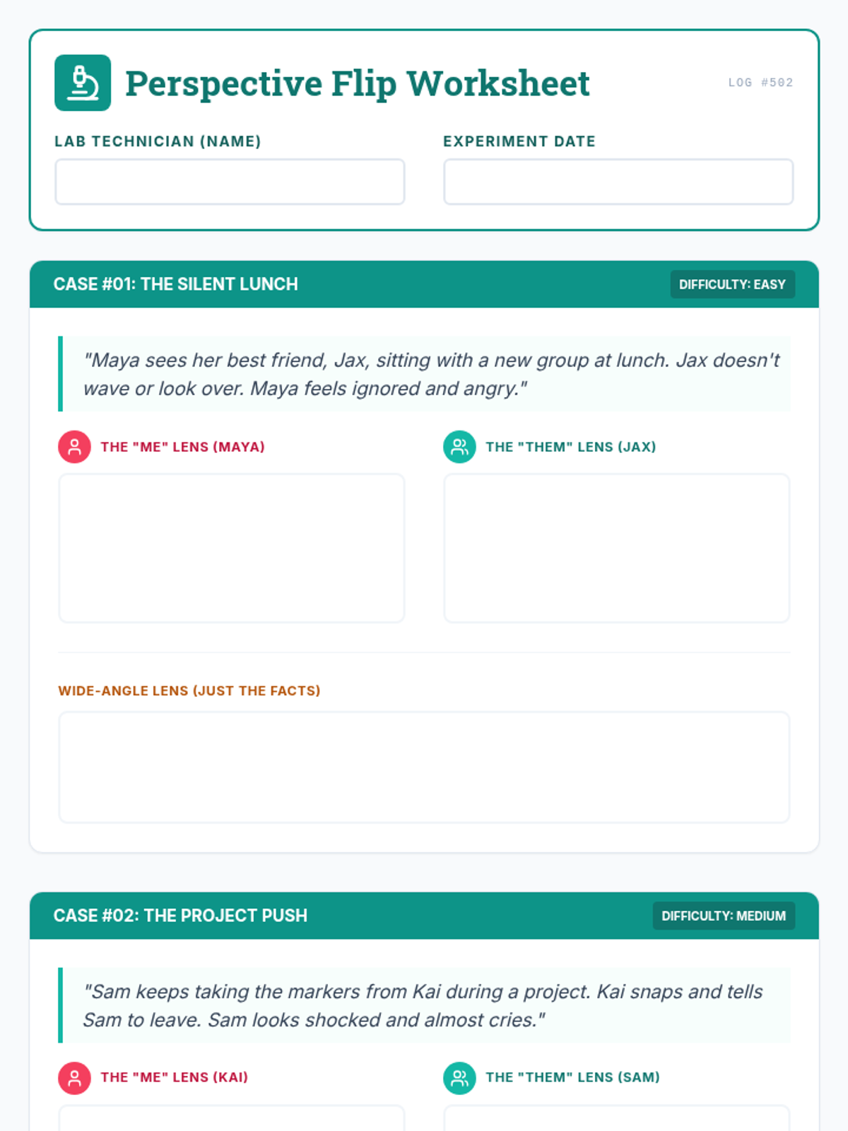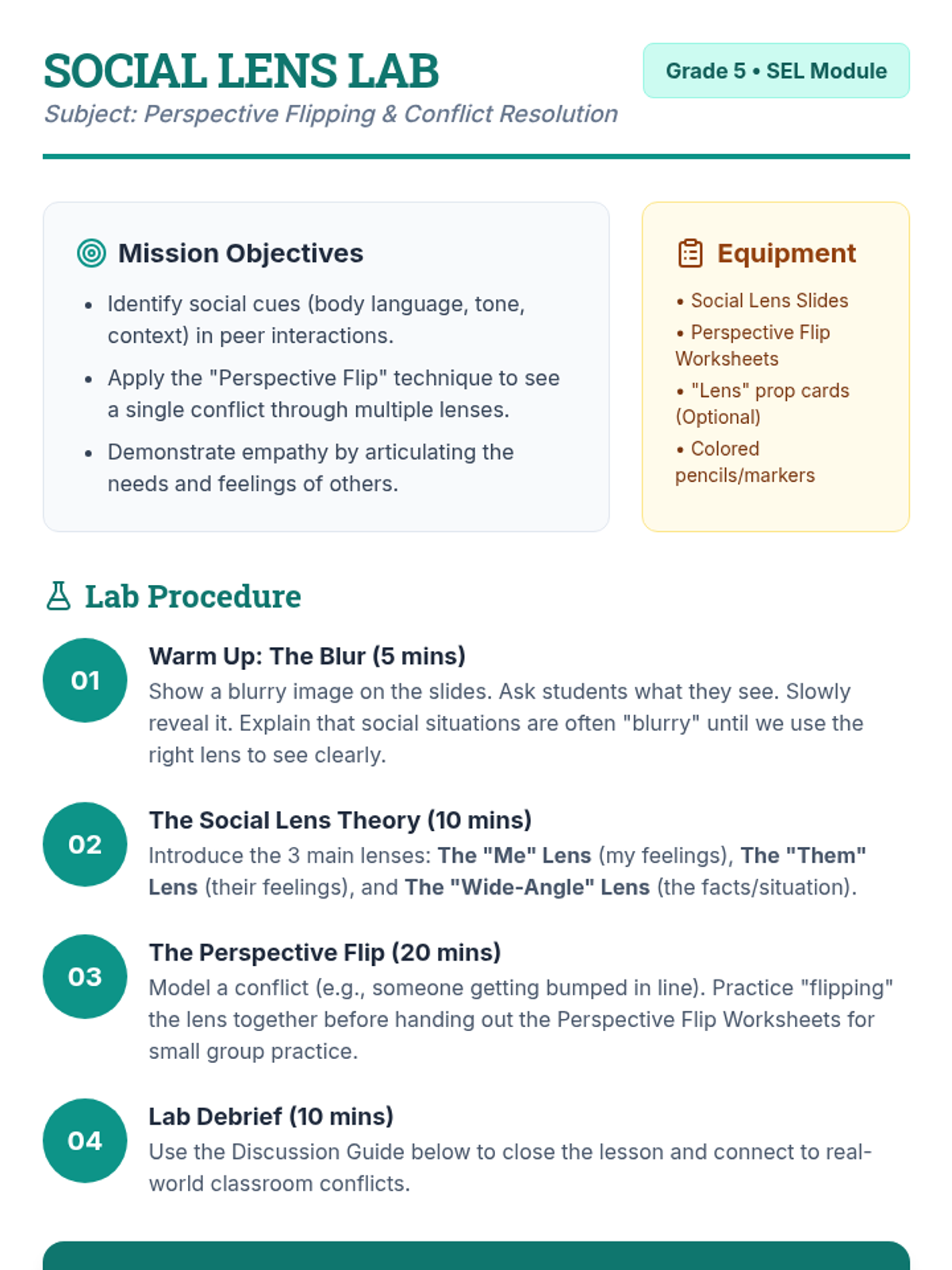 A high-energy, interactive social-emotional learning lesson where students use 'social lenses' to analyze peer conflicts and practice the Perspective Flip technique to build empathy.