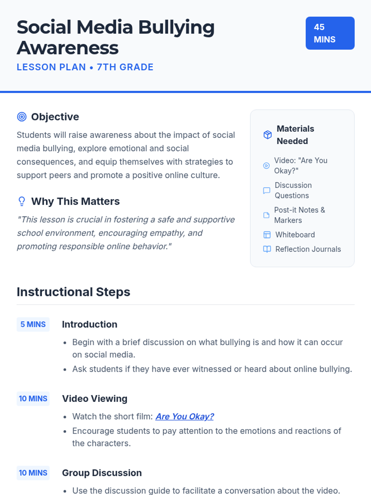 This lesson raises awareness about social media bullying, exploring its emotional impact and equipping 7th-grade students with strategies to support peers and promote a positive online culture.