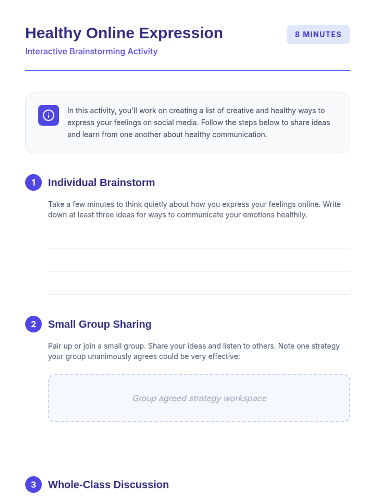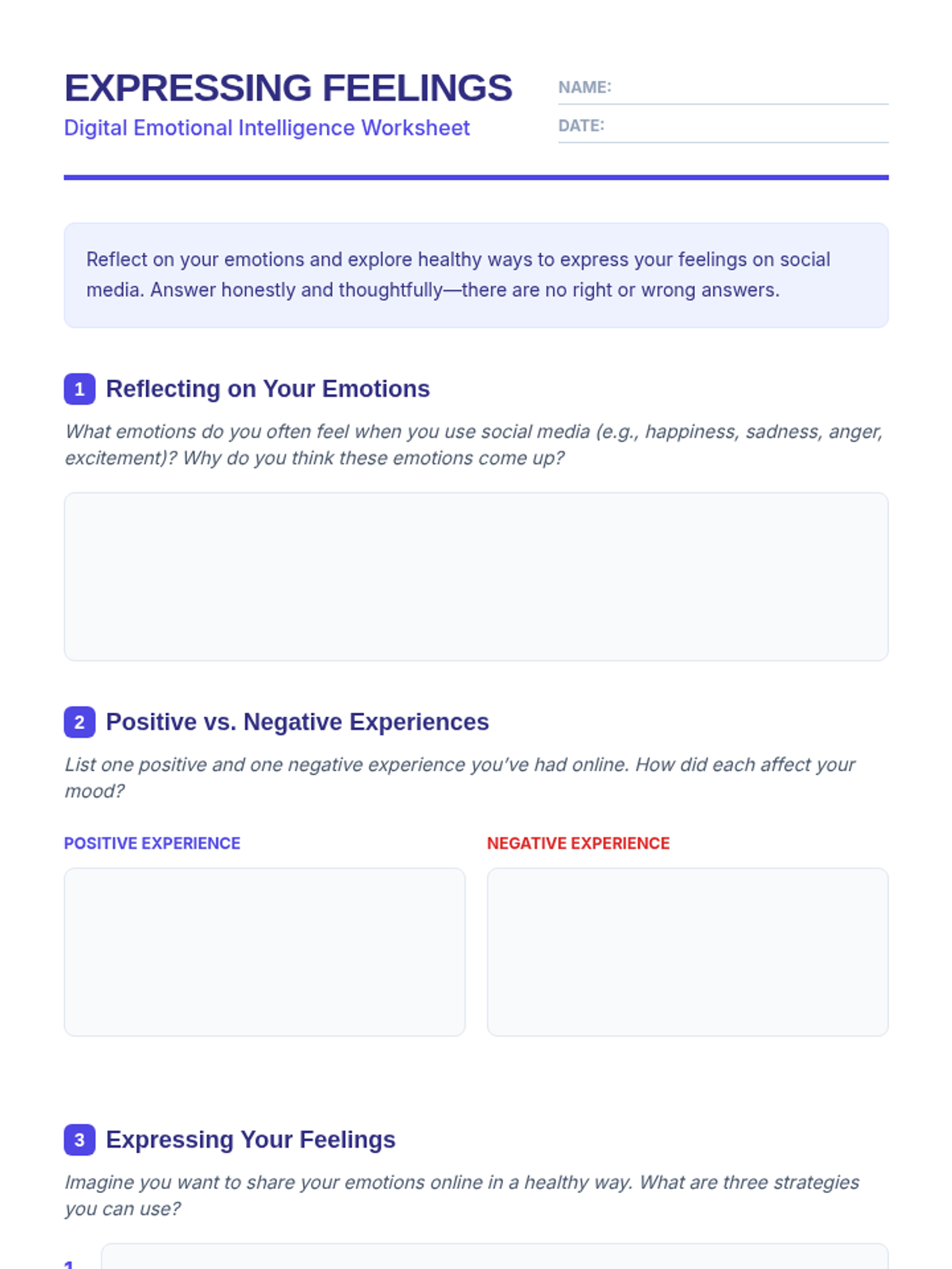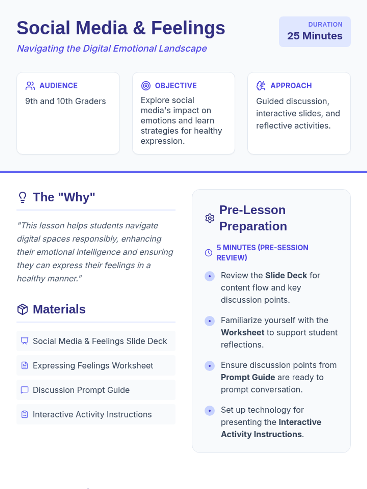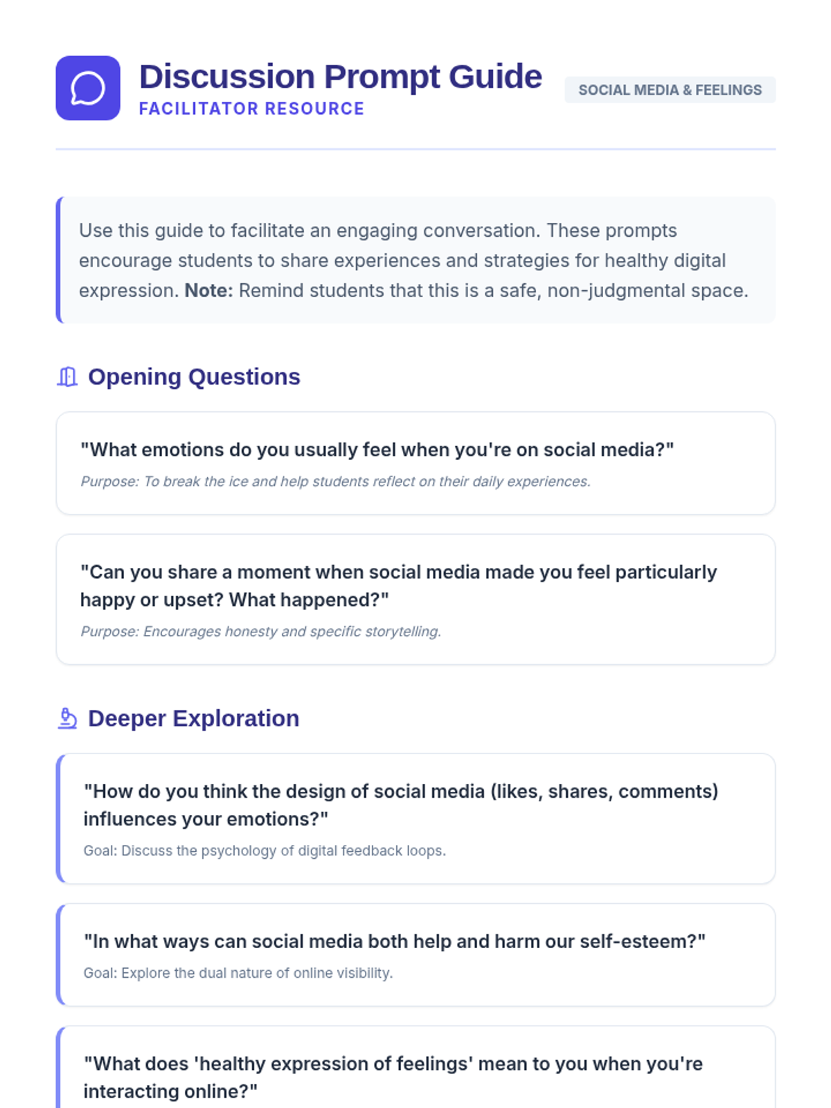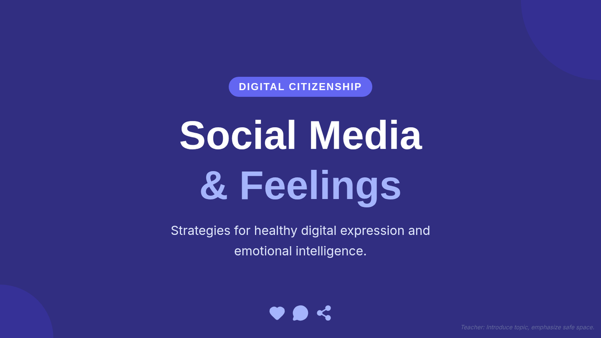 A 25-minute lesson for 9th and 10th graders focusing on the emotional impact of social media and strategies for healthy digital expression. Students will engage in guided discussions, watch a short video, and complete a reflective worksheet to improve their digital emotional intelligence.