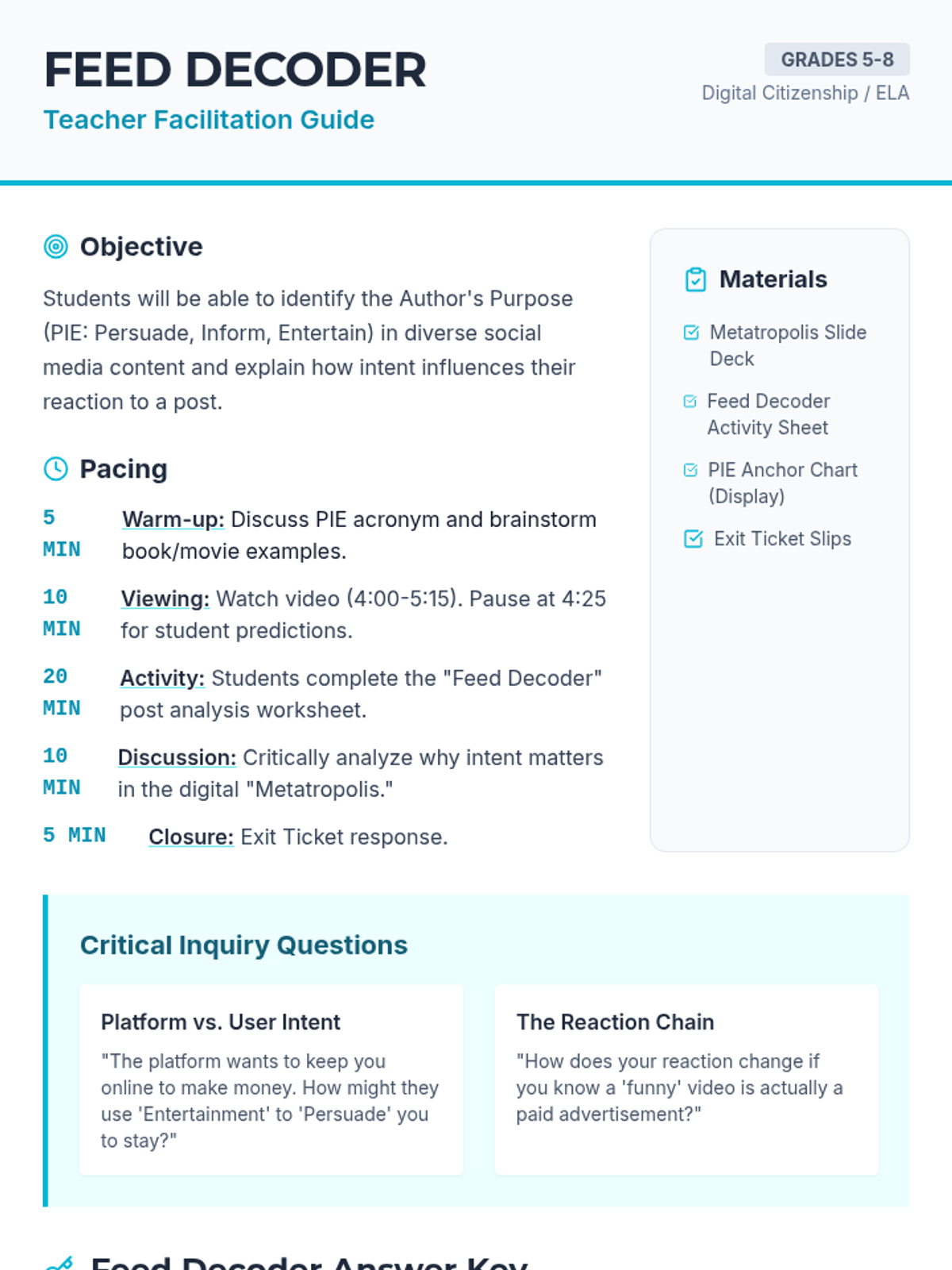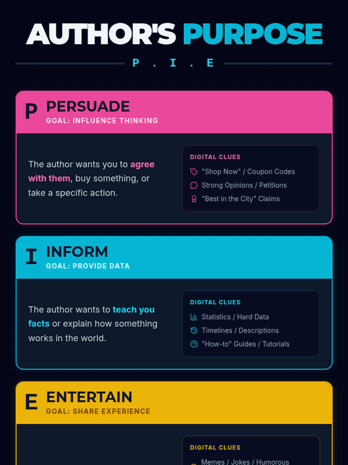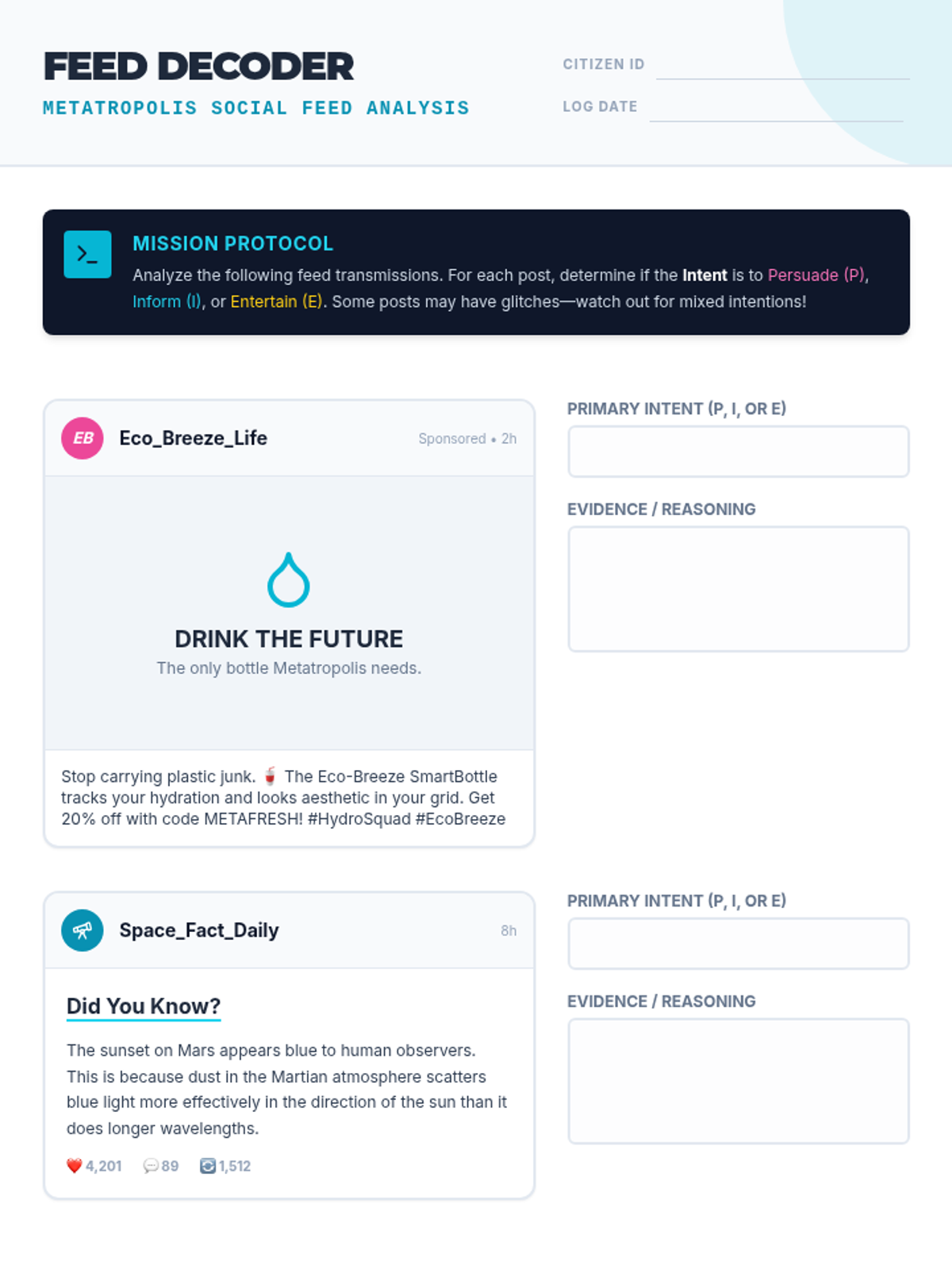 A lesson on identifying Author's Purpose (PIE) in social media content, focusing on digital literacy and media responsibility within a sci-fi virtual world theme.