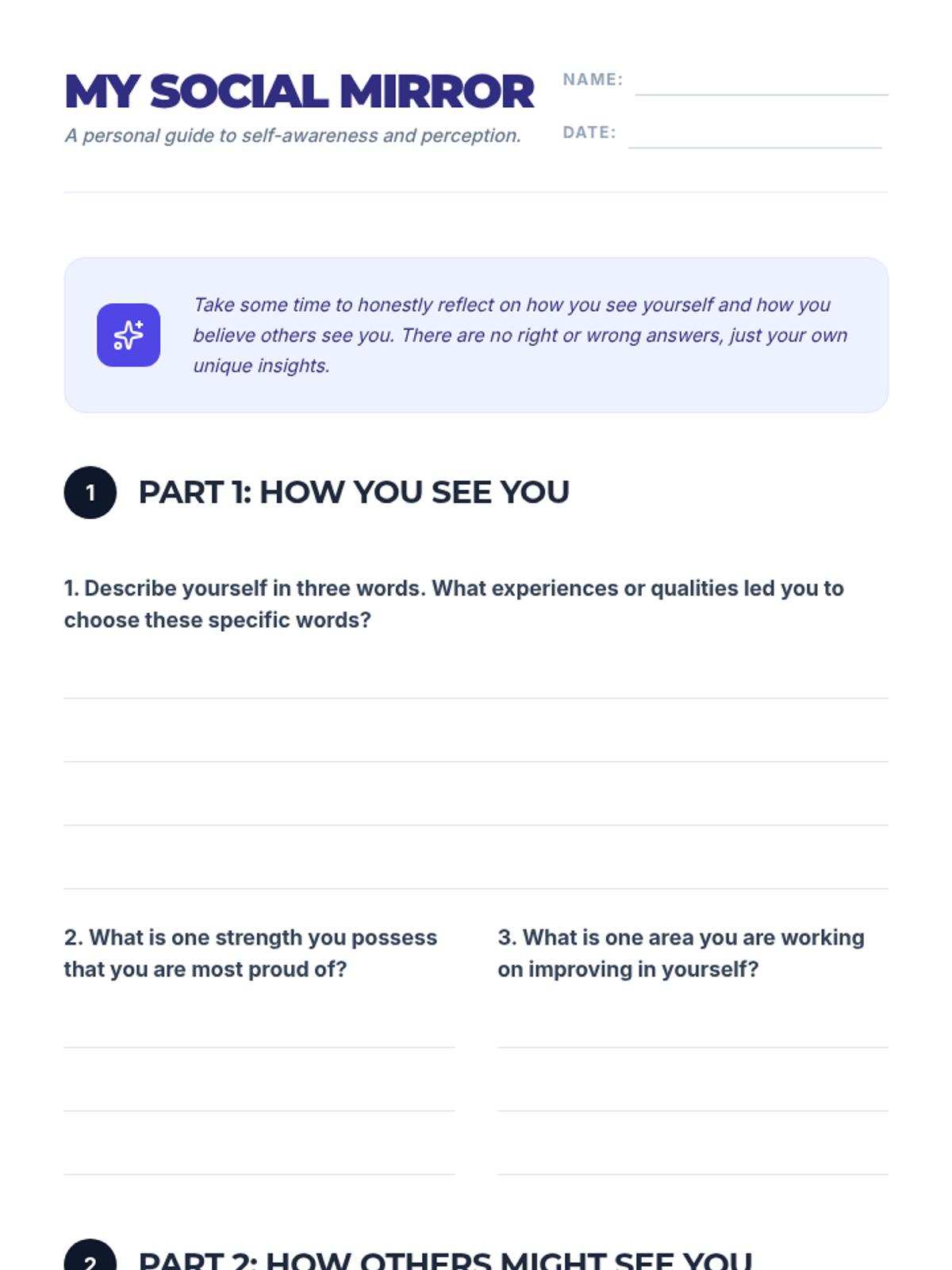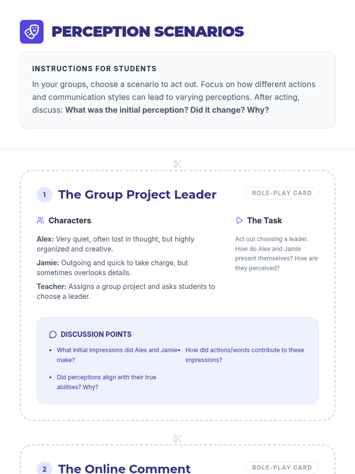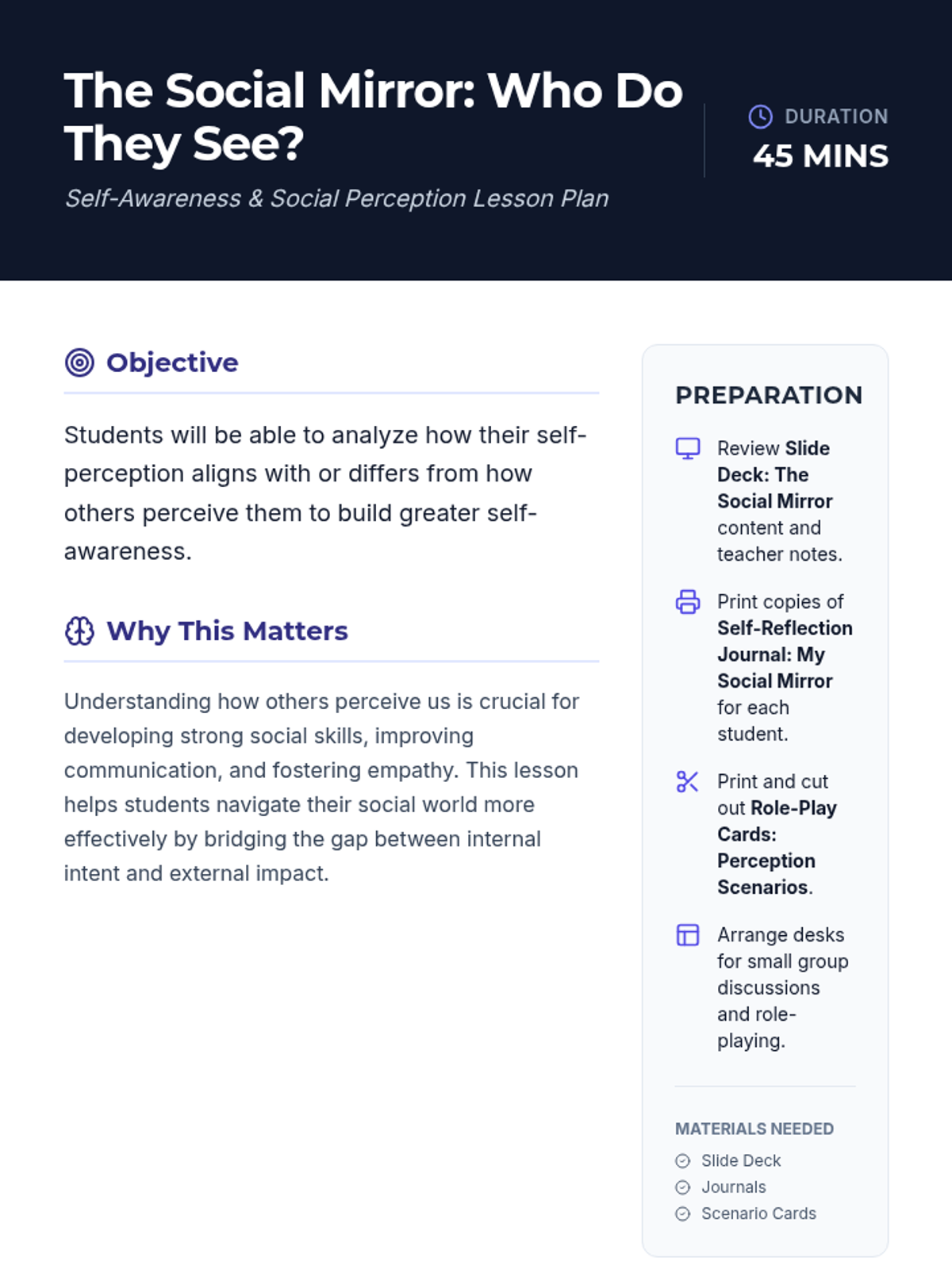 This lesson helps 10th-grade students analyze how their self-perception aligns with or differs from how others perceive them, fostering greater self-awareness. It explores key concepts like self-awareness, social perception, first impressions, personal identity, and feedback in a single 45-minute session.