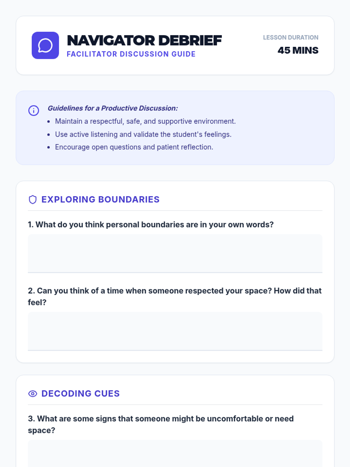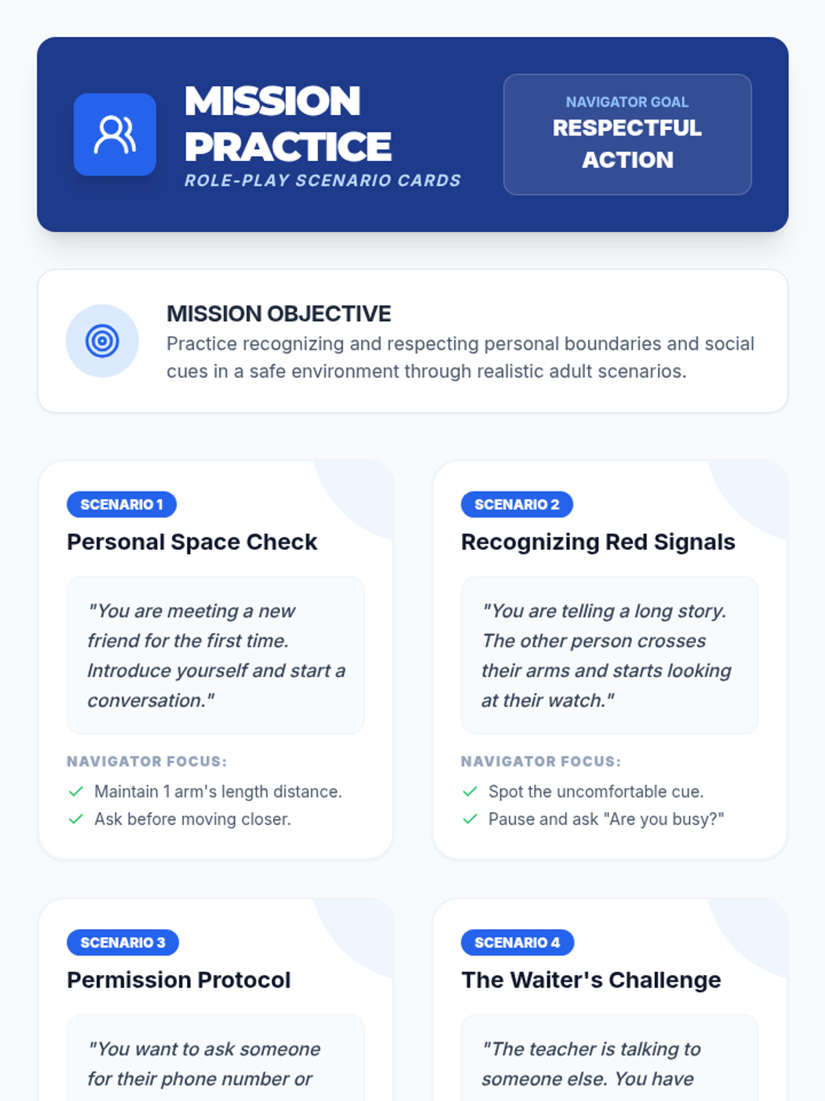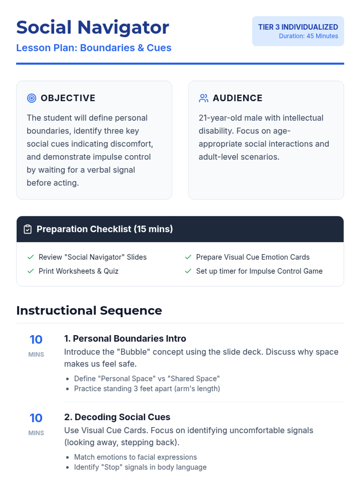A 45-minute individualized lesson for a young adult student focusing on personal space, interpreting social signals, and practicing self-regulation in social settings.
