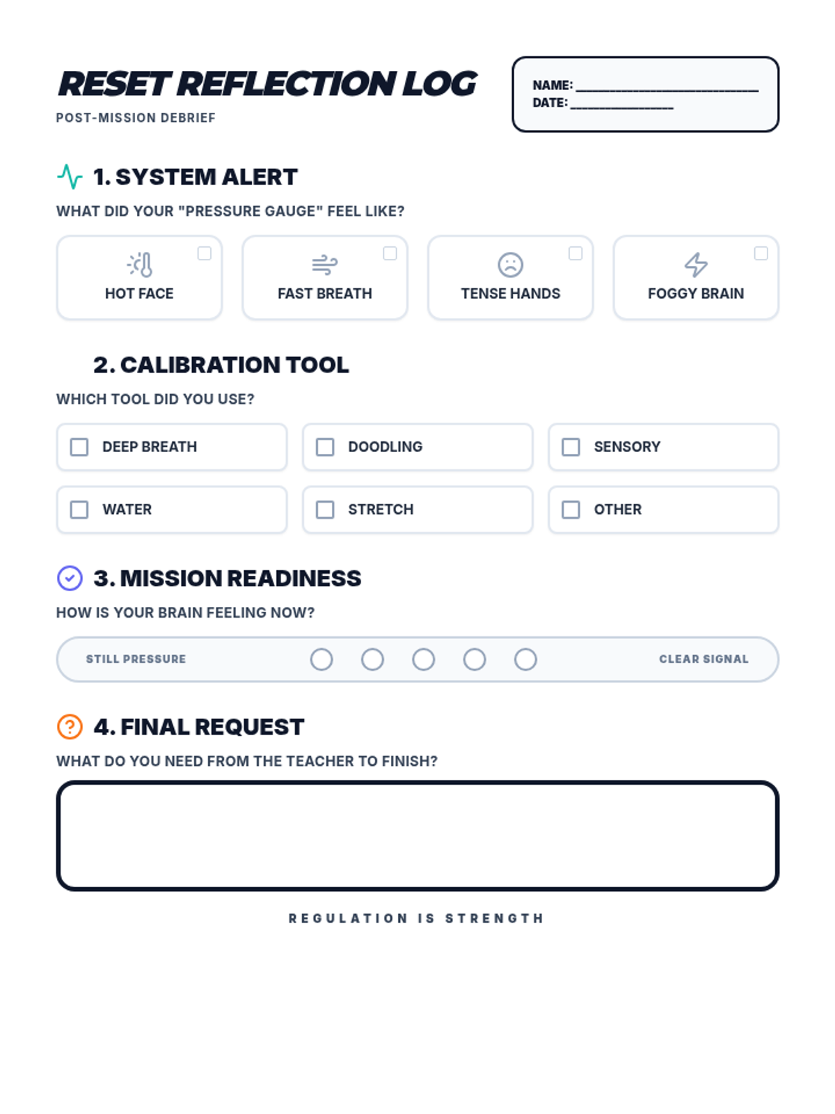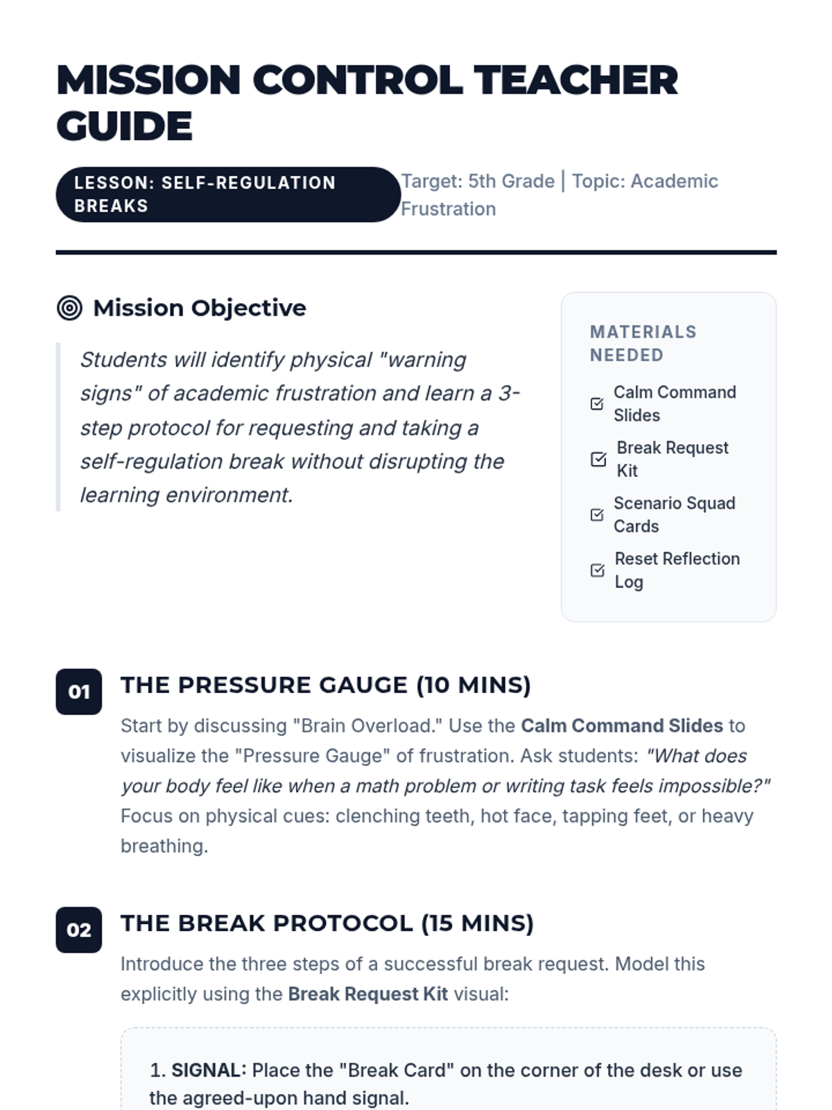 A comprehensive lesson designed to help 5th-grade students recognize emotional triggers related to academic frustration and master the skill of requesting a self-regulation break appropriately.
