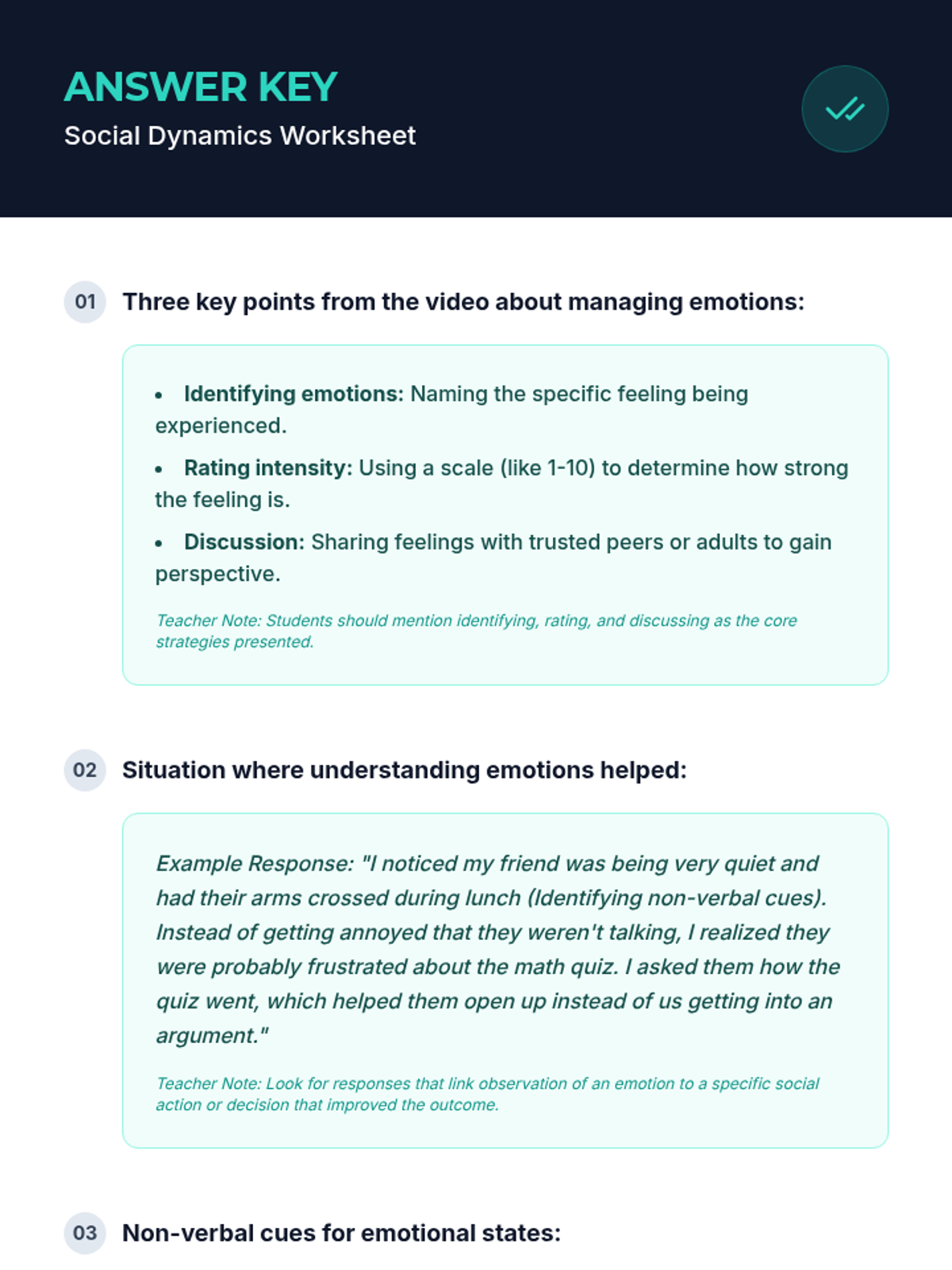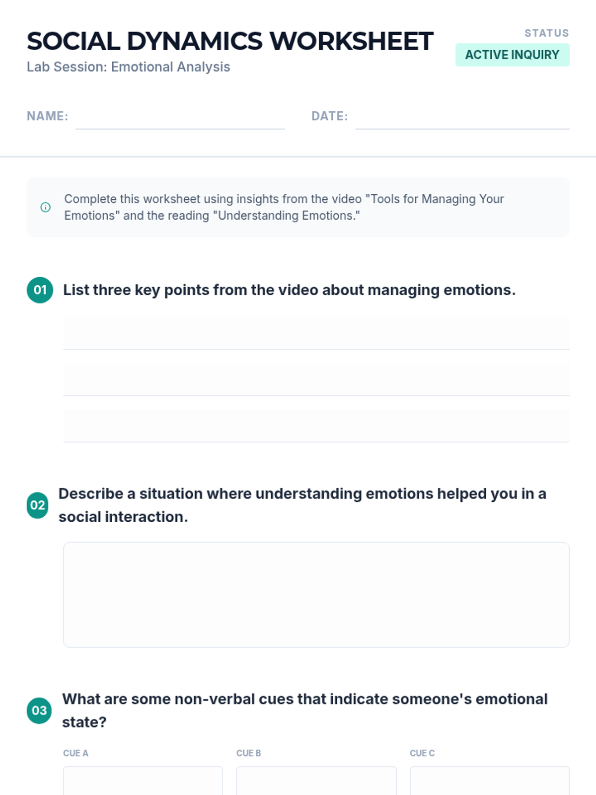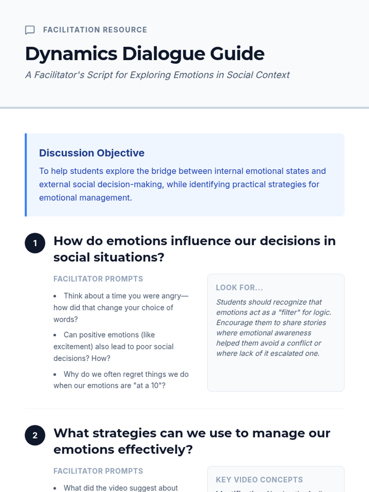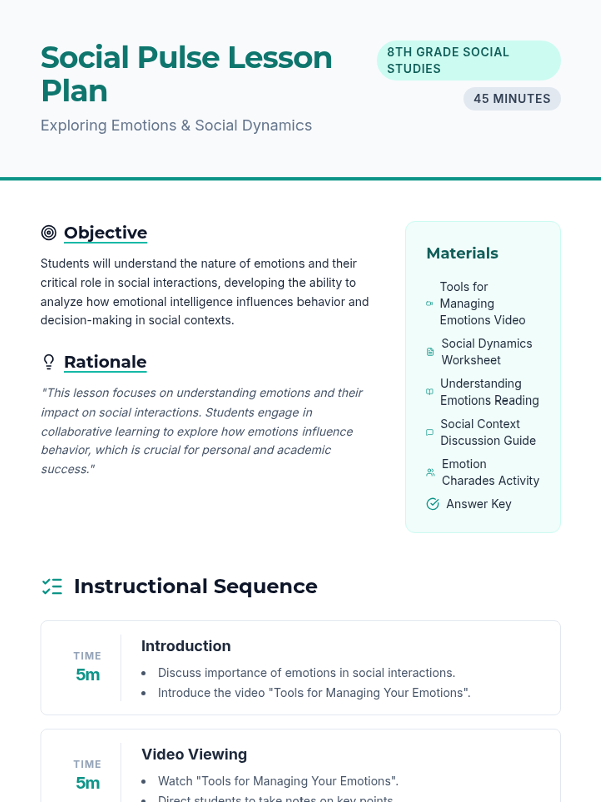A lesson focused on understanding emotions and their impact on social interactions through collaborative discussion, reading, and experiential activities. Students explore how emotional intelligence influences behavior and decision-making in 8th-grade Social Studies.