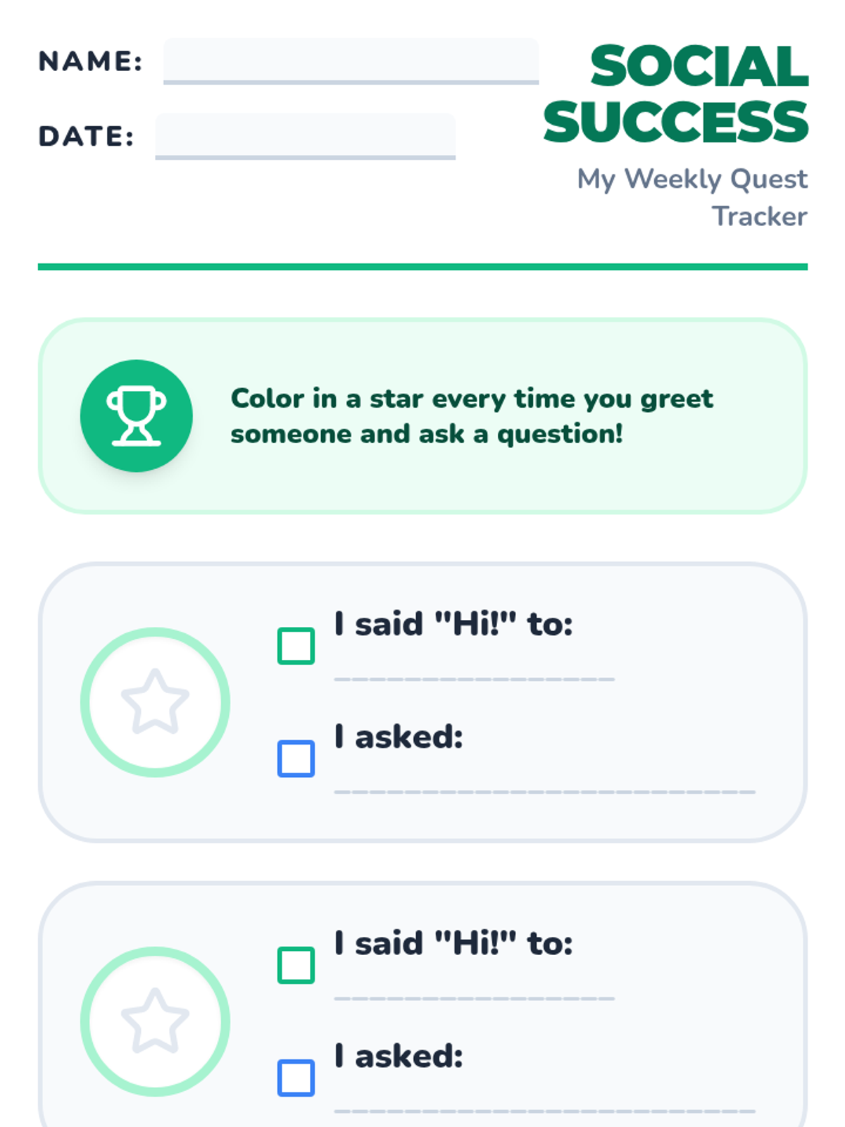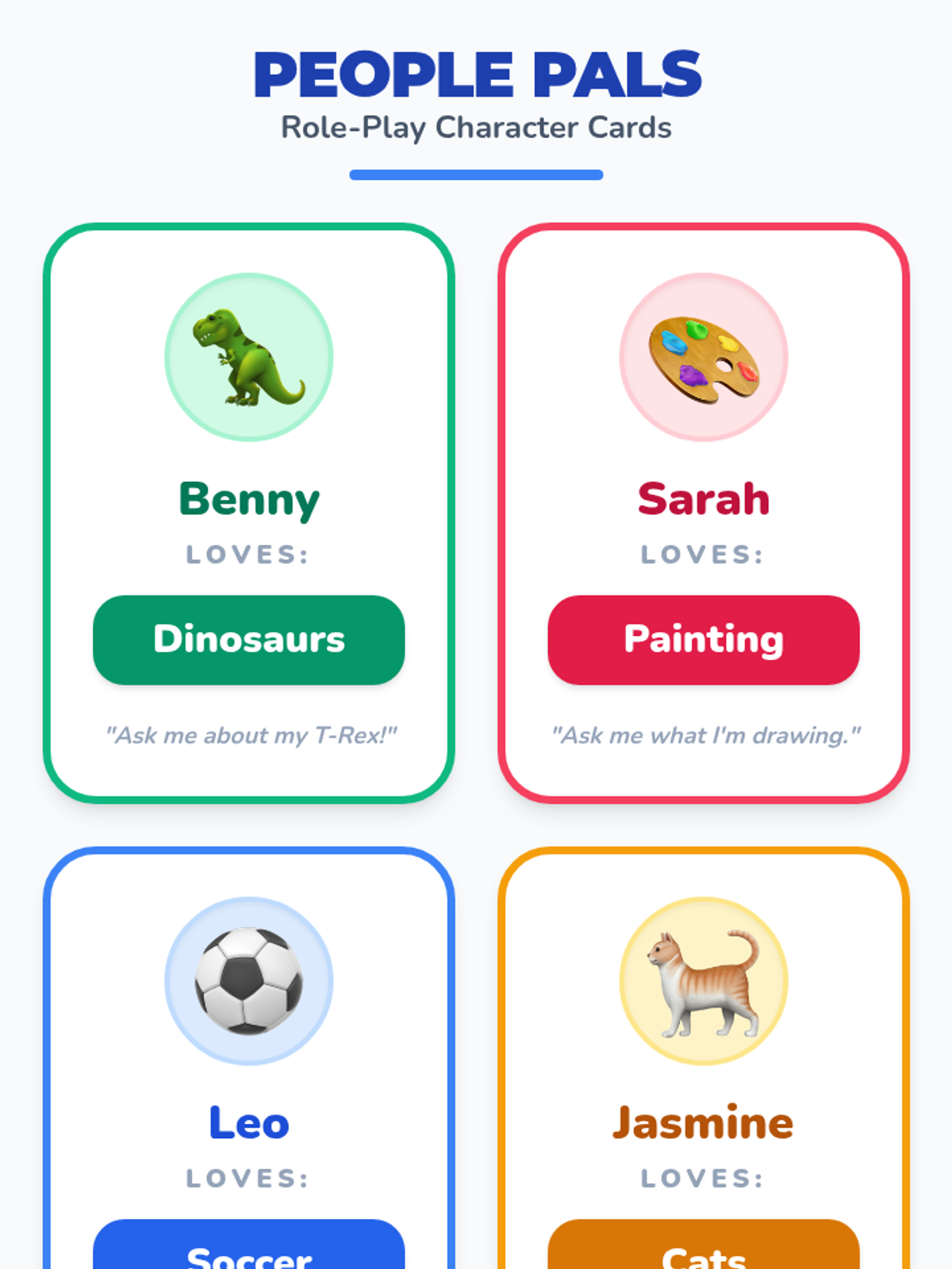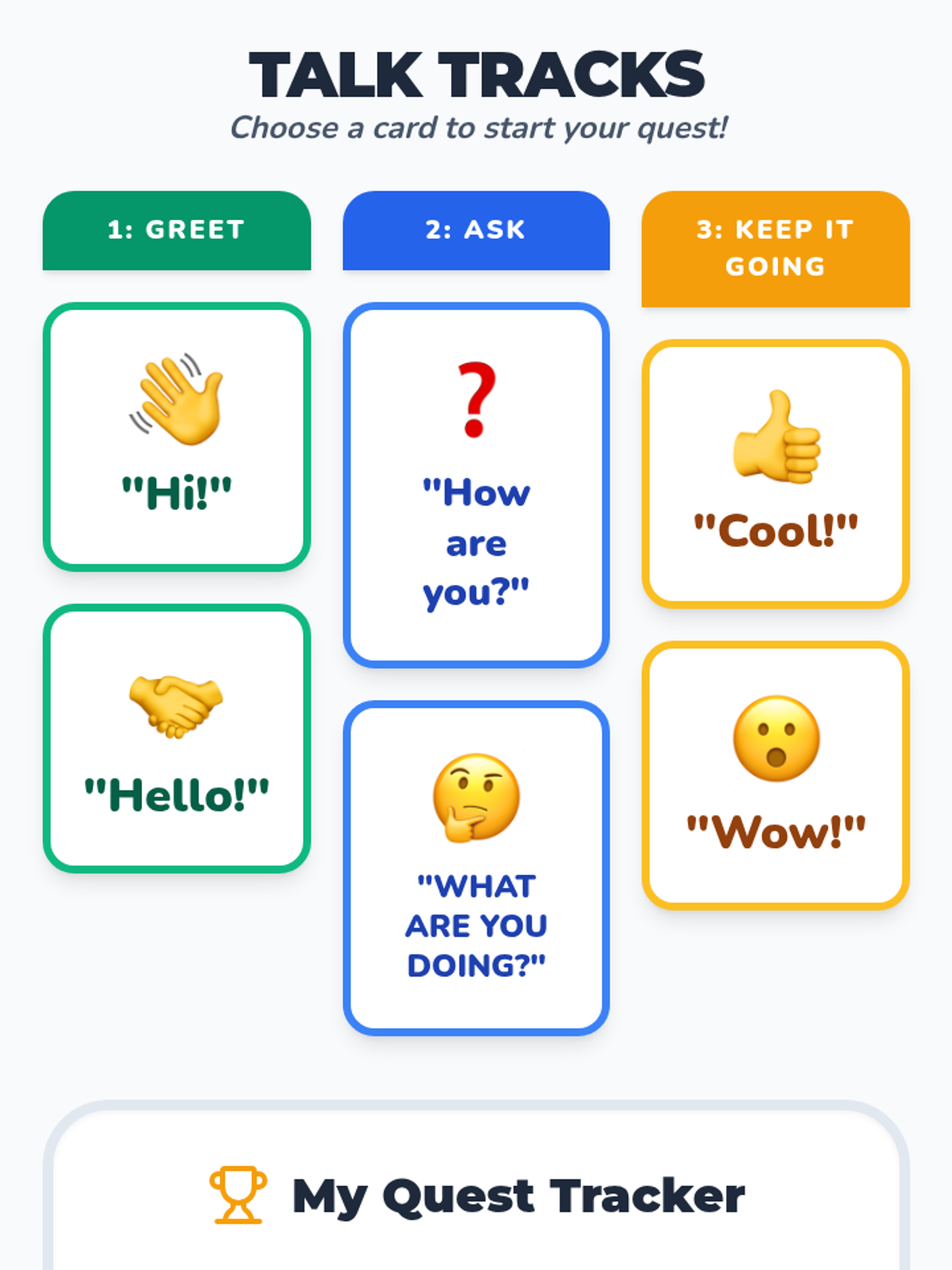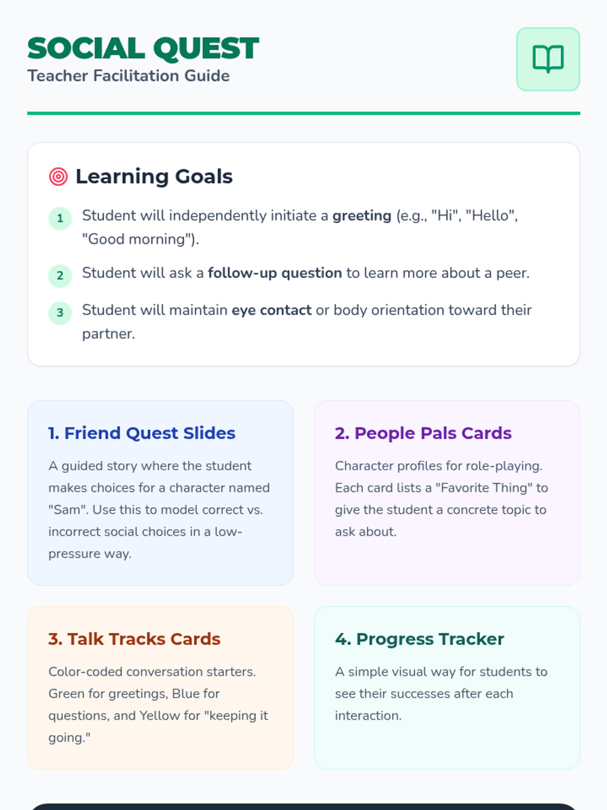 A comprehensive set of interactive and role-playing tools designed to help students with intellectual disabilities practice greetings and relationship-building questions.