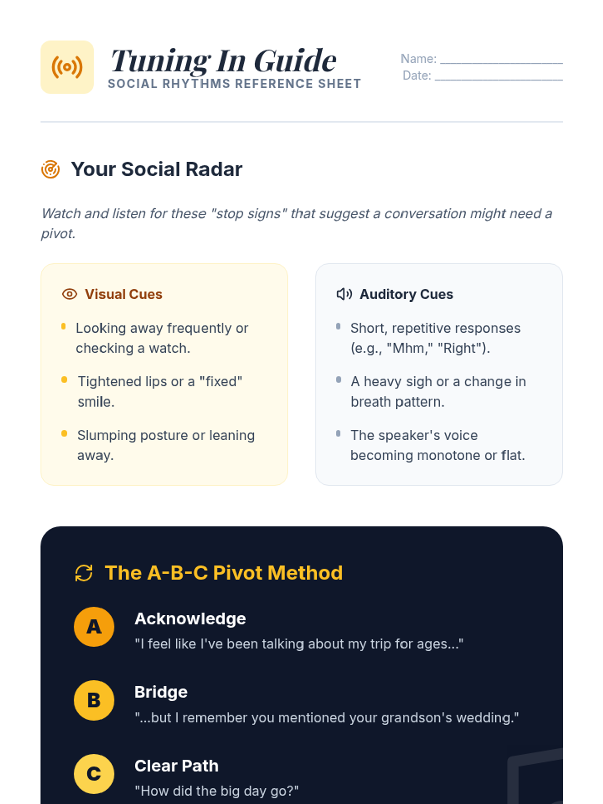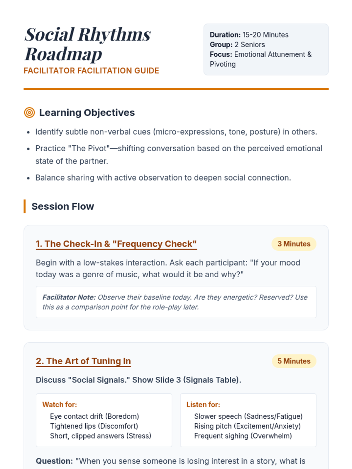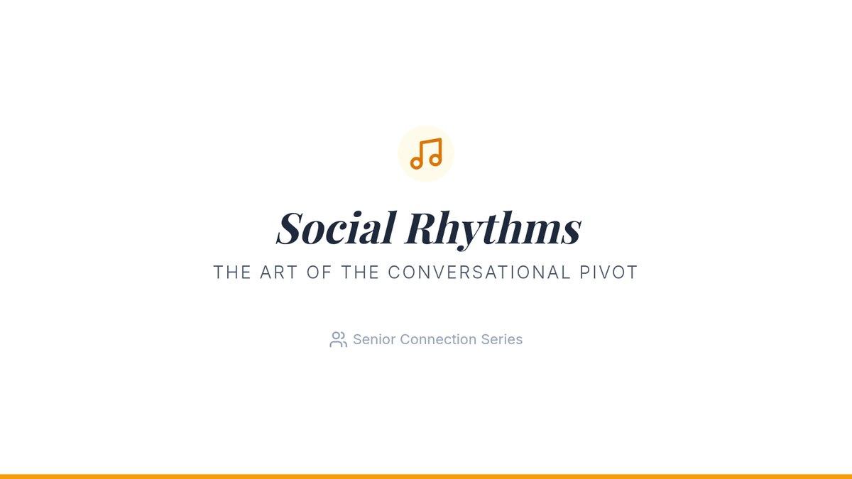 A high-level social skills session focused on emotional intelligence and the art of the conversational pivot. Designed for seniors to enhance connection through active observation and adaptive dialogue.