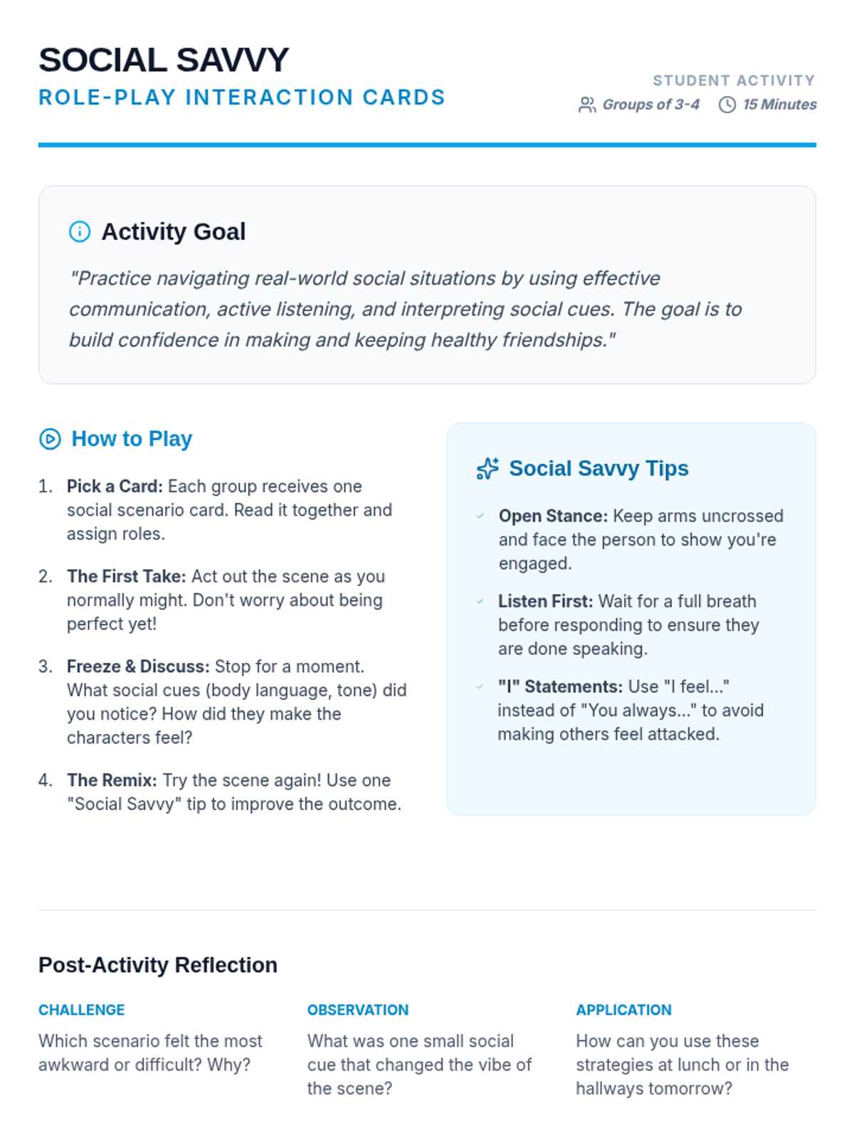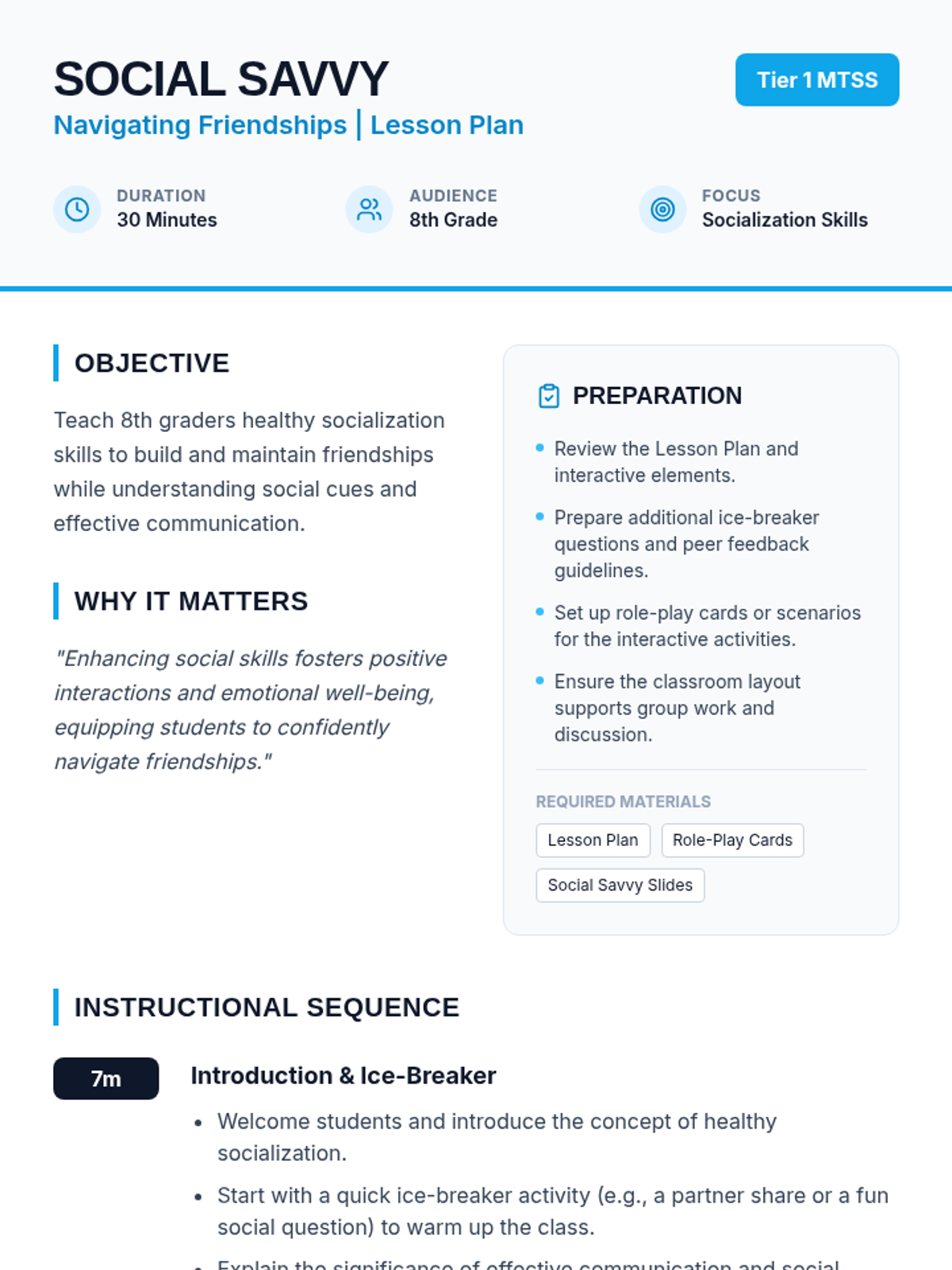 A 30-minute Tier 1 lesson for 8th graders focused on building healthy friendships through understanding social cues, active listening, and effective communication. Students engage in interactive role-plays to practice real-world social scenarios.