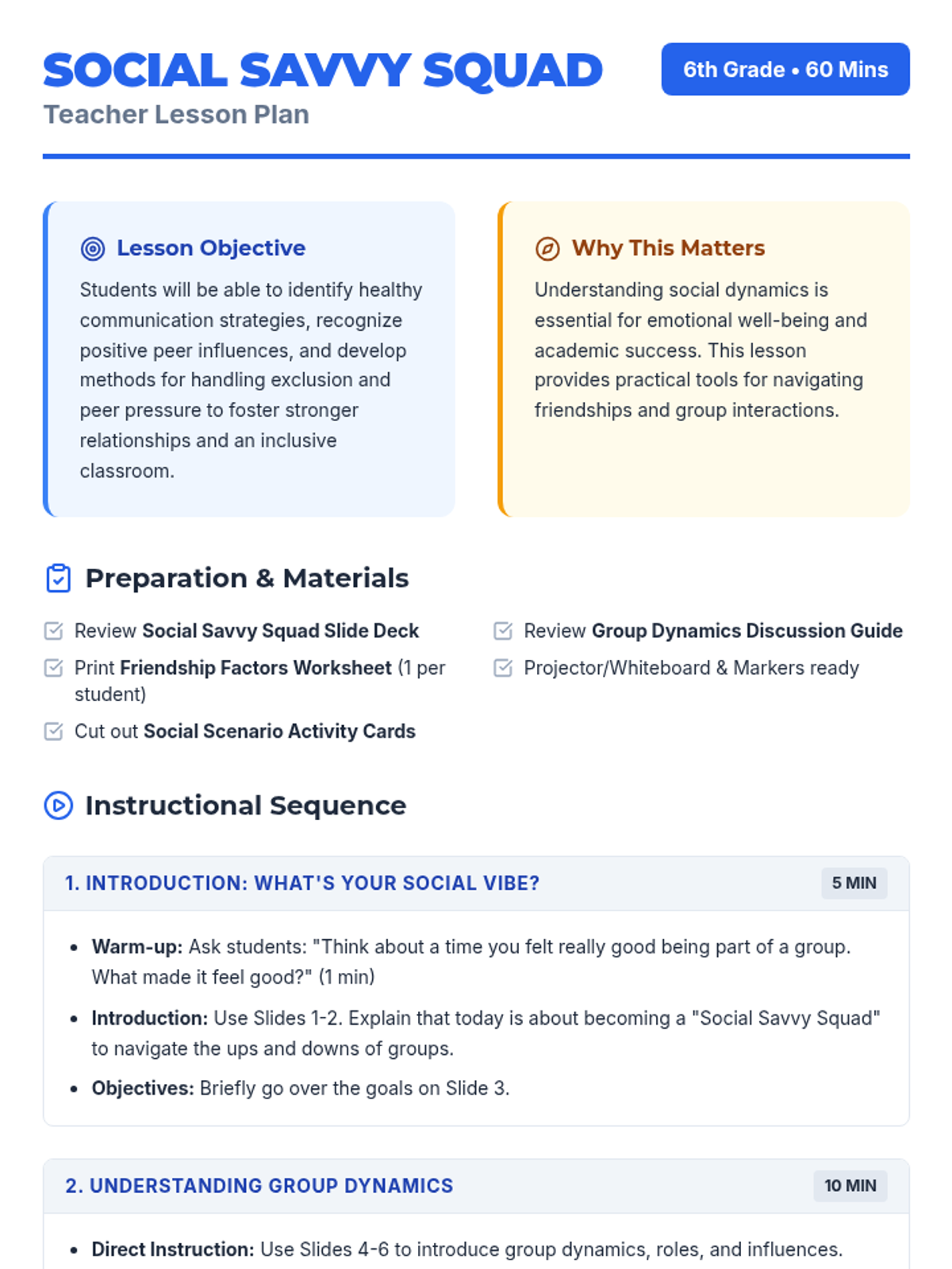 A 60-minute lesson for 6th graders to develop social intelligence, understand group dynamics, and build healthy friendships through interactive activities and reflection.