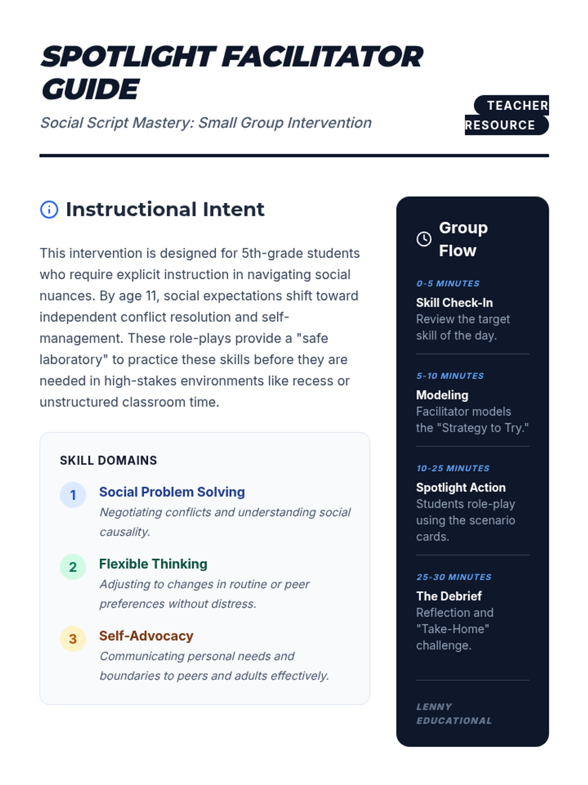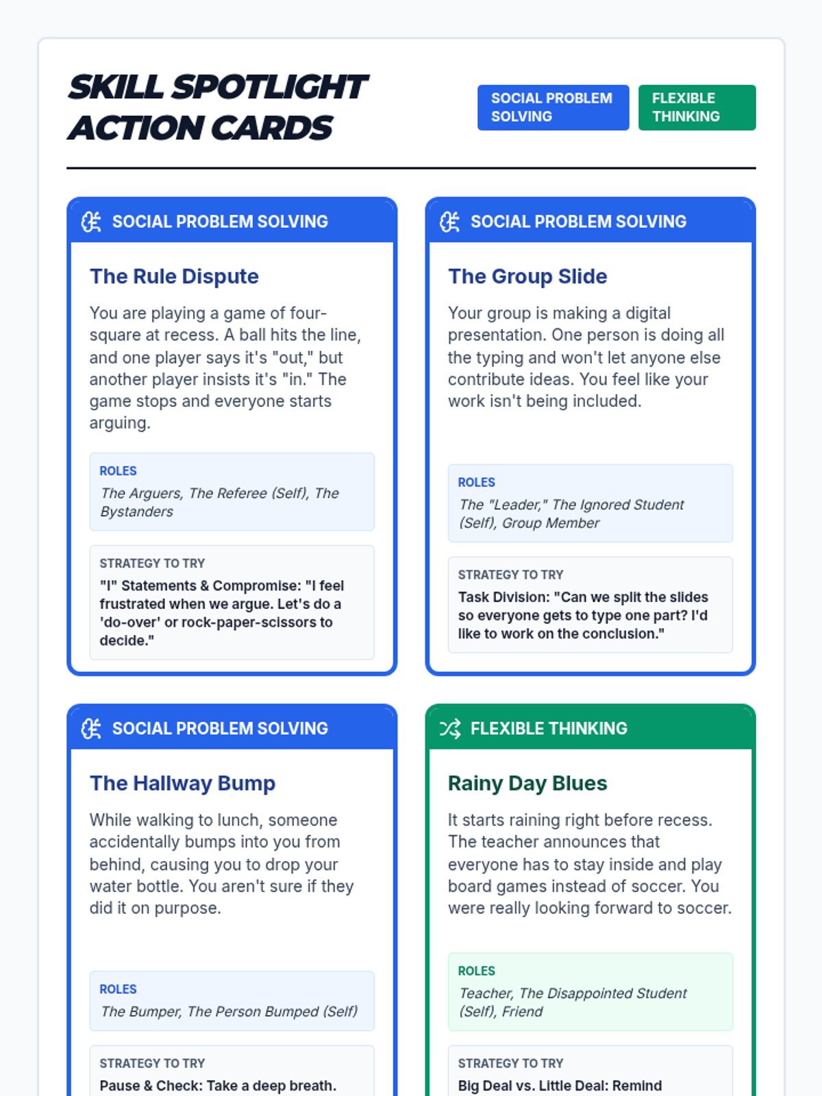A small group intervention lesson focused on developing social problem-solving, flexible thinking, and self-advocacy through structured role-play scenarios.
