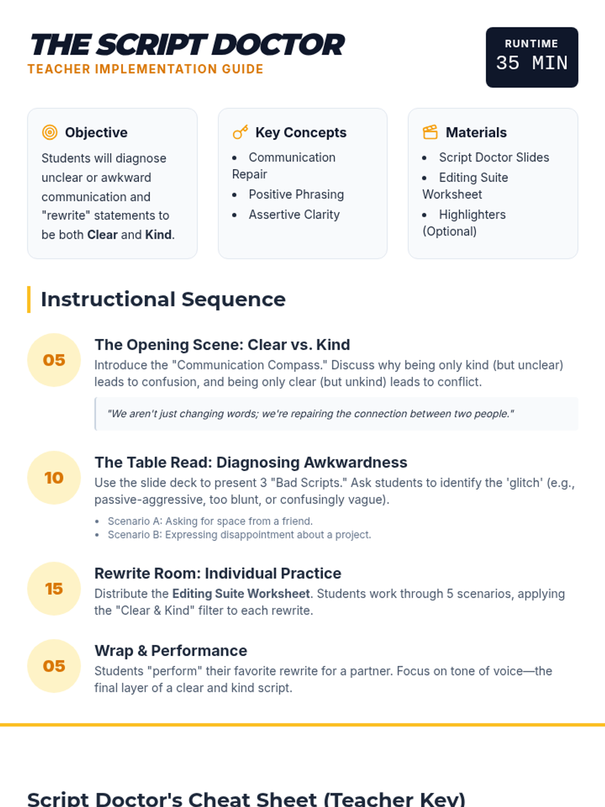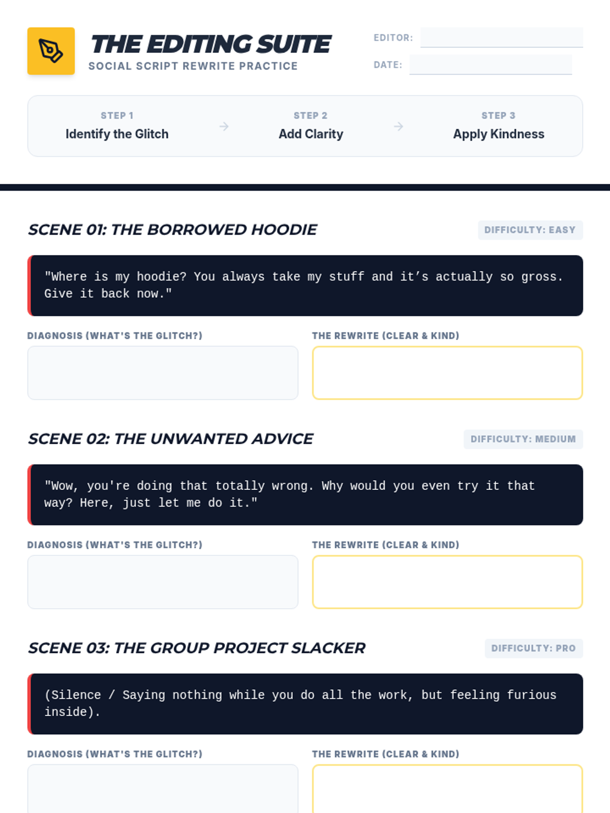 A 35-minute workshop focusing on the art of communication repair. Students learn to identify awkward or unclear 'social scripts' and practice editing them into assertive, clear, and kind statements through collaborative exercises and individual practice.