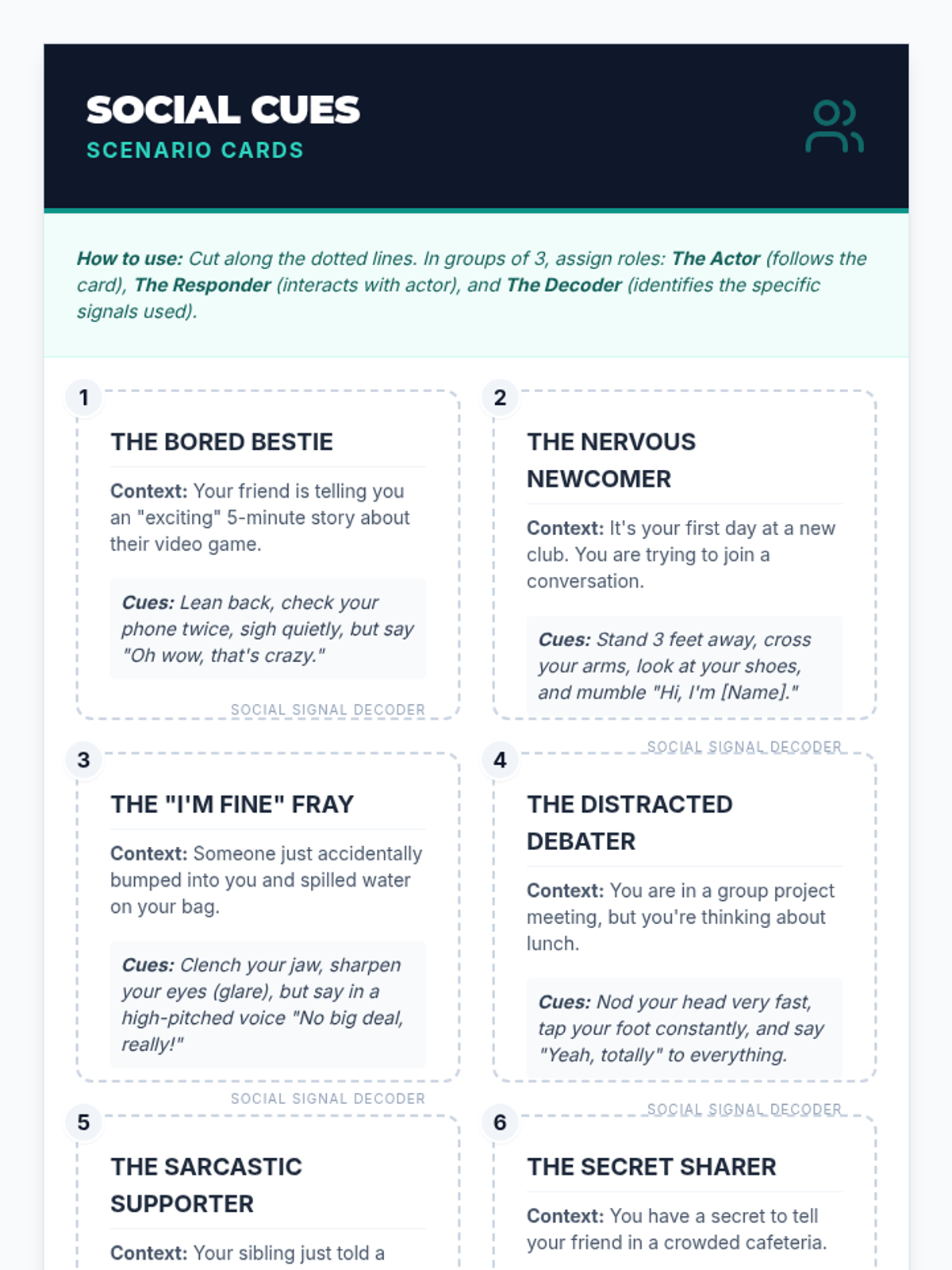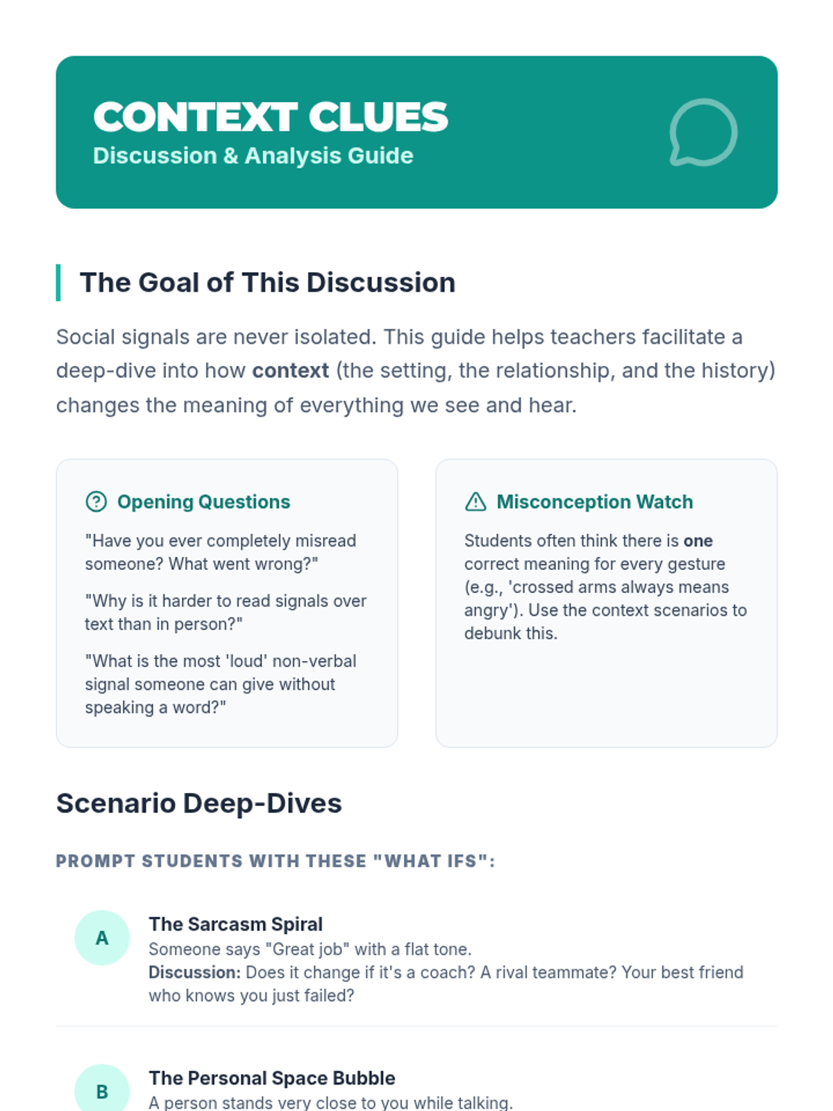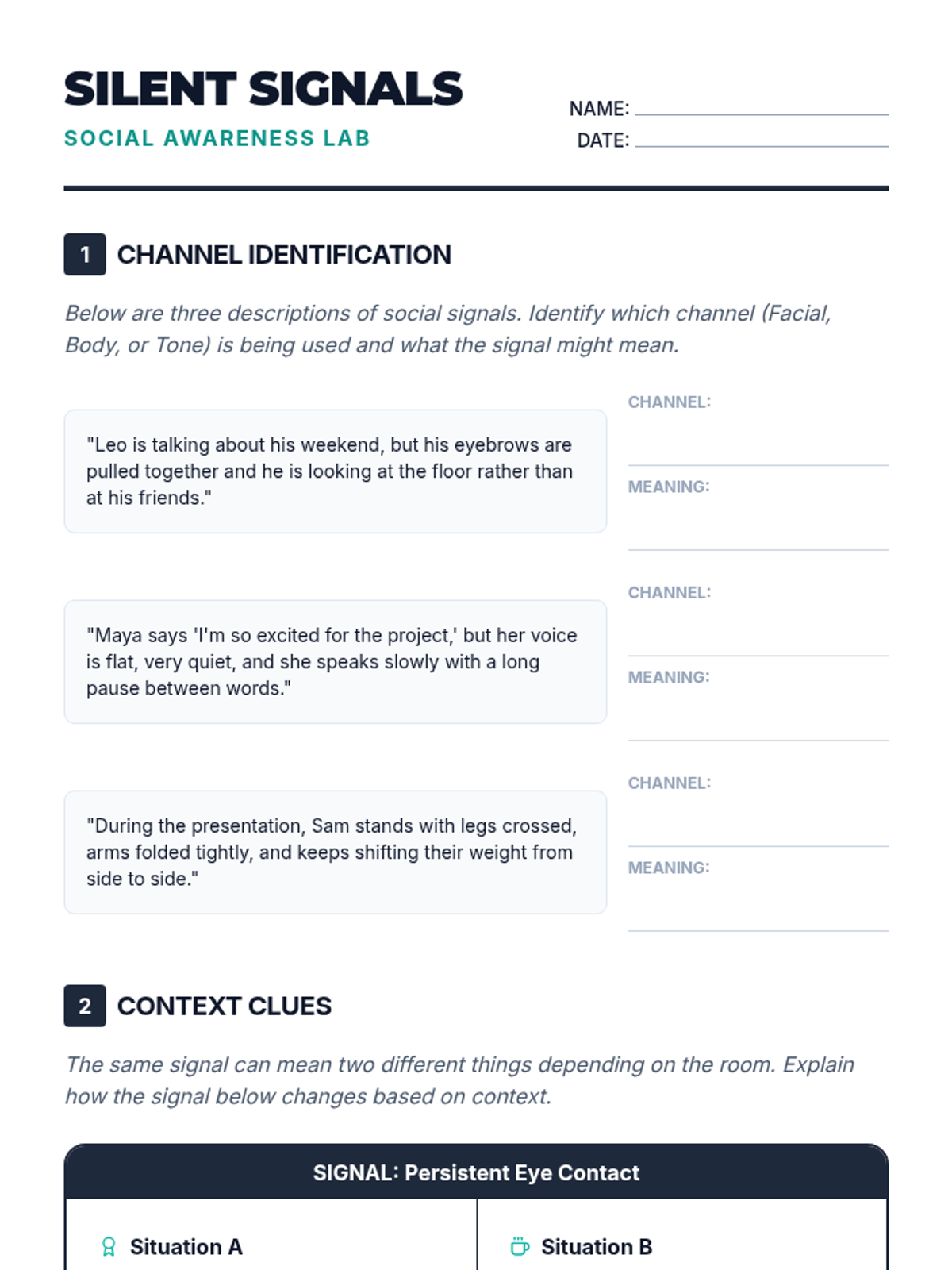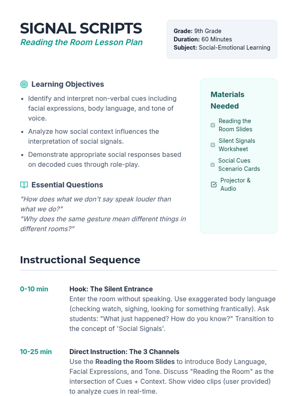 A lesson for 9th graders to improve social awareness by interpreting non-verbal cues like body language, facial expressions, and tone of voice in various social contexts.