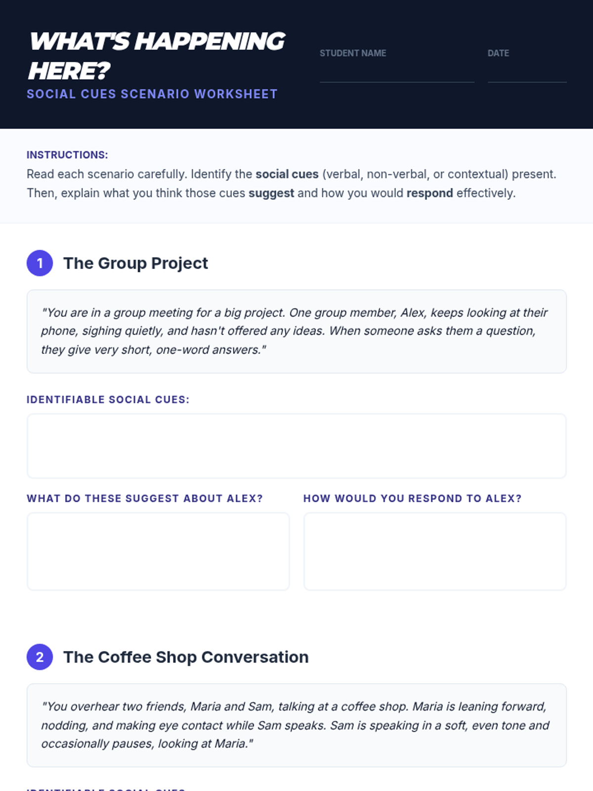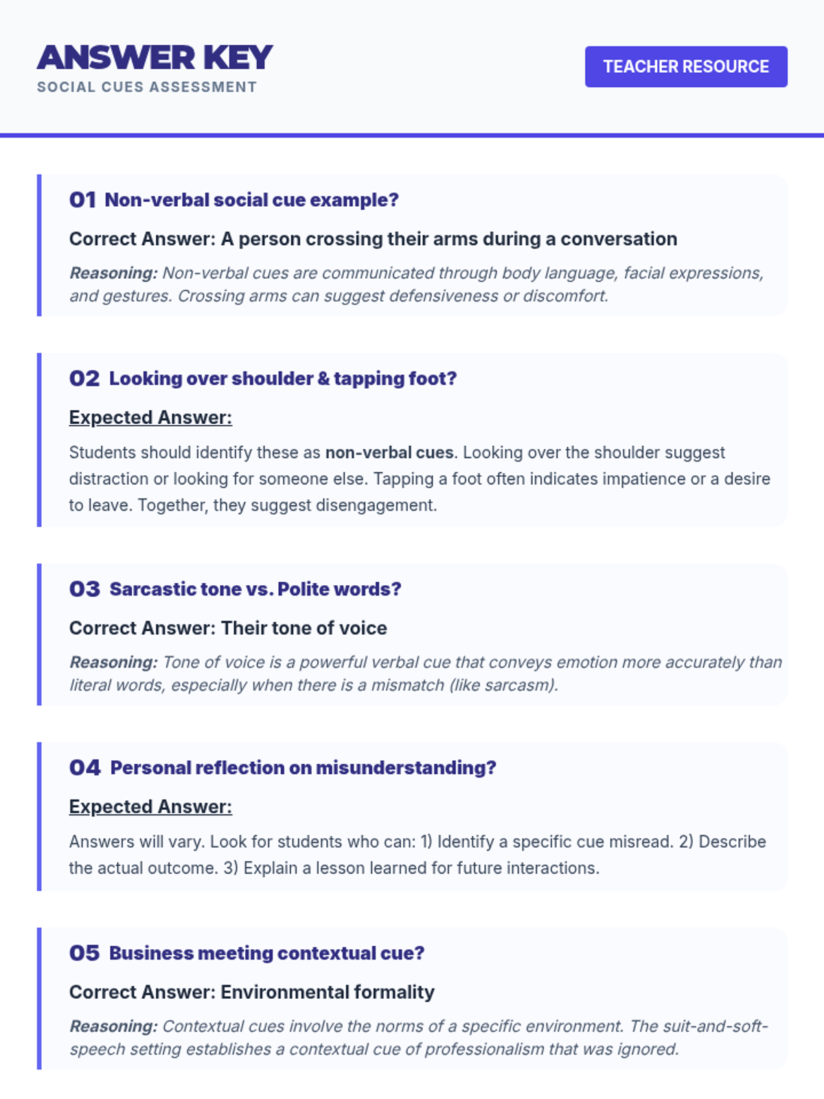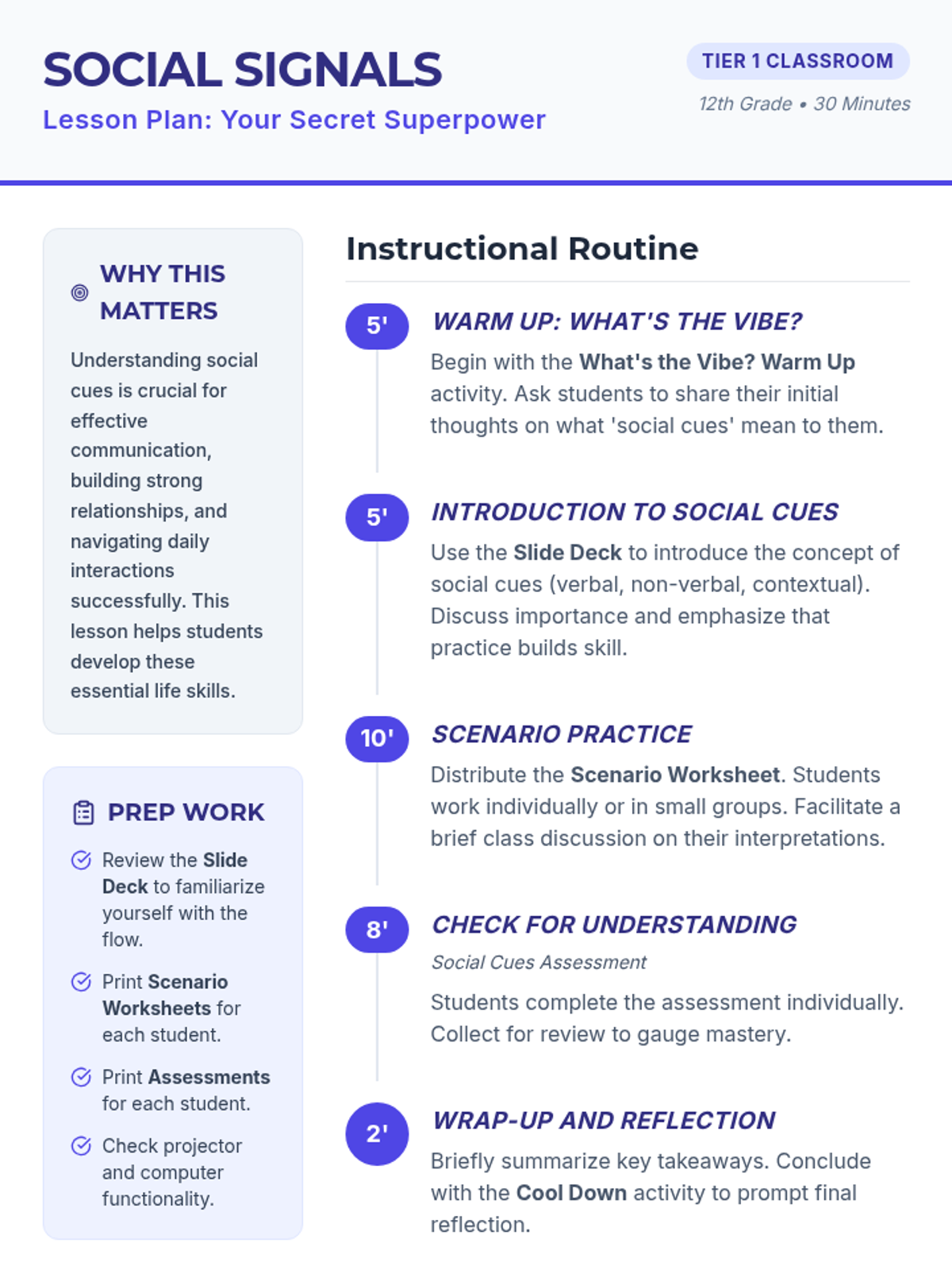 A 30-minute lesson for 12th-grade students on identifying and interpreting social cues (verbal, non-verbal, and contextual) to improve social awareness and communication.
