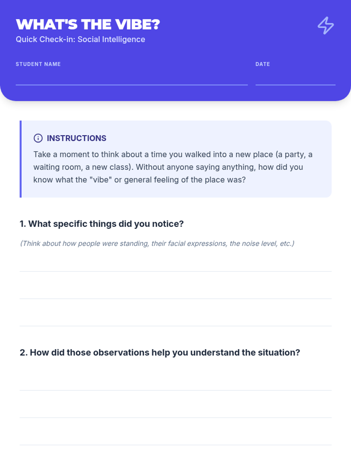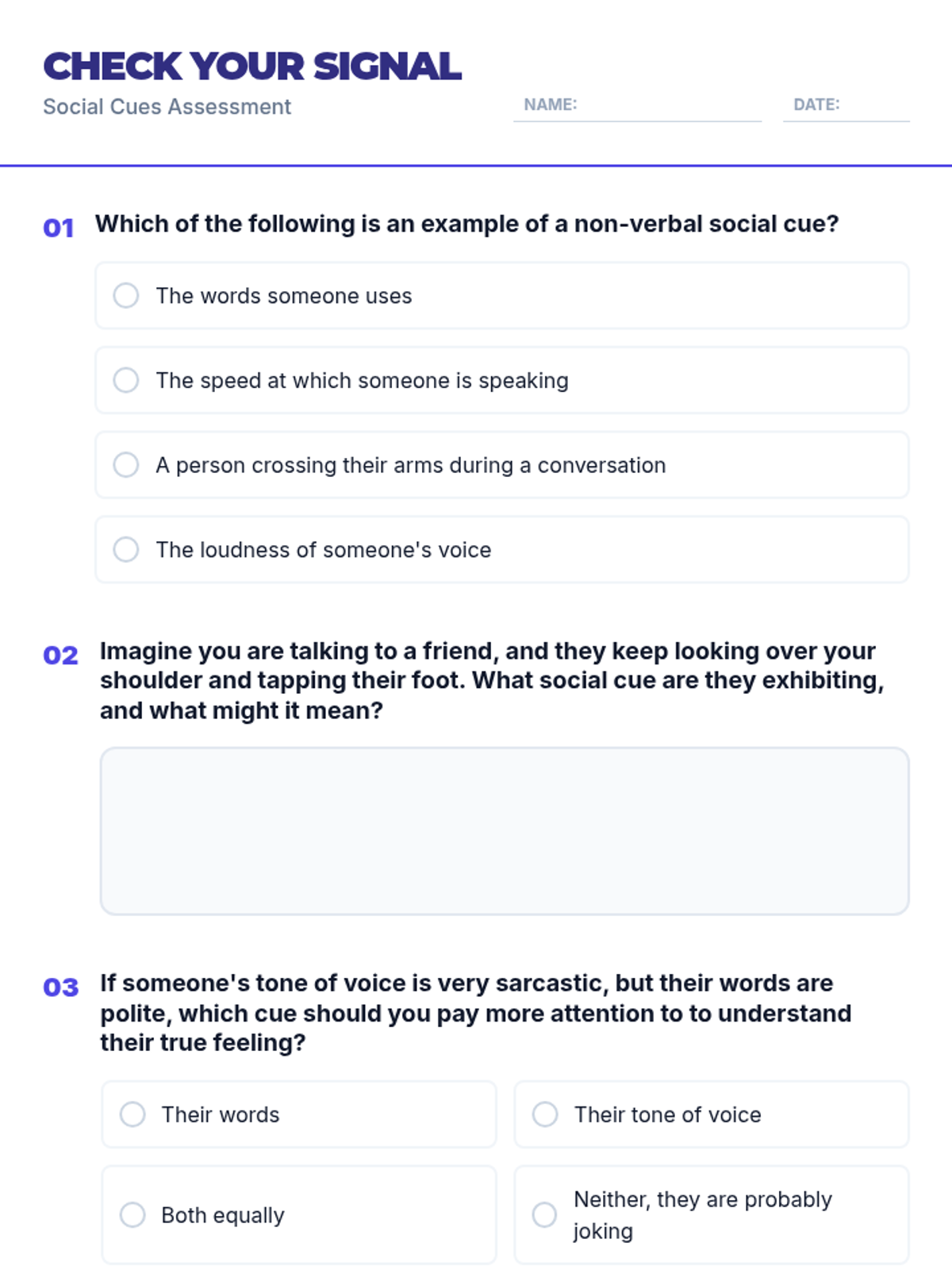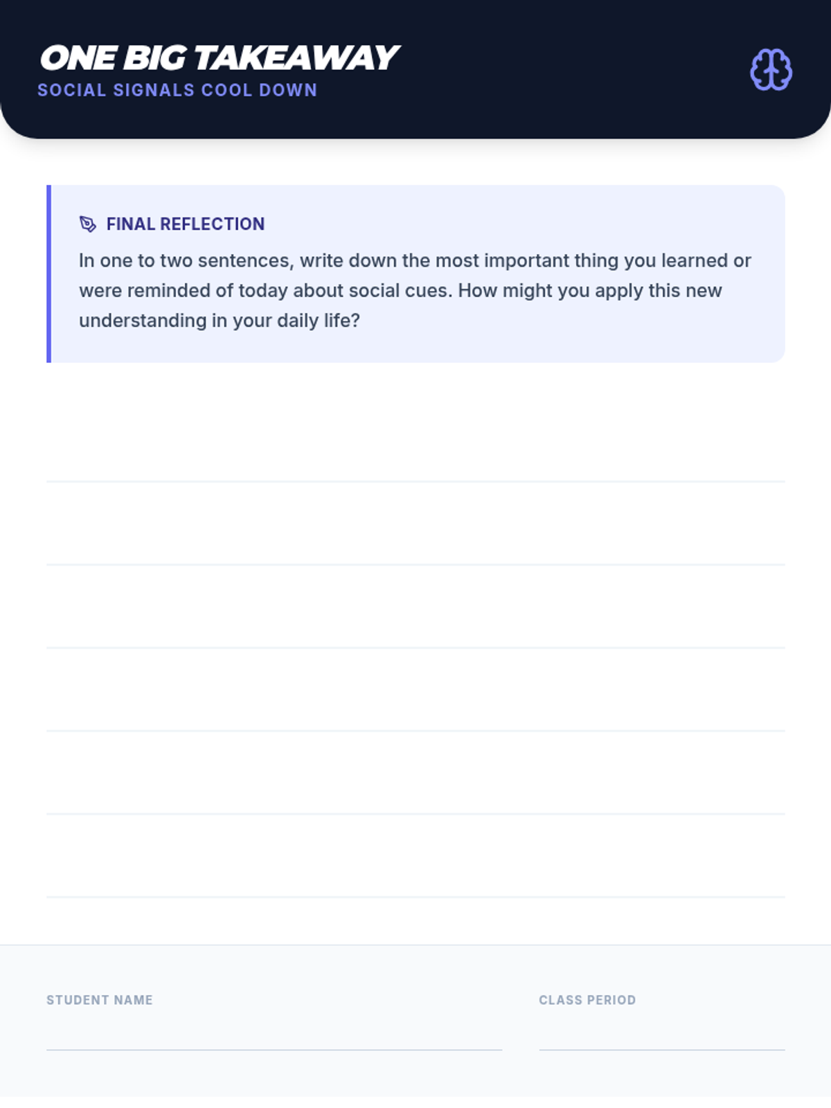 A 30-minute lesson for 12th-grade students on identifying and interpreting social cues (verbal, non-verbal, and contextual) to improve social awareness and communication.