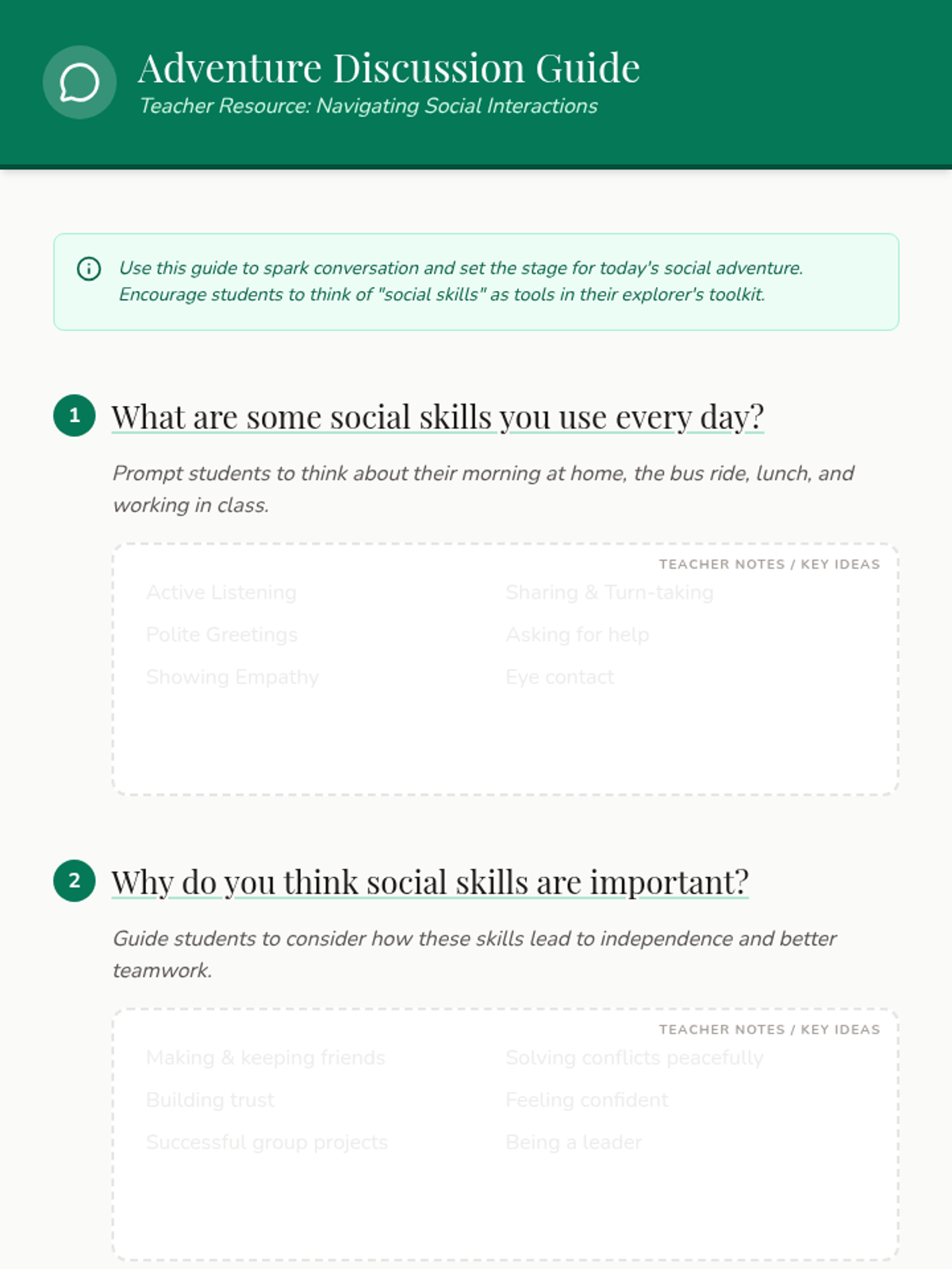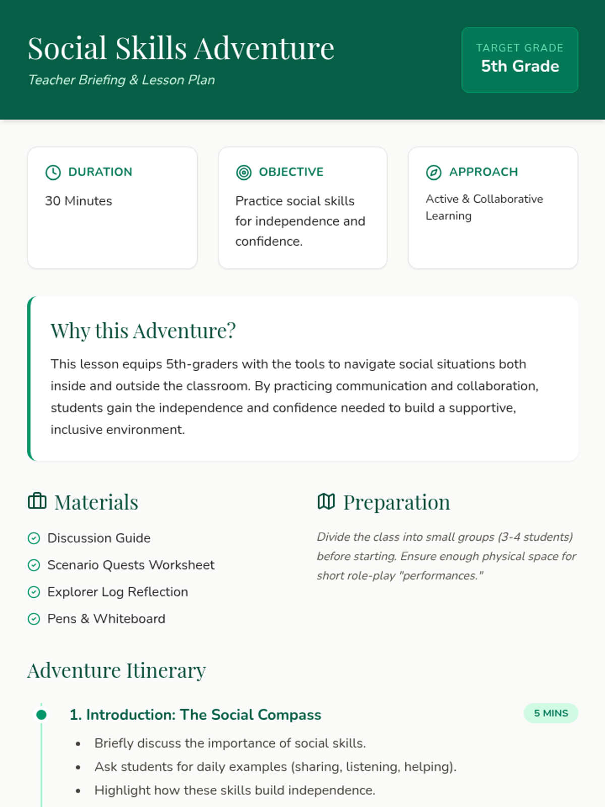 A 5th-grade lesson focusing on essential social skills, communication, and collaboration to foster independence and confidence through role-play and reflection.
