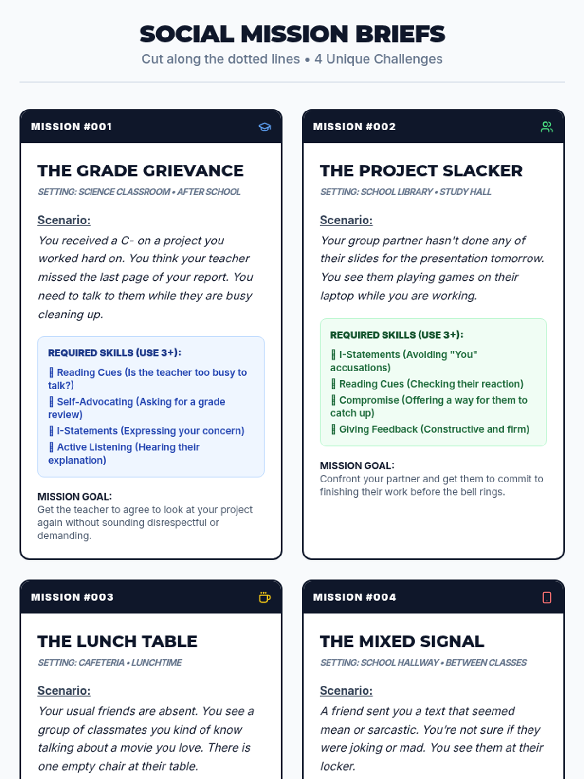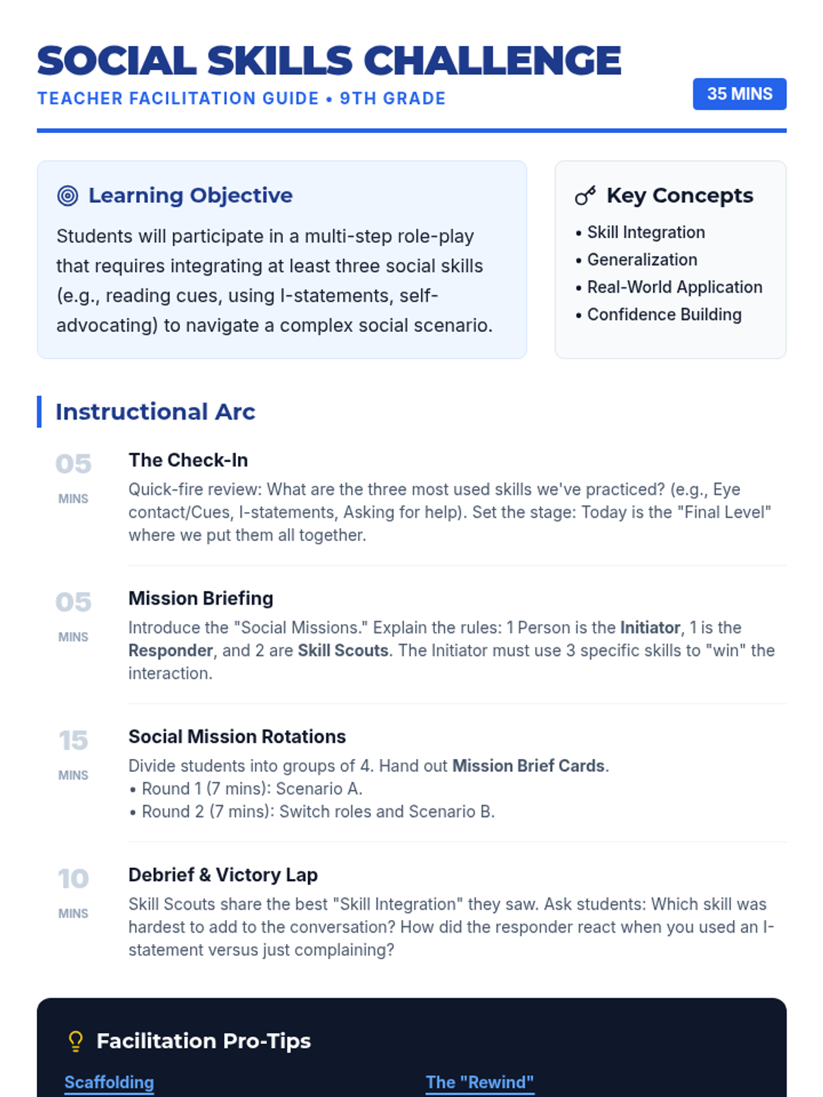A high-energy, 35-minute lesson where 9th graders integrate multiple social skills into complex role-play scenarios. Students practice reading cues, using I-statements, and self-advocating in realistic social missions.