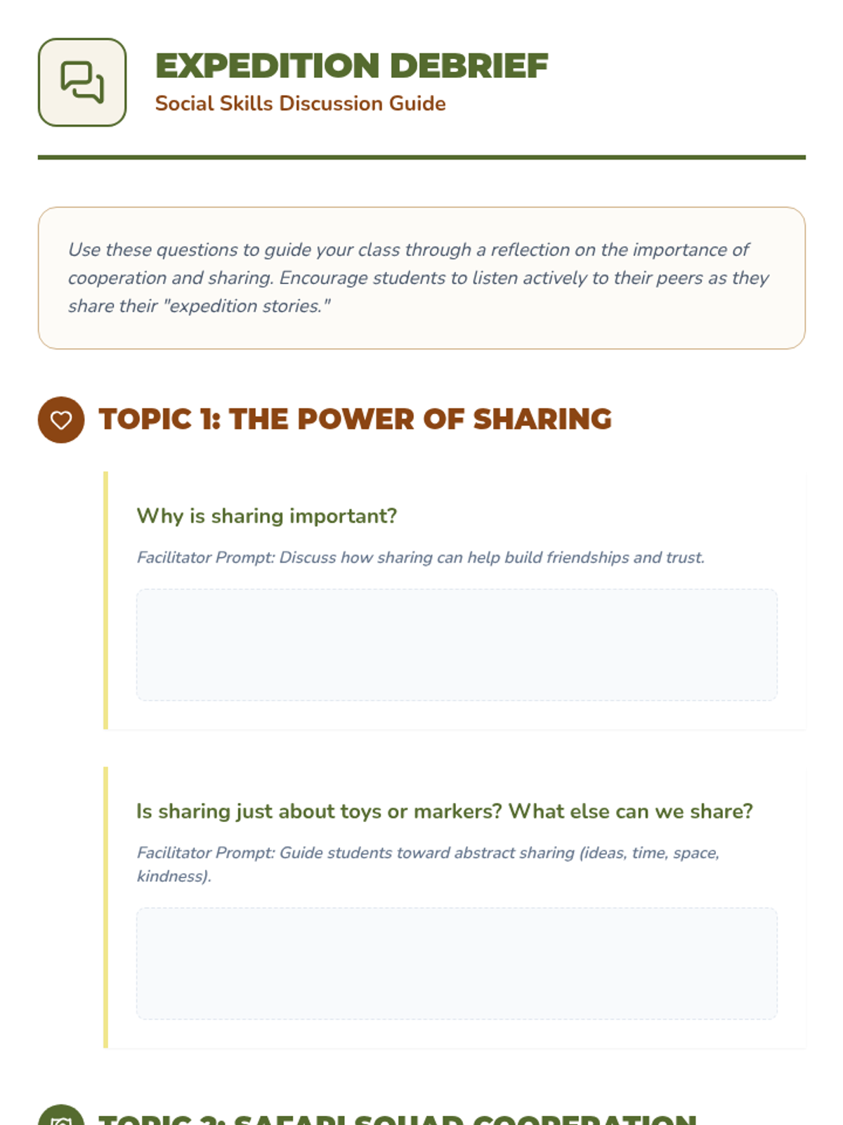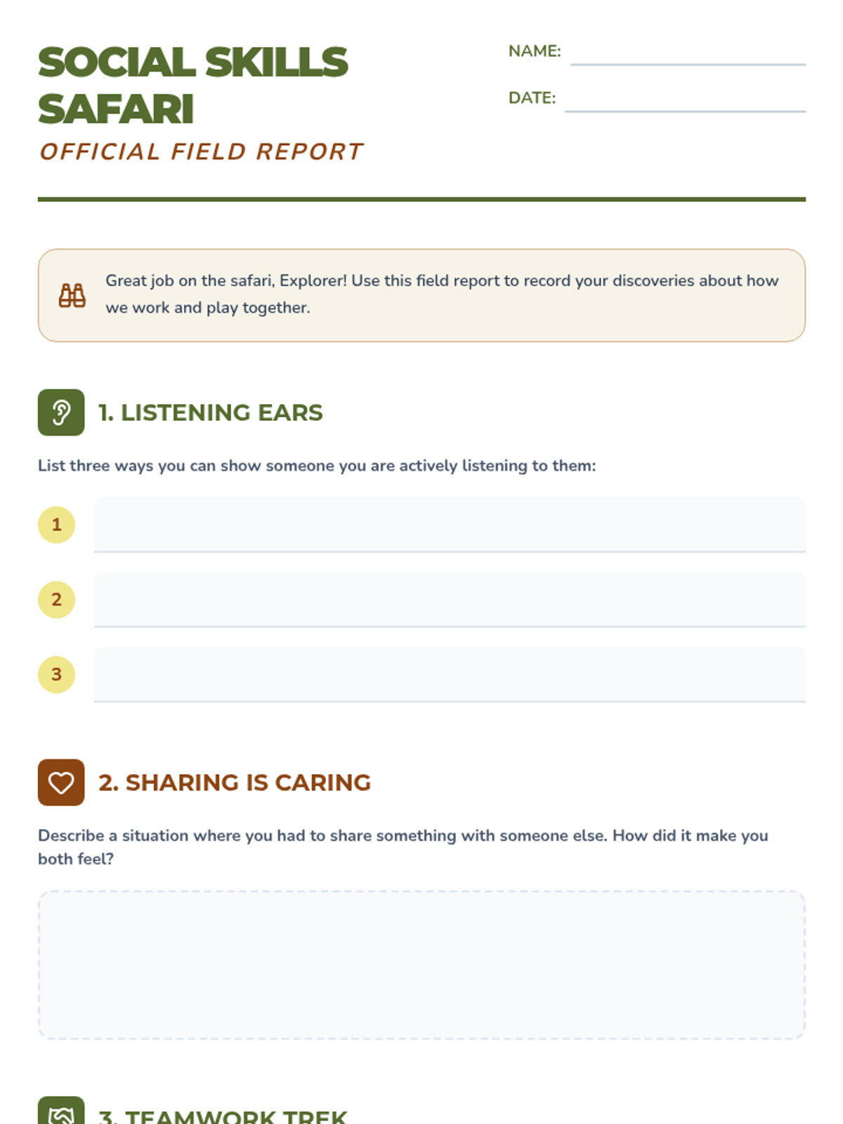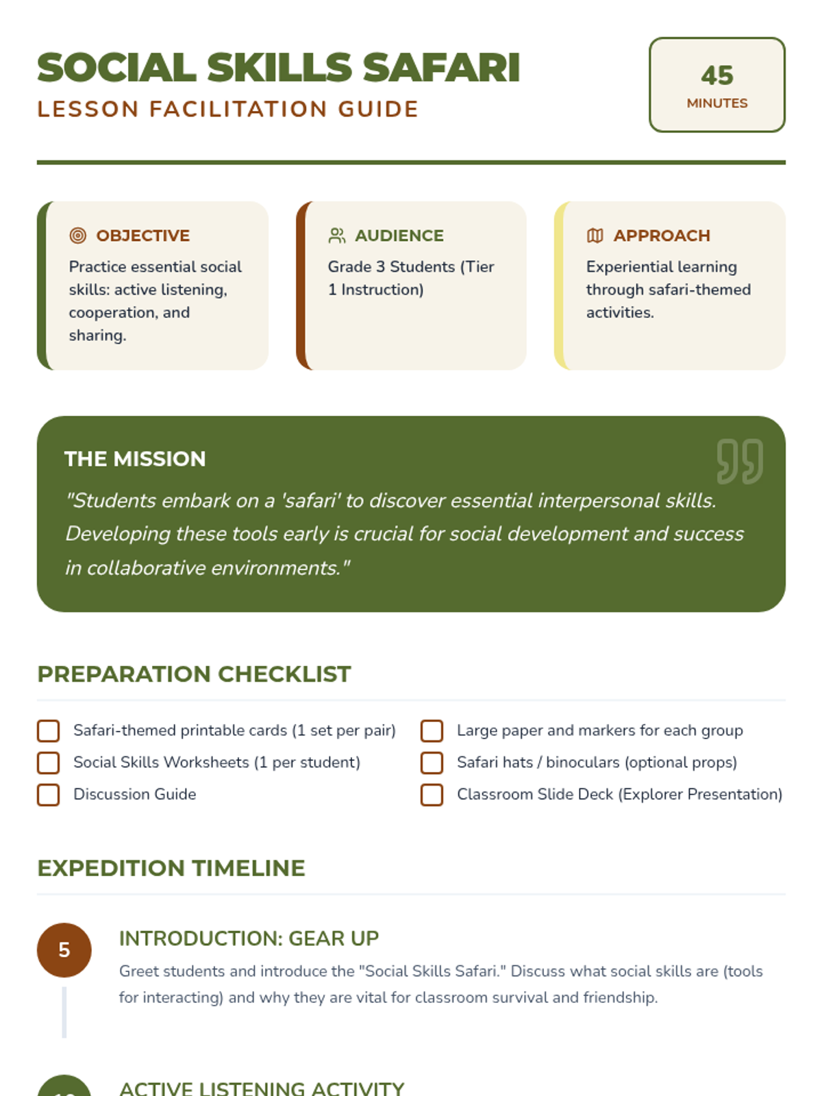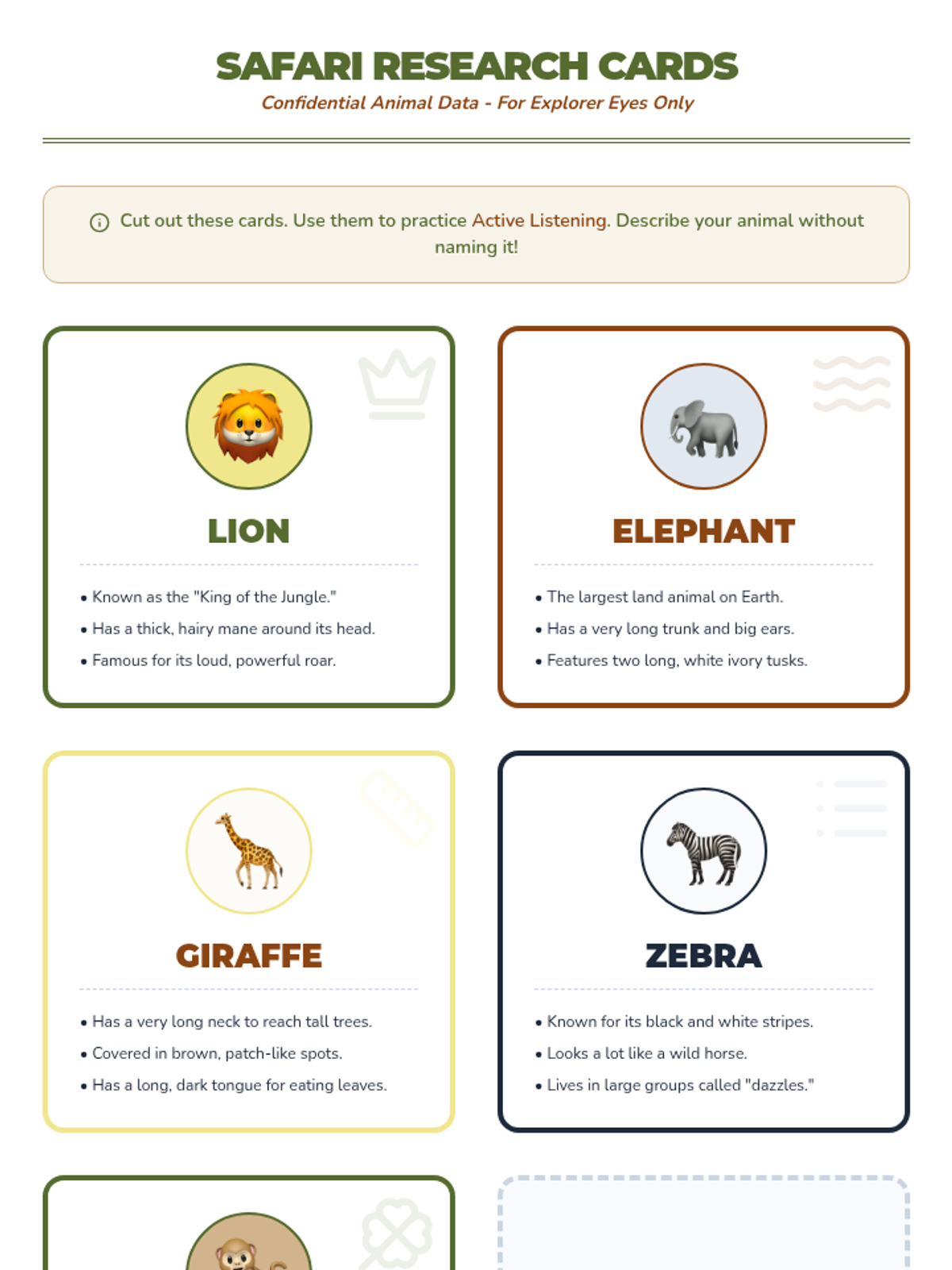 A fun, safari-themed lesson for Grade 3 students to practice active listening, cooperation, and sharing through interactive group activities and discussions.
