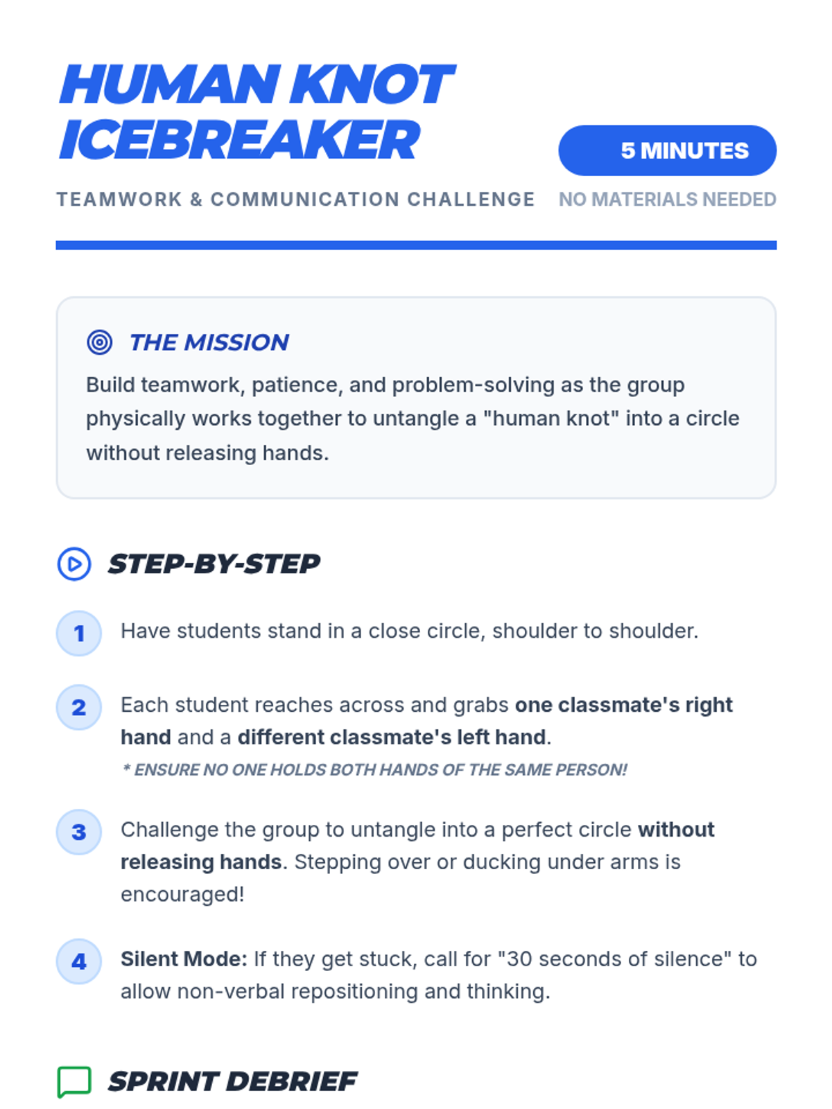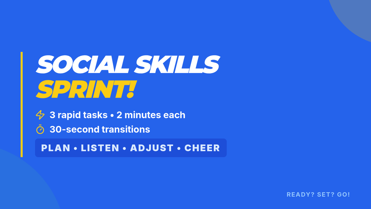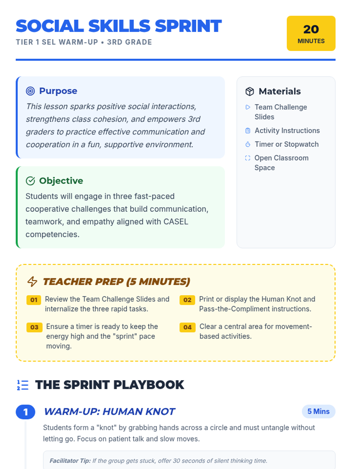A fast-paced SEL warm-up for 3rd graders that builds communication and cooperation through timed teamwork challenges and positive reflection.