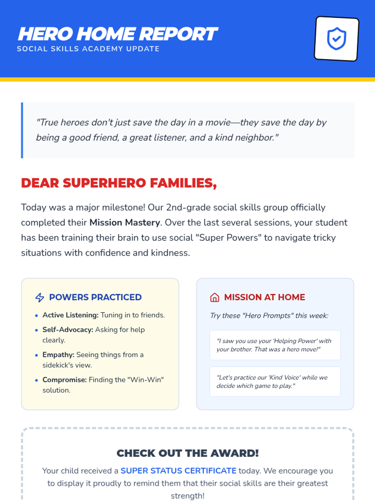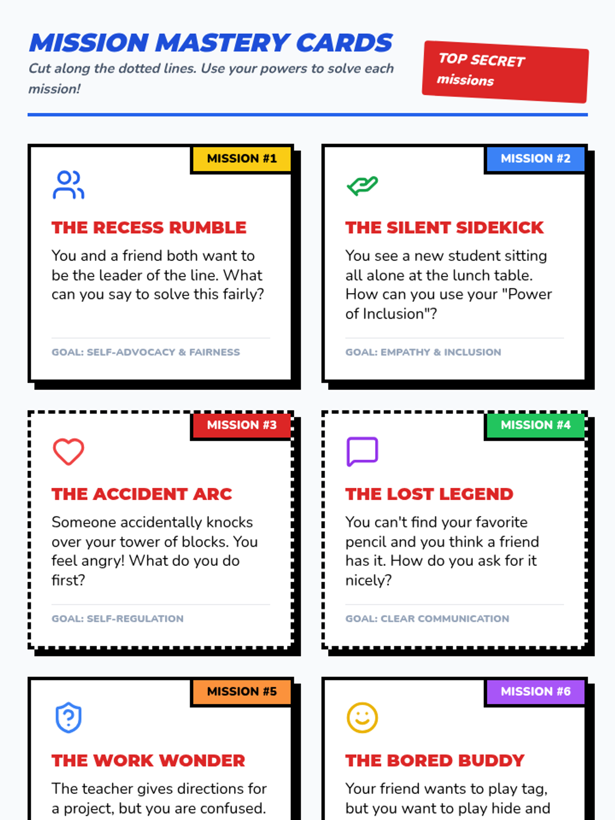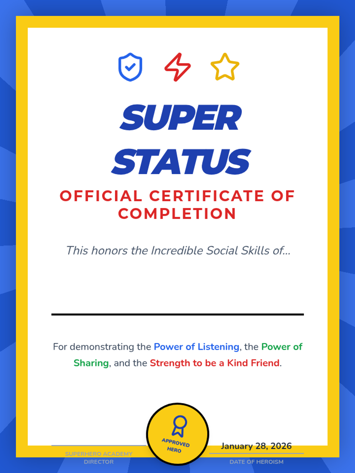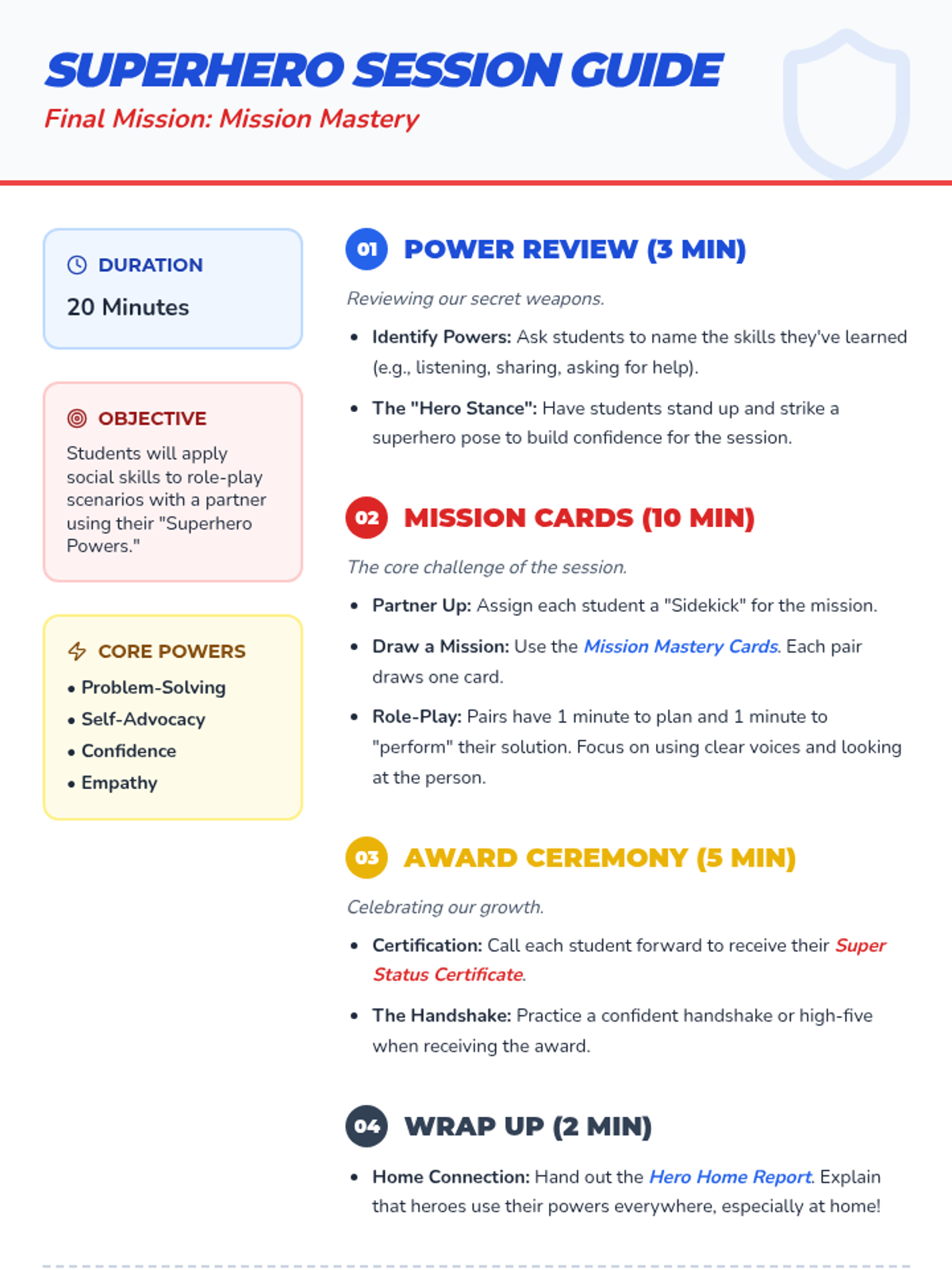 A high-energy, superhero-themed finale to a social skills group where 2nd grade students demonstrate their problem-solving and self-advocacy powers through role-play missions.