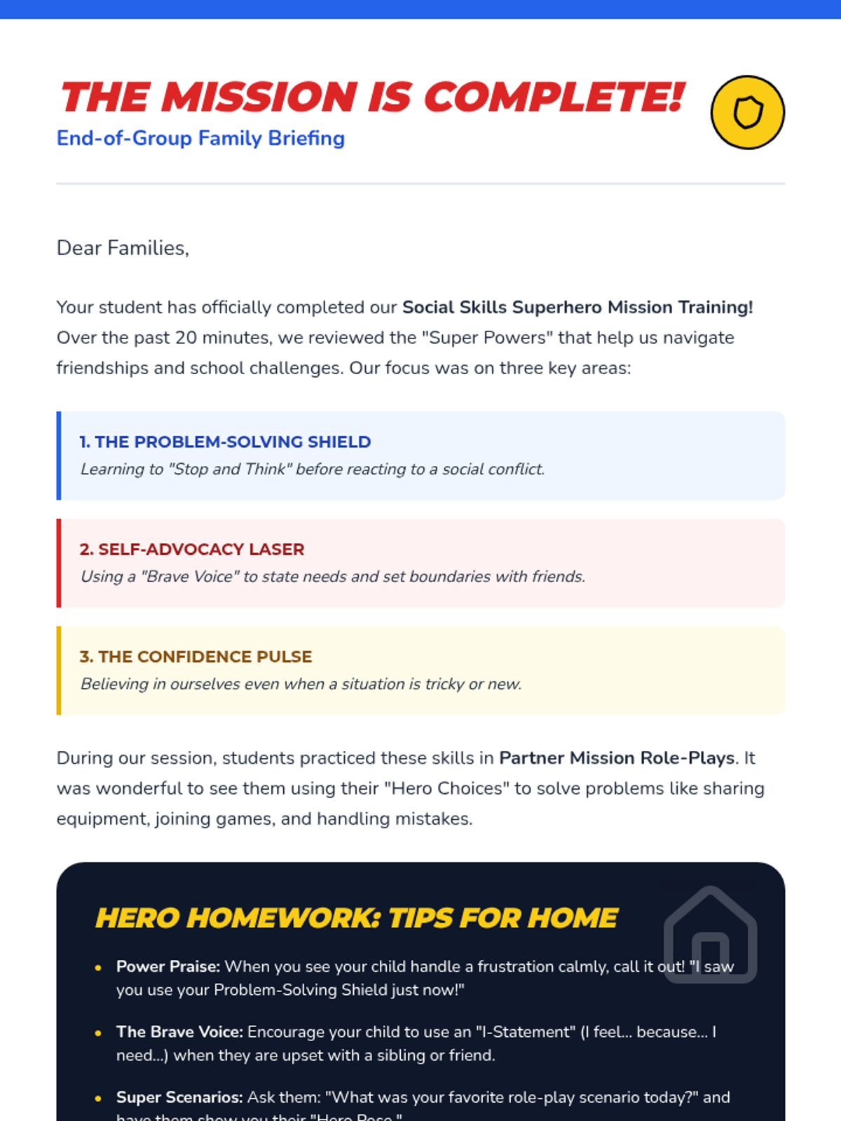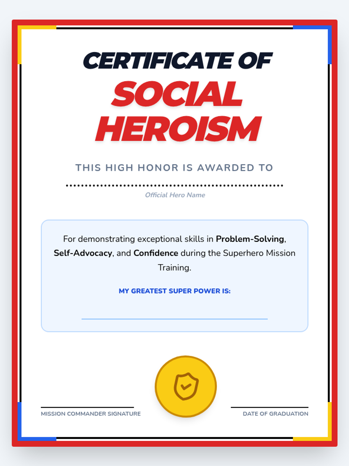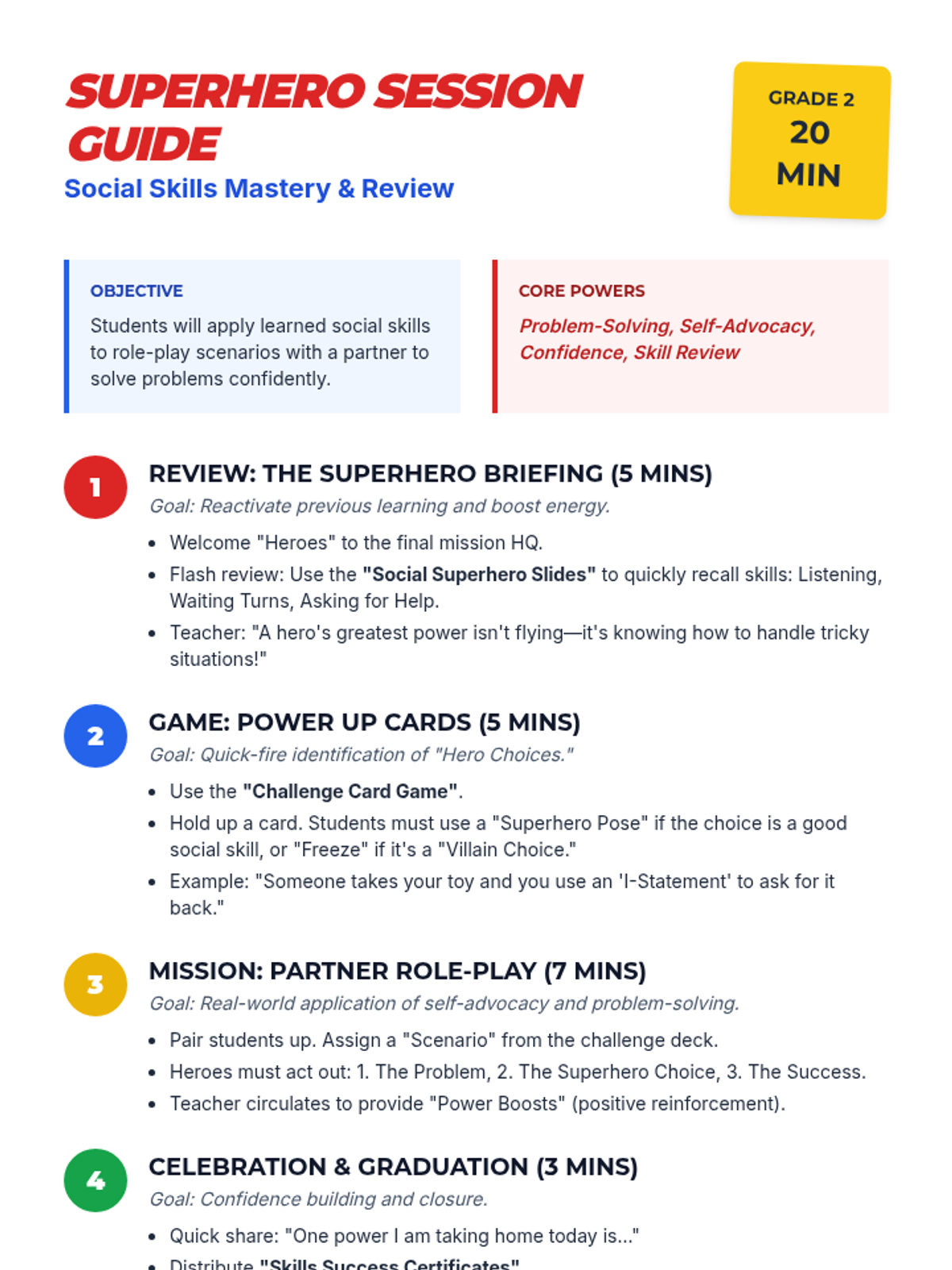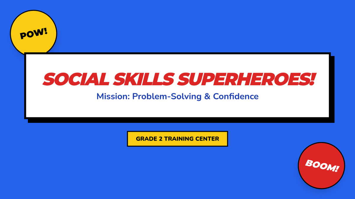 A 2nd-grade social skills lesson using a superhero theme to review key concepts like problem-solving, self-advocacy, and confidence through role-play and collaborative games.