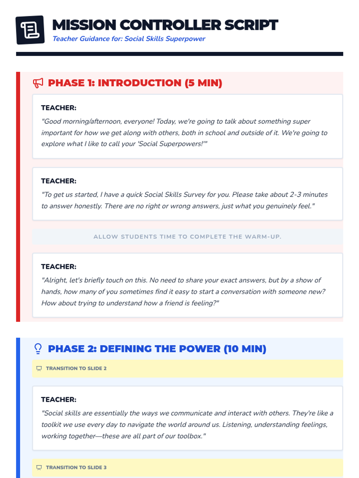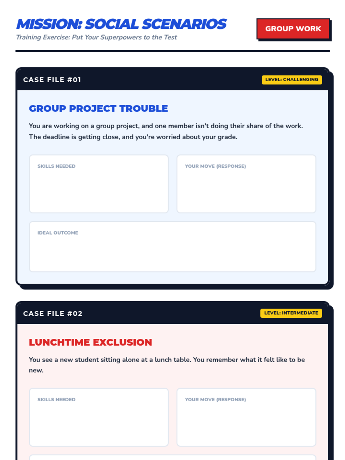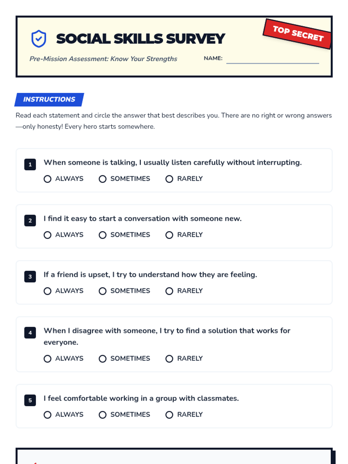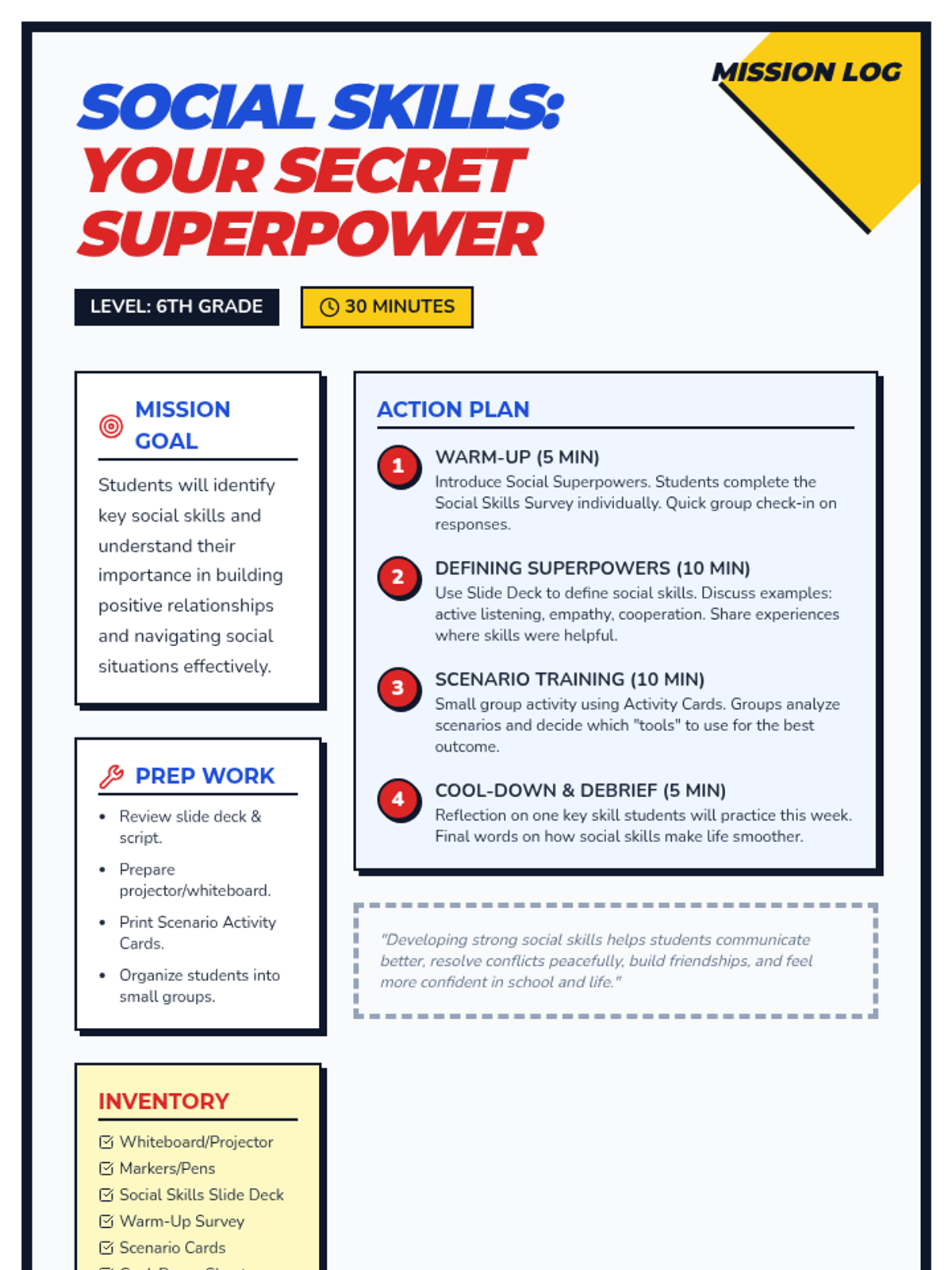 A 30-minute Tier 1 lesson for 6th graders to identify and practice essential social skills like active listening, empathy, and conflict resolution using a superhero theme.