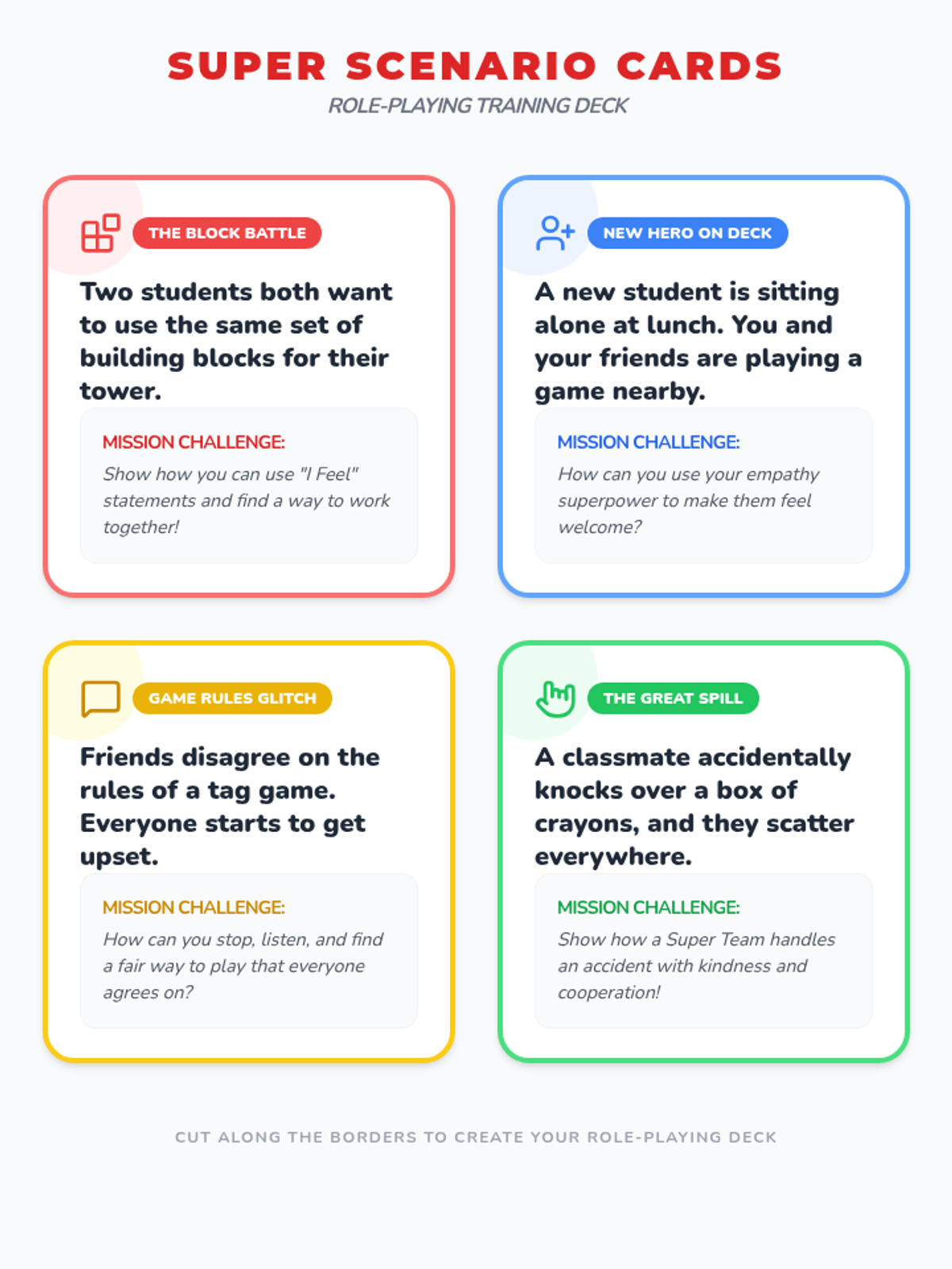 Students explore core leadership qualities through the lens of superheroes, identifying their own unique leadership 'superpowers' and learning how to lead with empathy, courage, and teamwork.