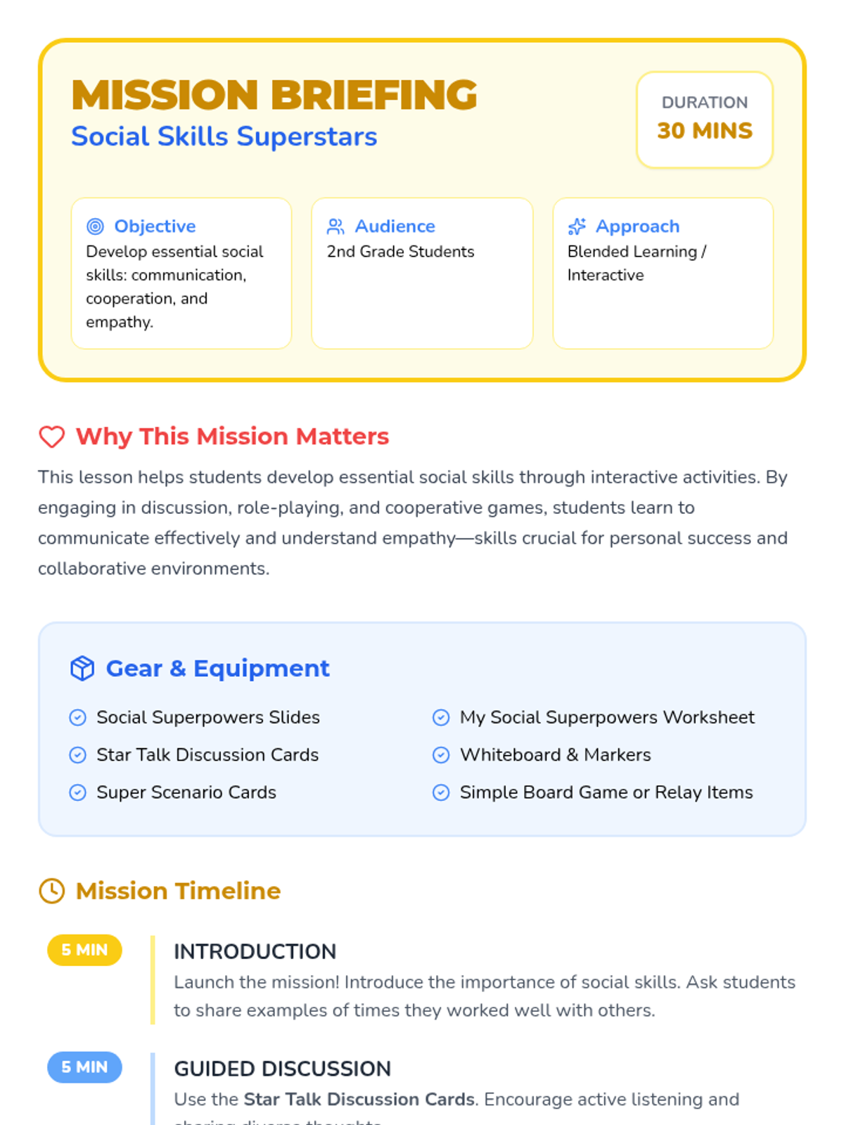 A 30-minute interactive lesson for 2nd graders to develop communication, cooperation, and empathy through role-playing, games, and reflection.