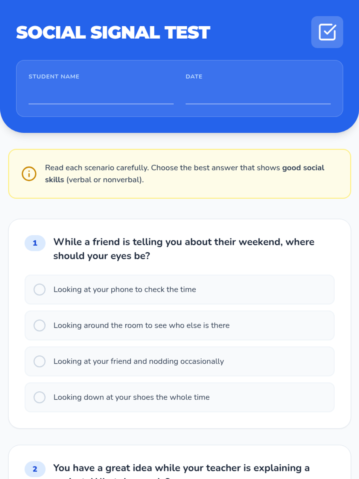 A lesson exploring the nuances of verbal and nonverbal social skills to help students navigate social interactions with confidence and empathy.