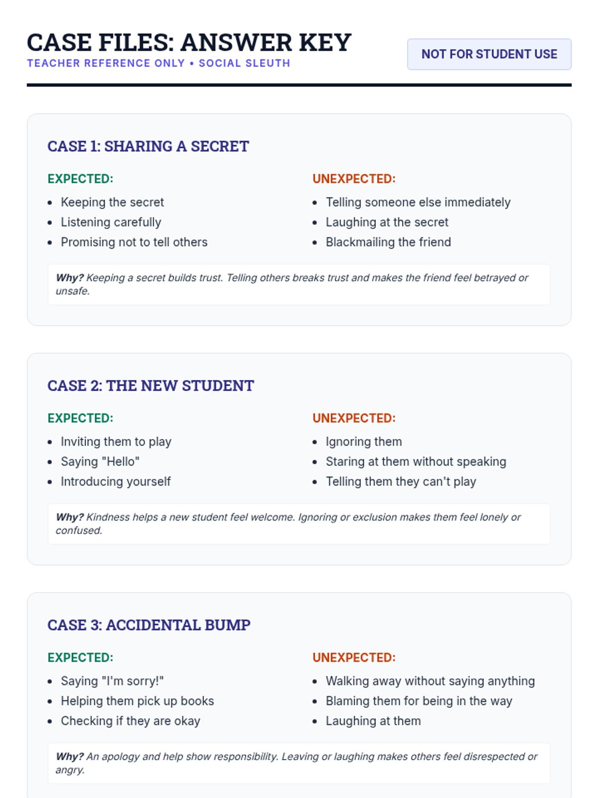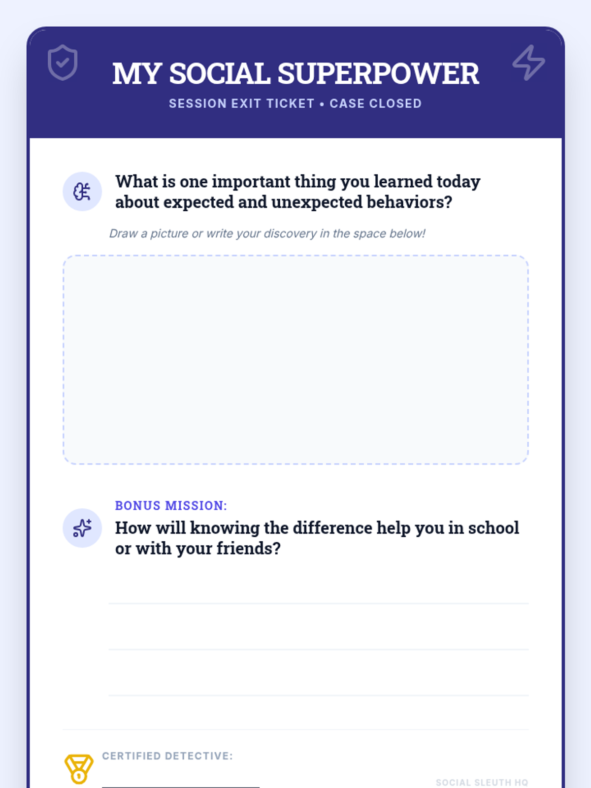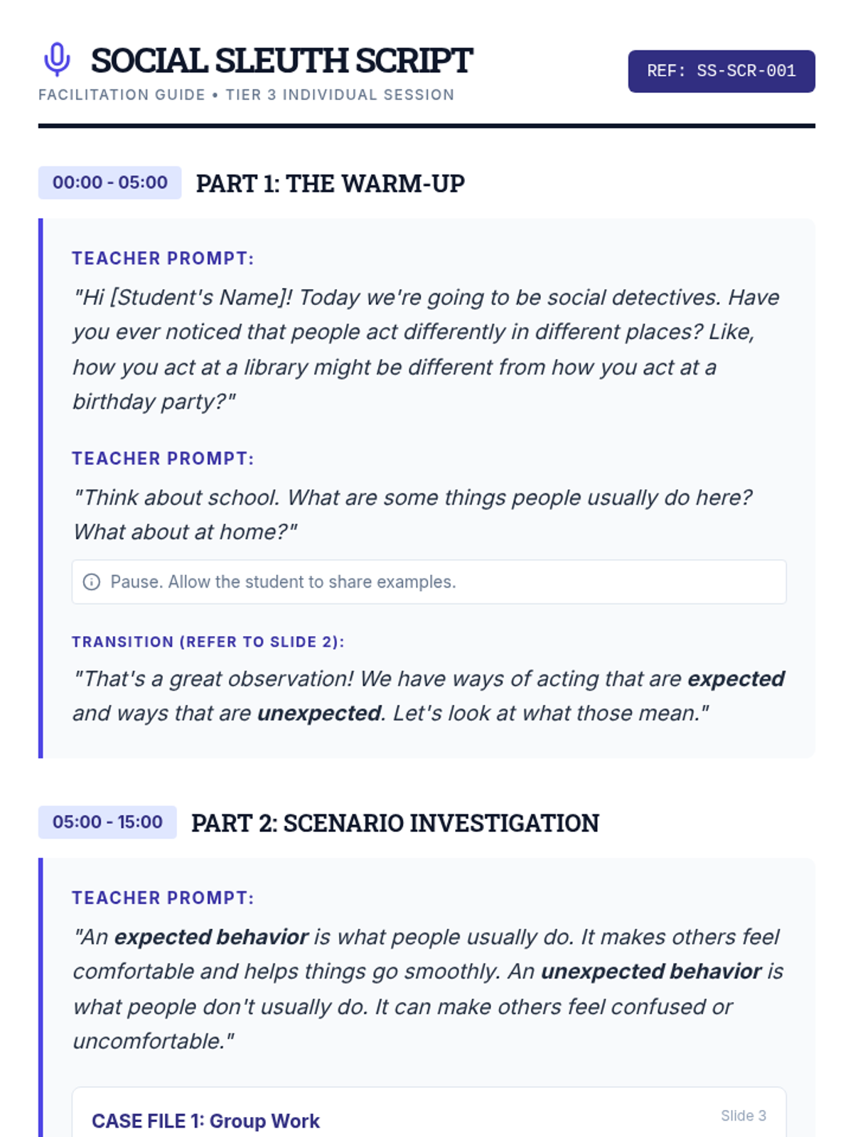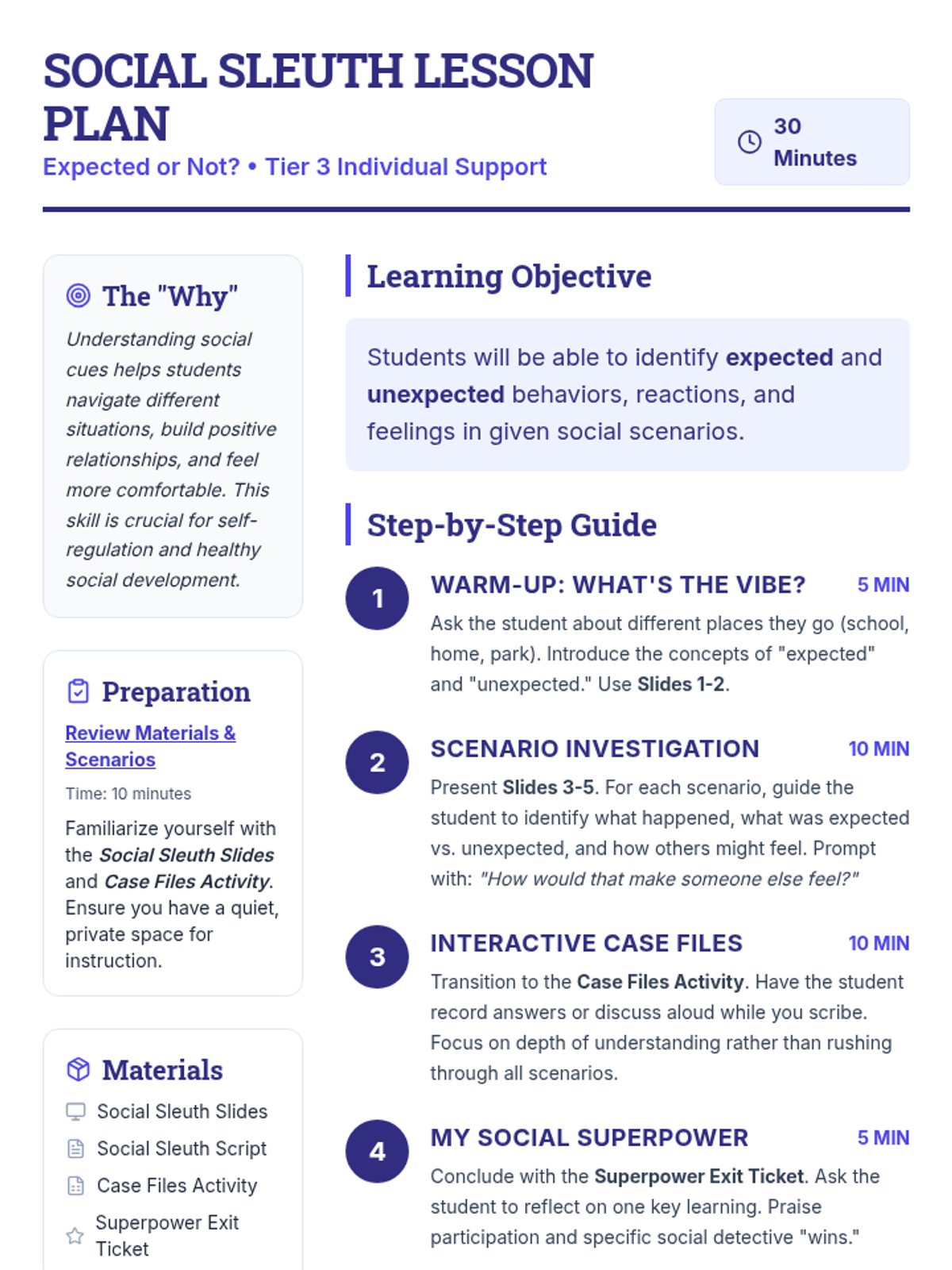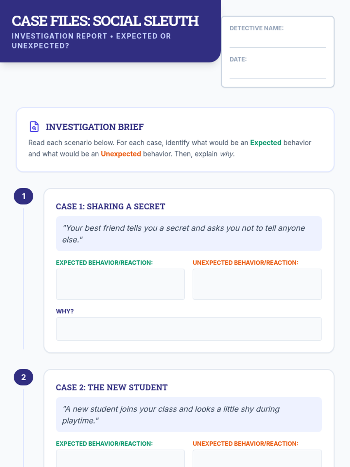 This 30-minute Tier 3 lesson helps individual 4th-grade students understand and distinguish between expected and unexpected behaviors, reactions, and feelings in various social scenarios. It focuses on building social awareness and self-regulation skills through detective-themed investigation.