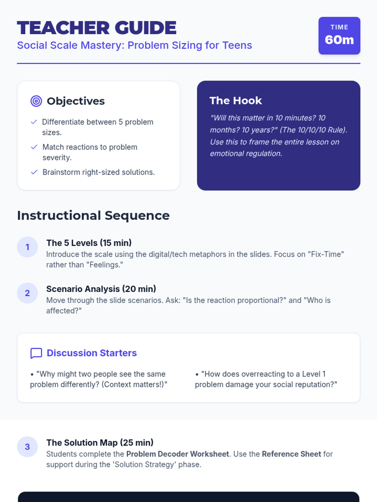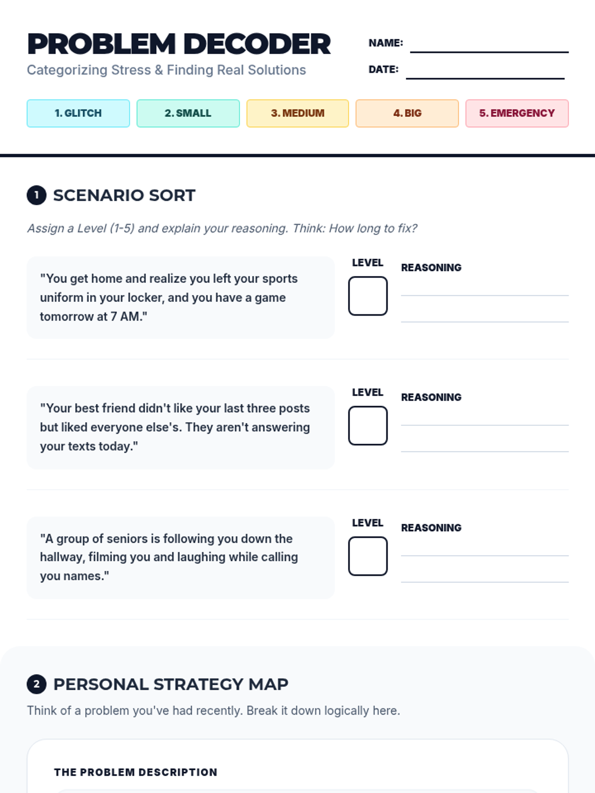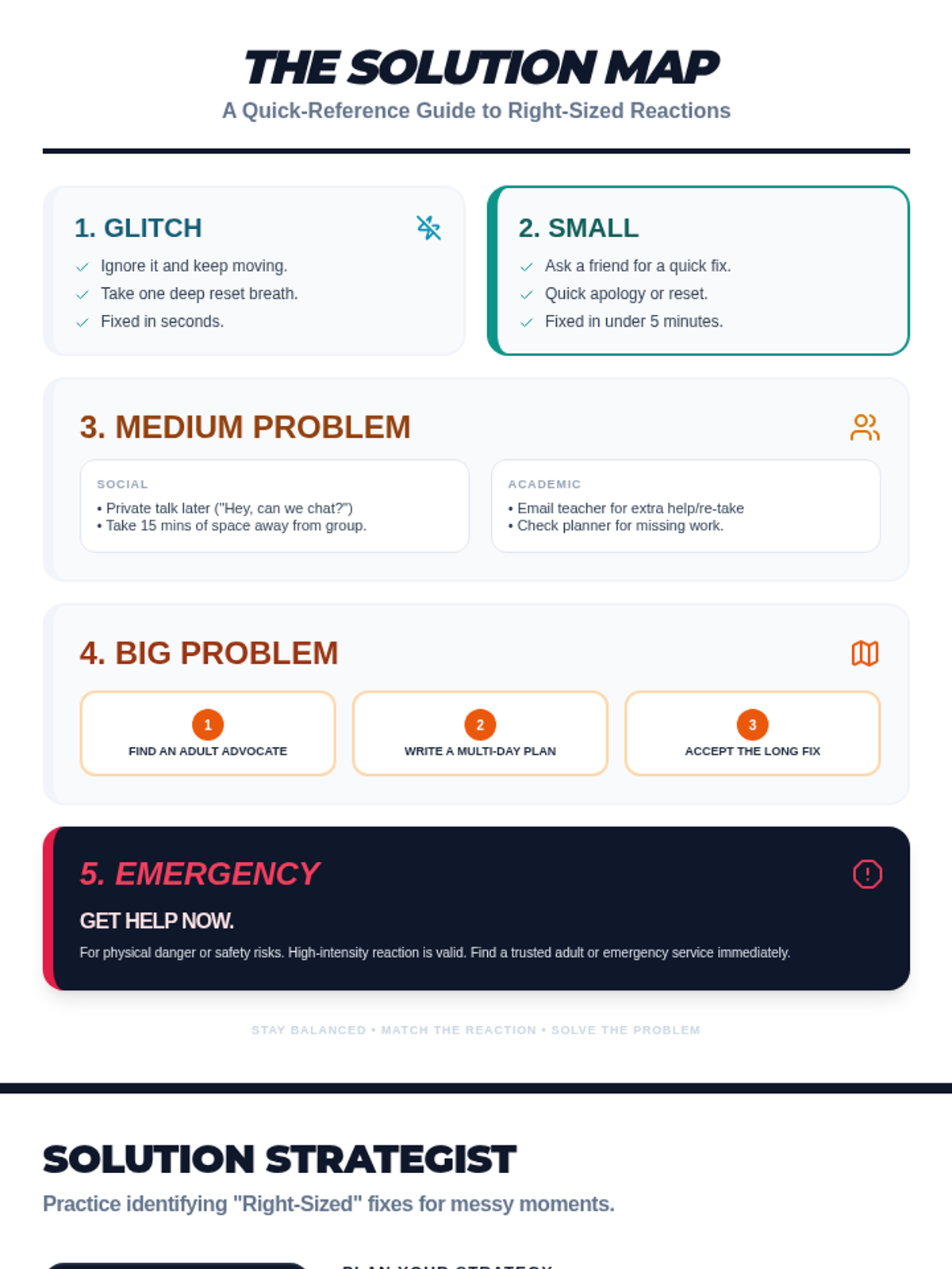 A comprehensive lesson for teenagers to categorize the 'size' of life's problems and match them with appropriate emotional reactions and practical solutions in school and social settings.